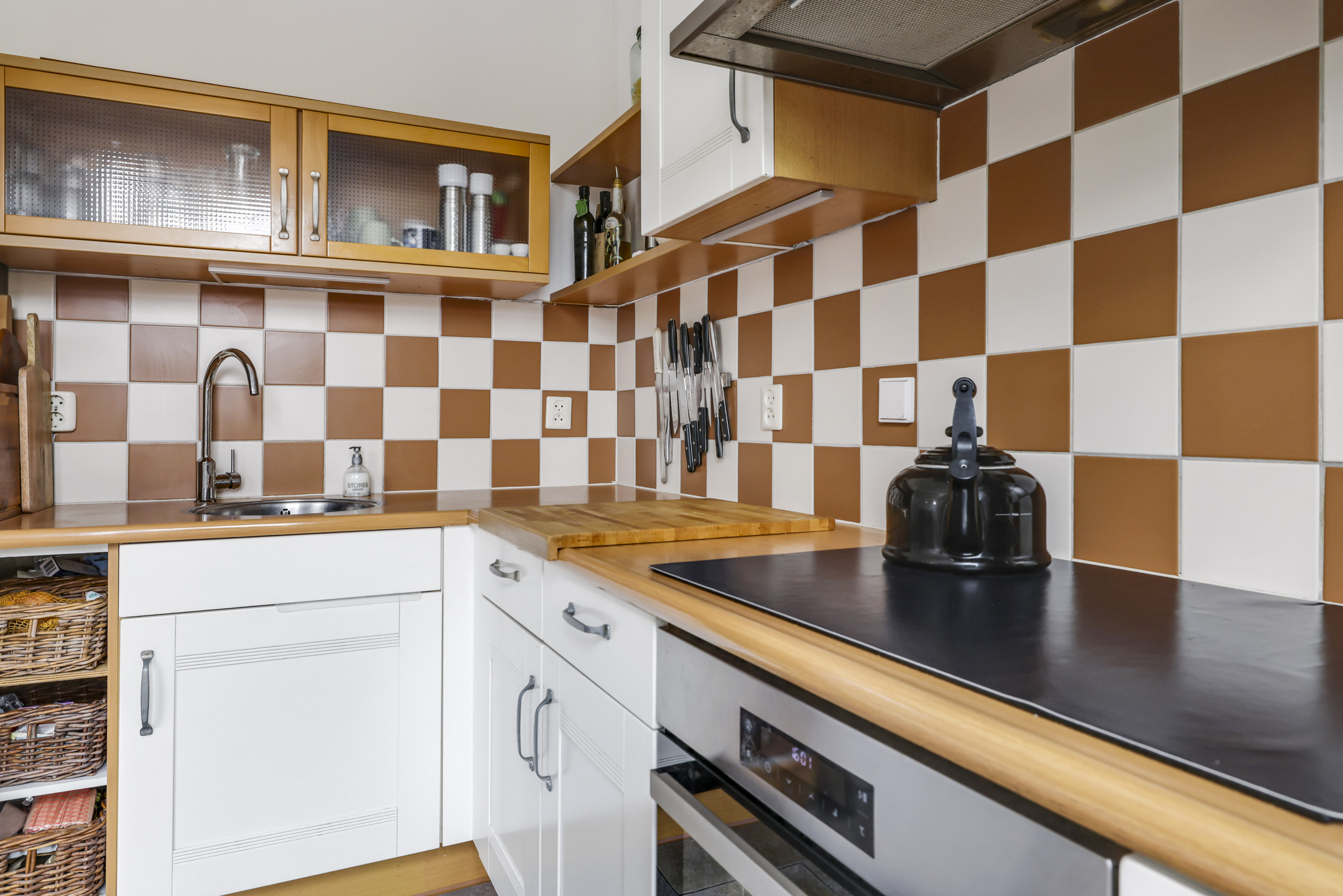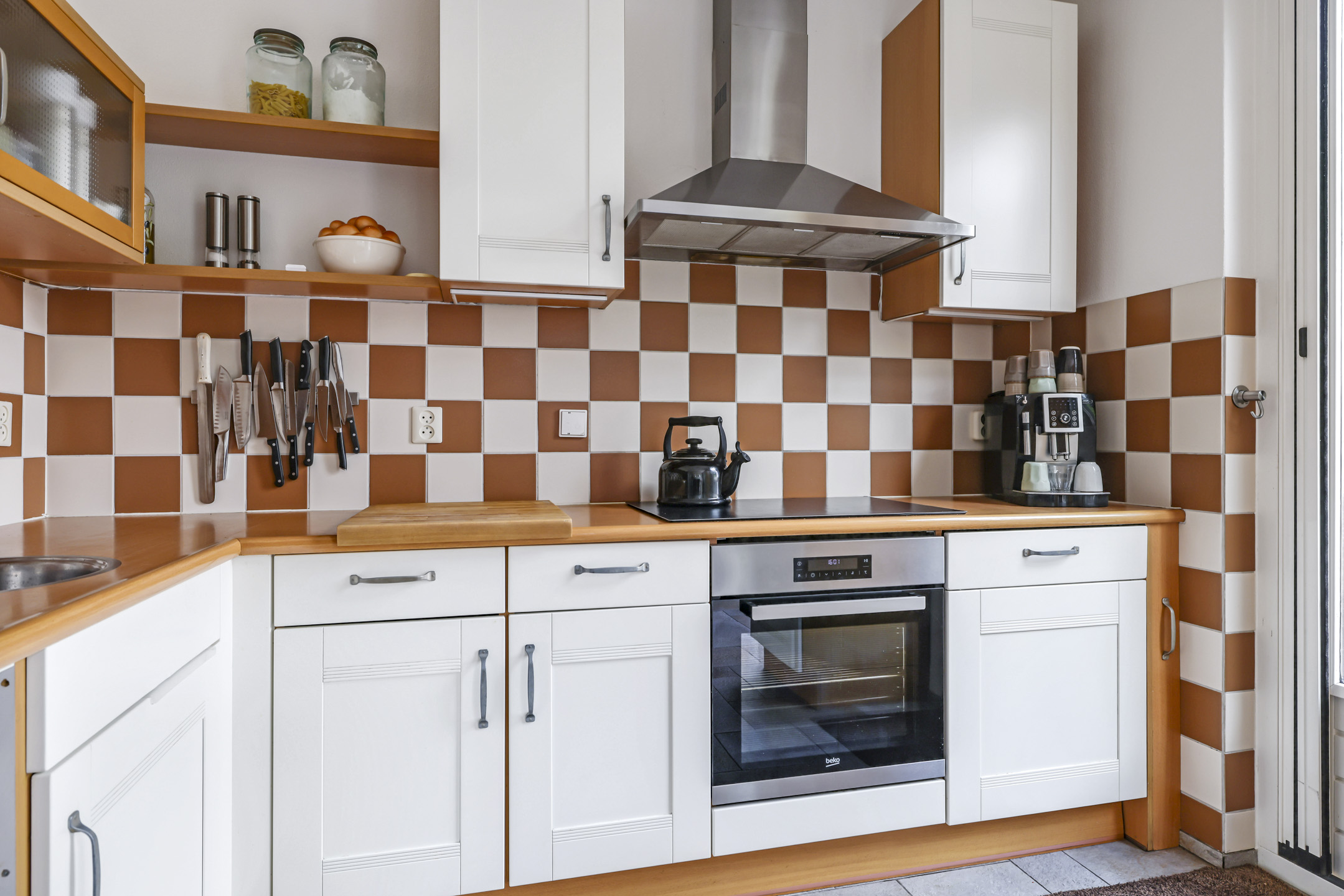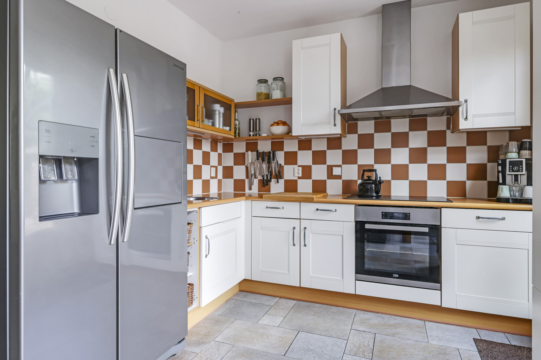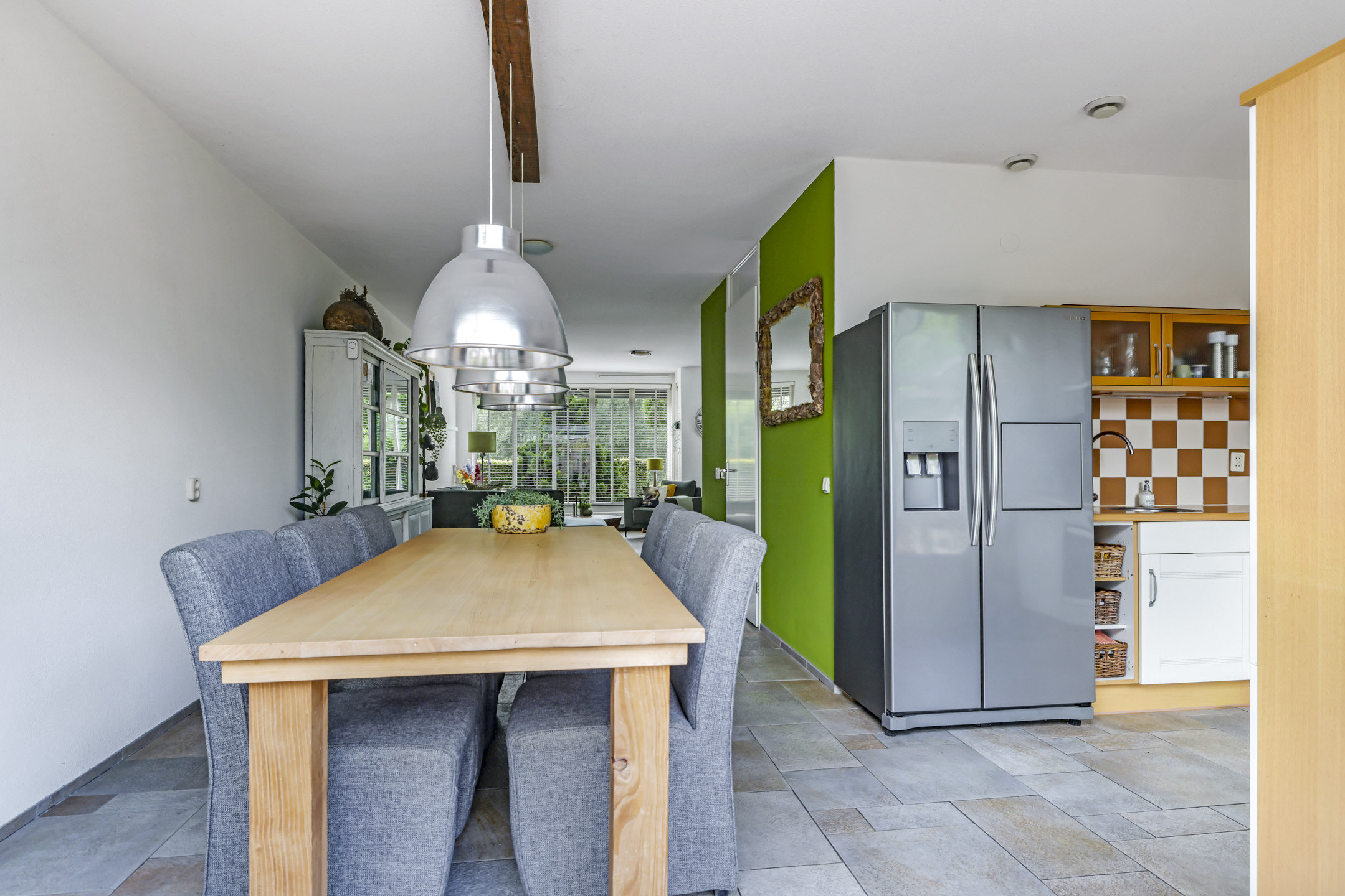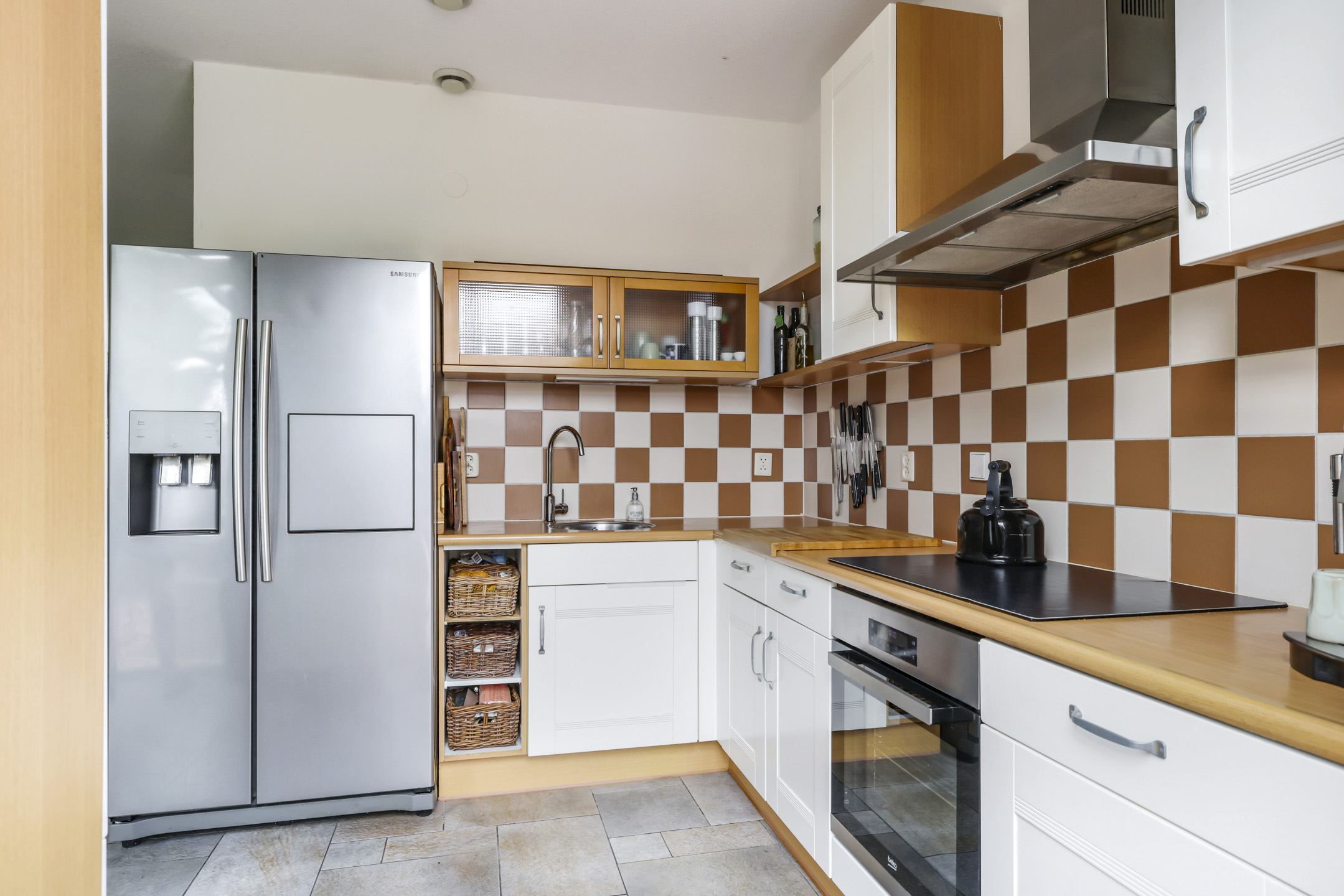 De keuken is aan de achterzijde van de woning geplaatst. Ideaal aangezien je vanuit de keuken wel contact houdt met je tafelgenoten, maar vanaf de bank kijk je niet direct op het aanrechtblad. Er is gekozen voor een hoekopstelling met enkele bovenkasten waardoor je hier veel opbergruimte treft. De aanwezige inbouwapparatuur bestaat uit een brede inductiekookplaat, een afzuigkap, een oven en een vaatwasser. De Amerikaanse koelkast met koel- en vriesgedeelte en een ijsblokjes dispenser blijft eveneens achter. Erg prettig is de aanwezige deur waardoor je vanuit de keuken zo de tuin in loopt.