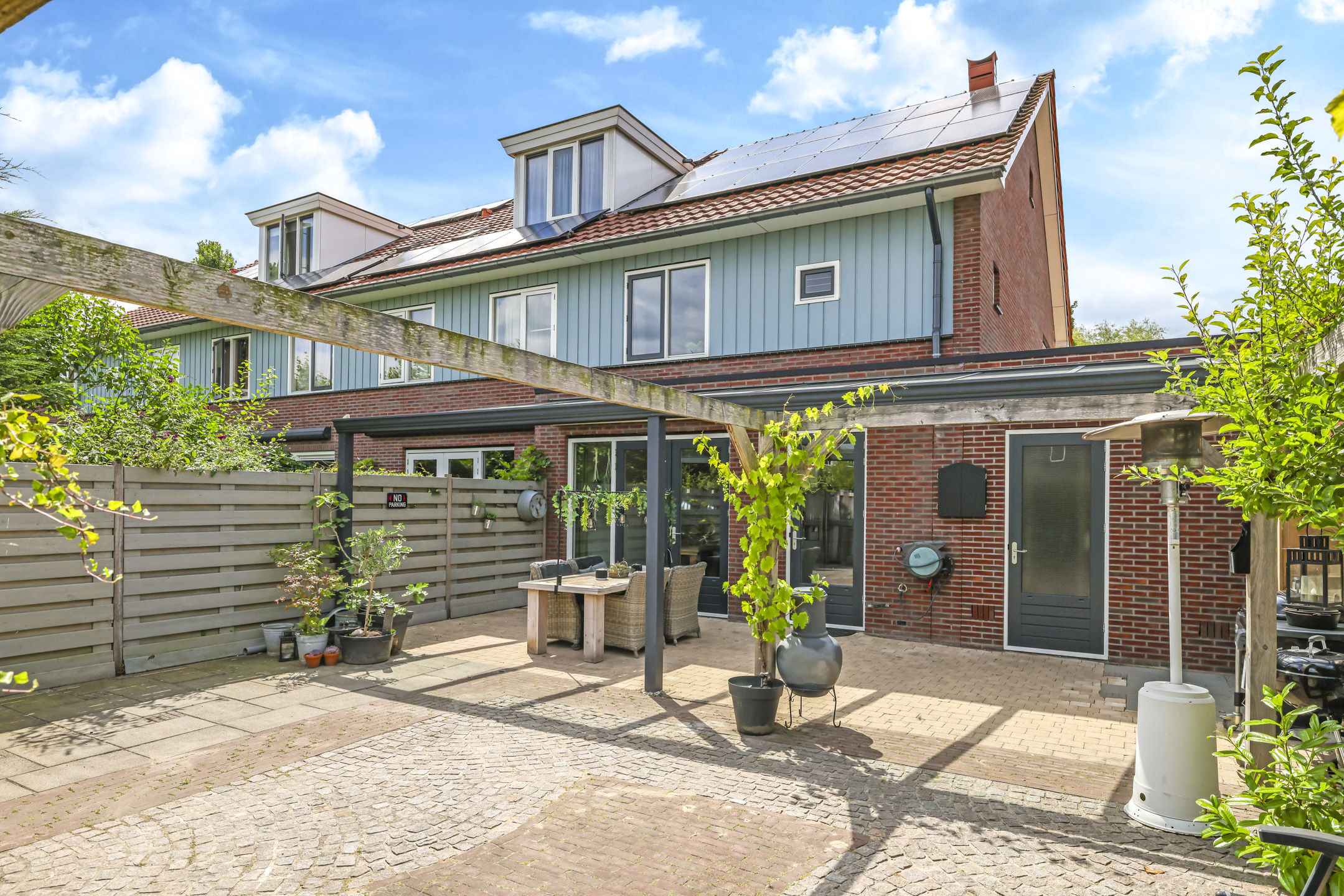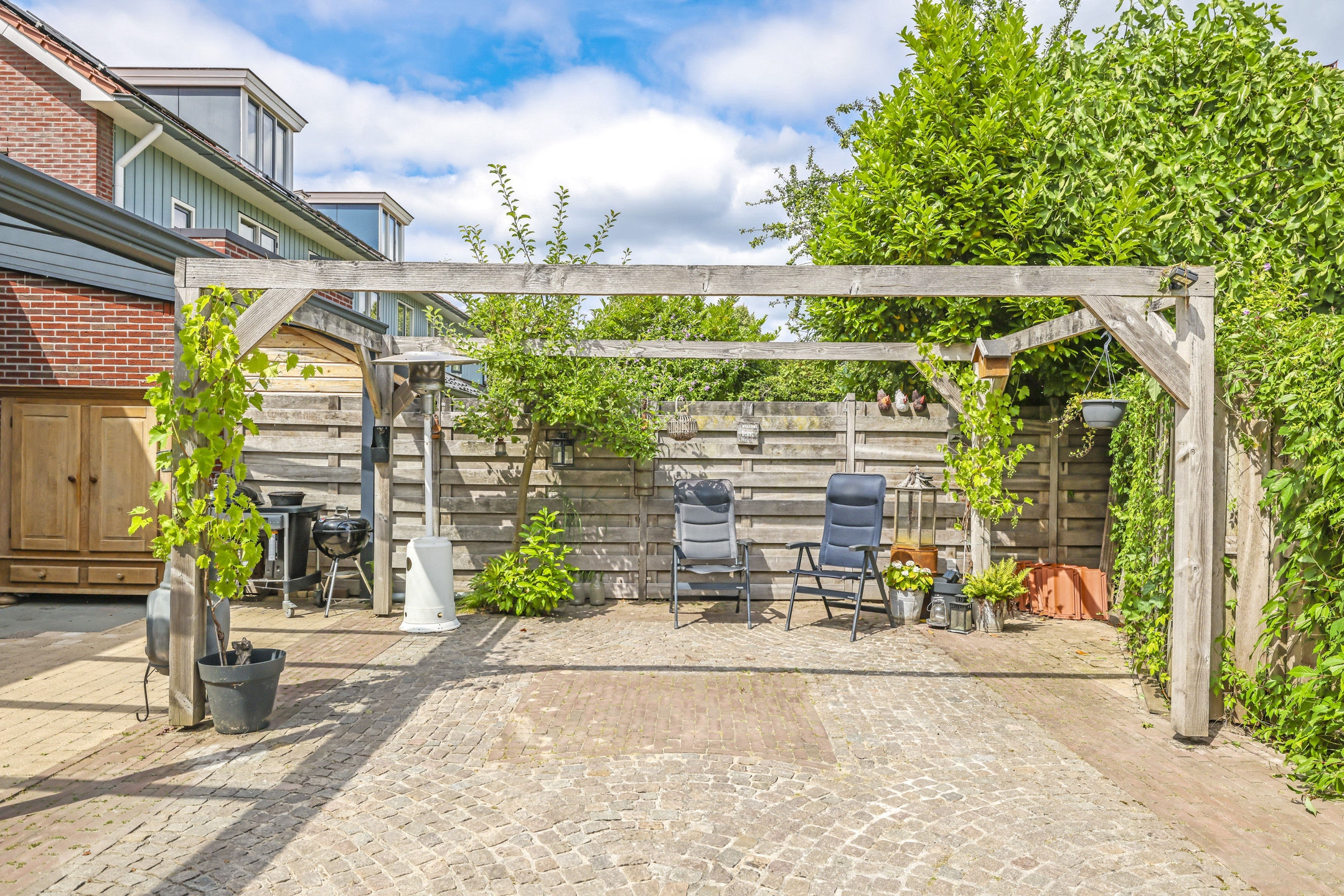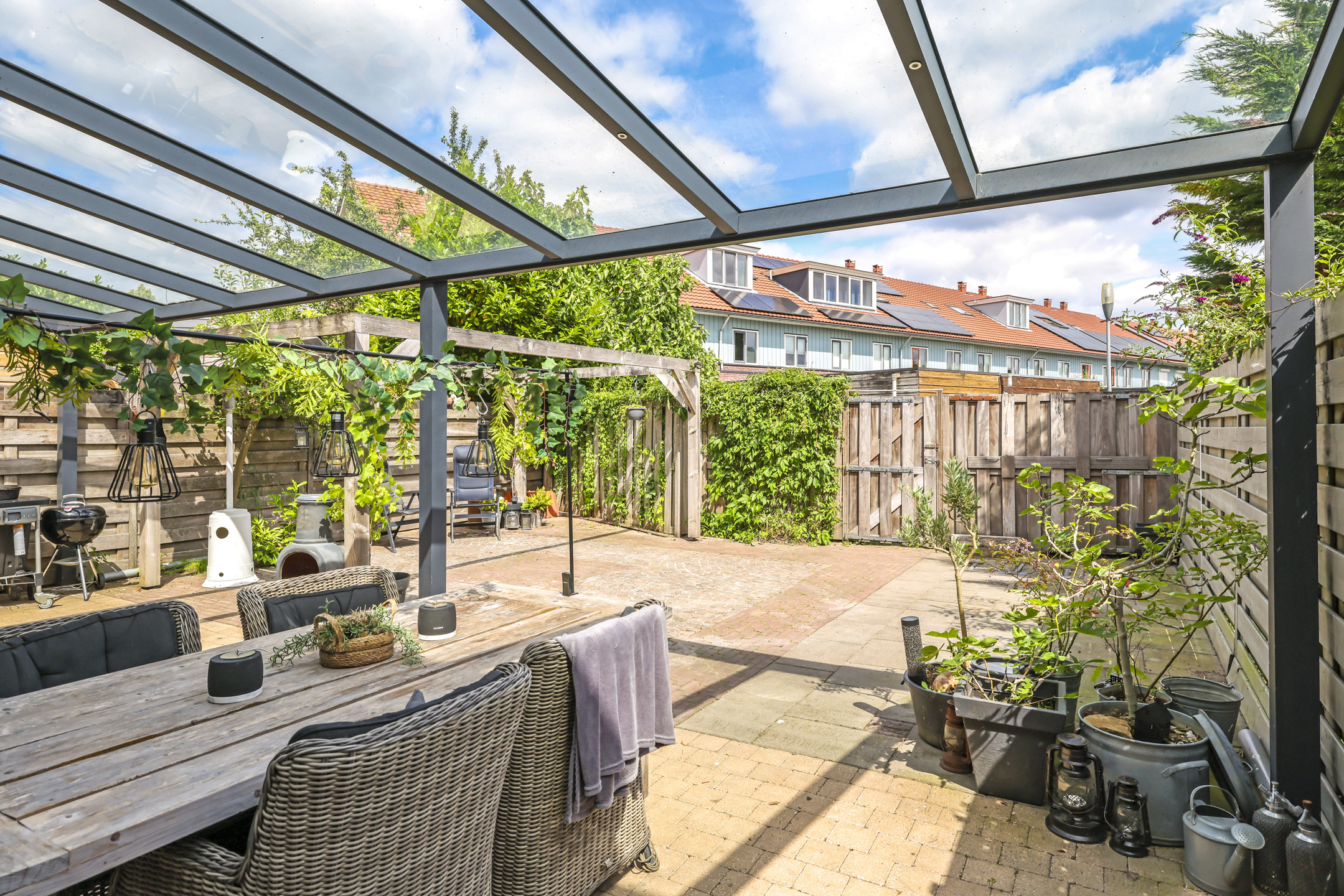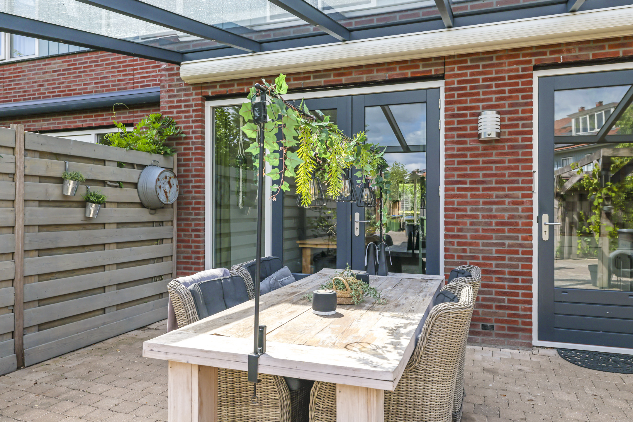 De woning wordt compleet gemaakt door een sfeervolle achtertuin met onder andere meerdere terrassen. Direct aan de woning is over de gehele breedte van de tuin een moderne terrasoverkapping geplaatst. Een extra brede poort zorgt dat je ook met een auto in de achtertuin kan komen. Voor de aangebouwde, stenen berging ligt een diepe oprit met plaats voor 4 auto’s. De woning ligt aan een doodlopende straat met zeer weinig autoverkeer. Aan de voorzijde sta je direct aan het park Rietgraaf met uitzicht op water en veel groen. Een speeltuin is op loopafstand gelegen. Diverse winkels, horeca en het centrum van Nijmegen zijn op fietsafstand.