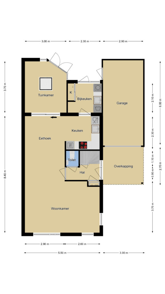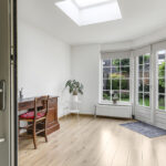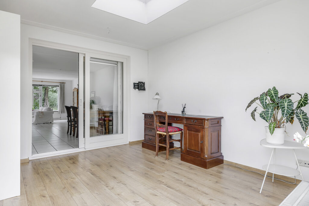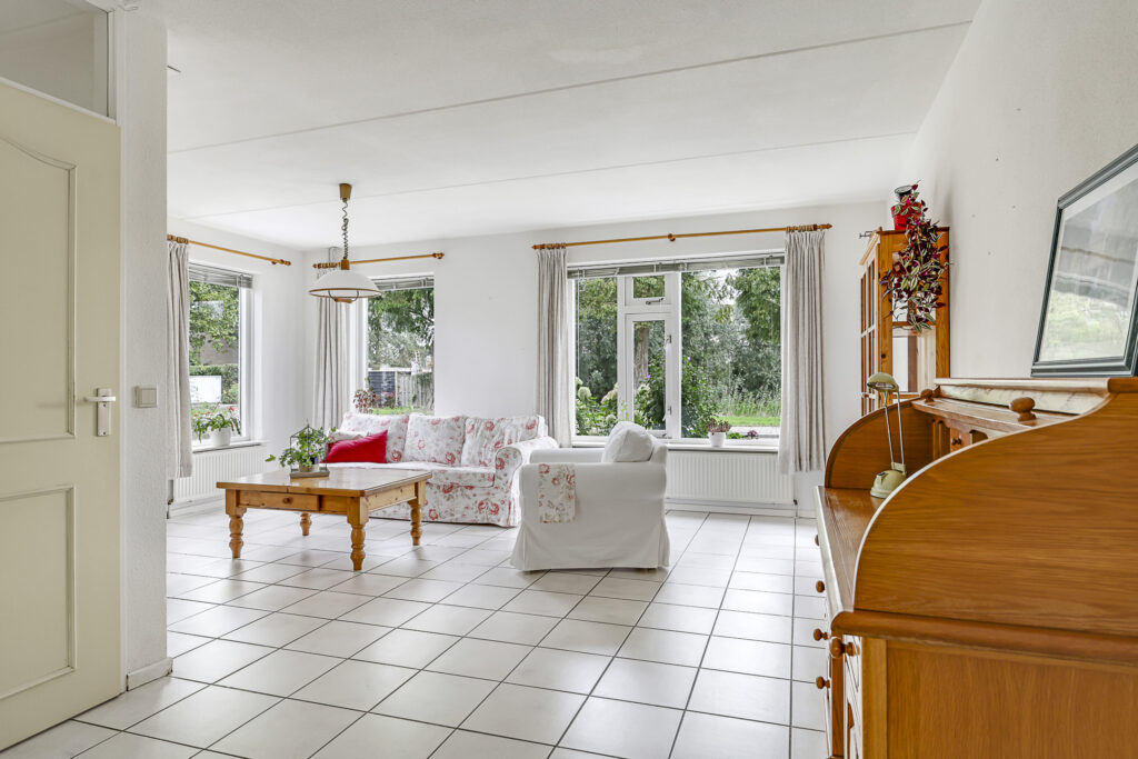 Een groot pluspunt is de aanbouw aan de achterzijde waardoor er een heerlijke tuinkamer is ontstaan. Deze is middels een schuifpui af te sluiten van de woonkamer waardoor je je in de tuinkamer helemaal kunt afzonderen. Opvallend zijn de raampartijen waaronder een lichtkoepel in het platte dak waardoor er veel lichtinval is. En wanneer je de dubbele terrasdeuren open zet, betrek je het buitenleven eenvoudig bij de woning.
