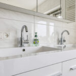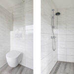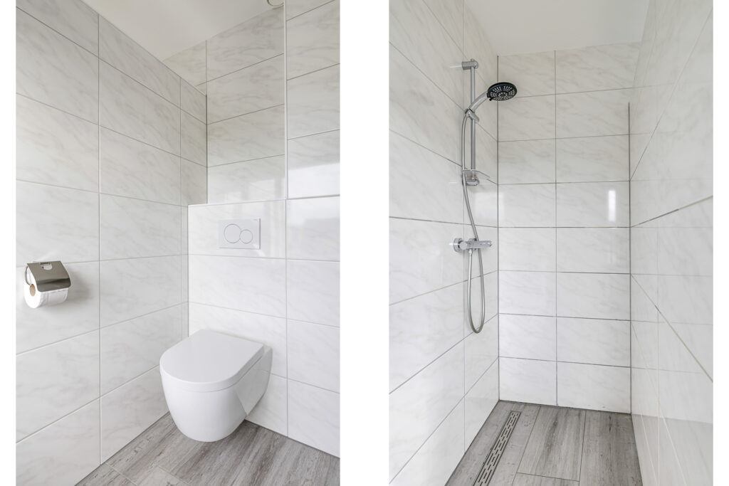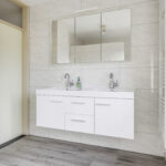 Badkamer met royale inloopdouche, breed 2-persoons wastafelmeubel en 2e toilet.