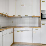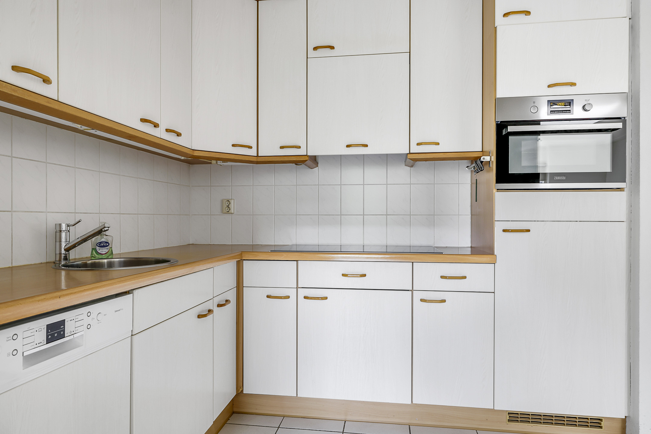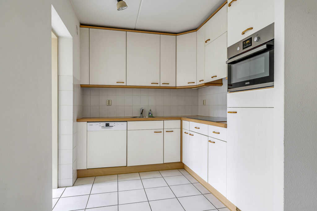 De keuken grenst direct aan de woonkamer (eethoek) en heeft daardoor een open karakter hetgeen het ruimtelijke gevoel versterkt. De keuken is daarbij in een hoekopstelling geplaatst en voorzien van diverse inbouwapparatuur. Denk daarbij aan een vaatwasser, een koelkast, een hetelucht-oven en een afzuigkap. De relatief nieuwe en maximaal brede inductie kookplaat wordt ter overname aangeboden. Verder is er veel kastruimte aanwezig zoals een handige draaicarrousel voor het opbergen van pannen.