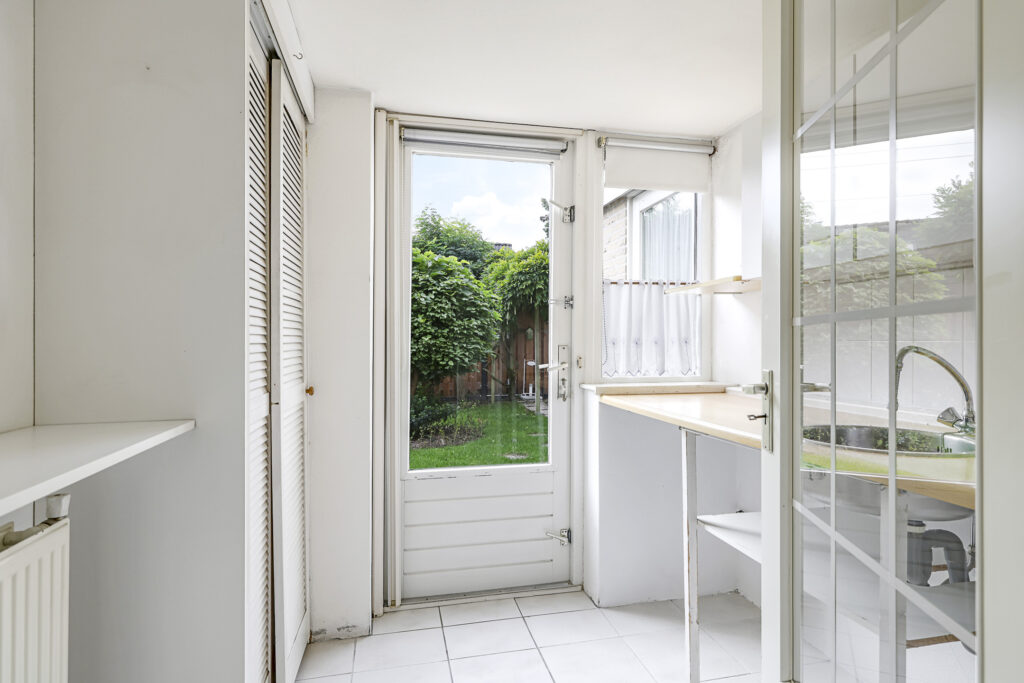 Vanuit de keuken loop je de bijkeuken in. Ook deze ruimte is aangebouwd en bijzonder praktisch te noemen. Er is een extra werkblad aangebracht, voorzien van een gootsteen. Dit is erg handig aangezien je hier ook de wasmachine en wasdroger kwijt kunt. (Op zolder is hier zelfs geen aansluiting voor.) Tevens is er een inbouwkast waar je de nodige voorraad en schoonmaakspullen kunt opbergen. En uiteraard ontbreekt ook hier de tuindeur niet.
