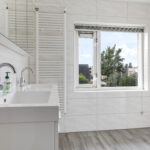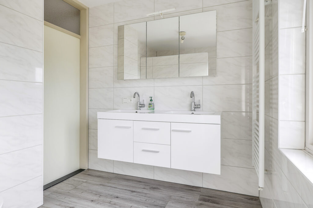 Ook de badkamer heeft een goed formaat (7m2) en voelt ruimtelijk aan door het grote raam dat aanwezig is. Deze badkamer is enkele jaren geleden compleet vernieuwd en neutraal en trendy afgewerkt. De ruimte is daarbij ingedeeld met een bijzonder comfortabele inloopdouche, een breed 2-persoons wastafelmeubel en een 2e zwevend wandcloset. Aan kastruimte voor toiletspullen is er geen gebrek aangezien het meubel is voorzien van ladekorven en de spiegel ook opbergruimte te bieden heeft. Een handdoekradiator maakt deze badkamer compleet.