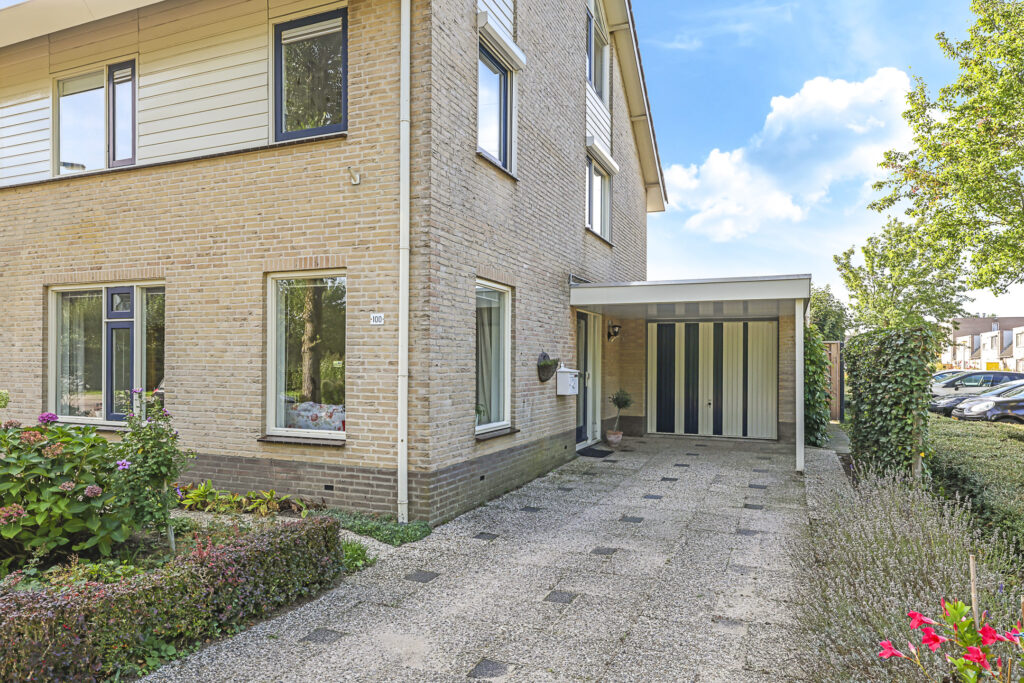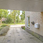 Vóór de garage ligt een oprit voor 2 auto’s waarvan er één onder de carport kan staan. De carport is niet lang genoeg om een auto er volledig onder te parkeren, maar het is al fijn dat de auto (deels) beschut kan staan. Zo hoef je bij vorst niet alle ruiten te krabben en sta je lekker droog bij de voordeur.
