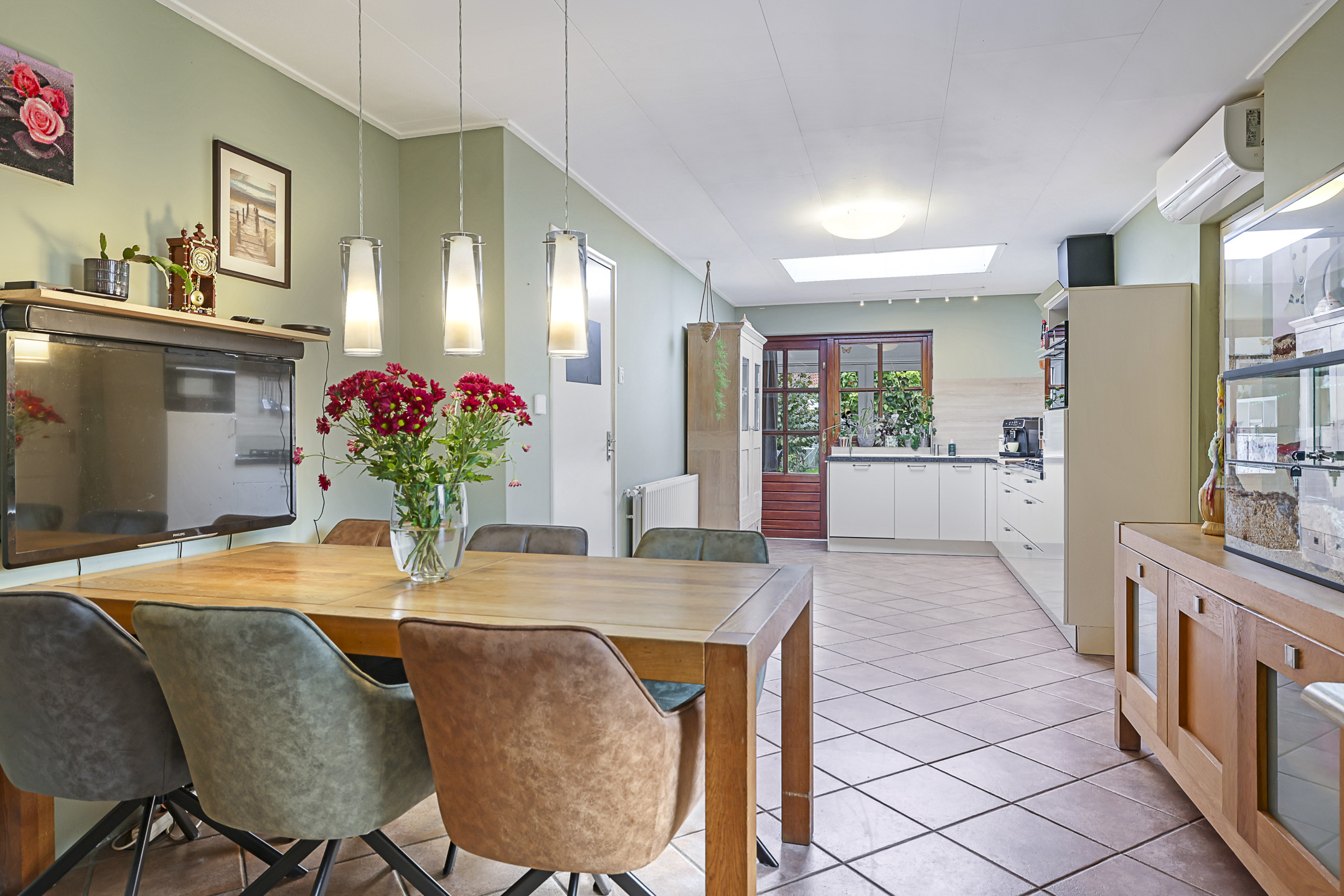 Woonkeuken met hoekopstelling v.v. inbouwapparatuur, airco, lichtkoepel en eethoek