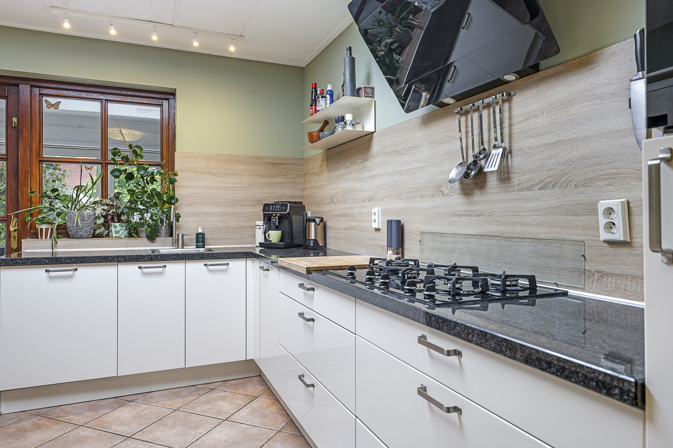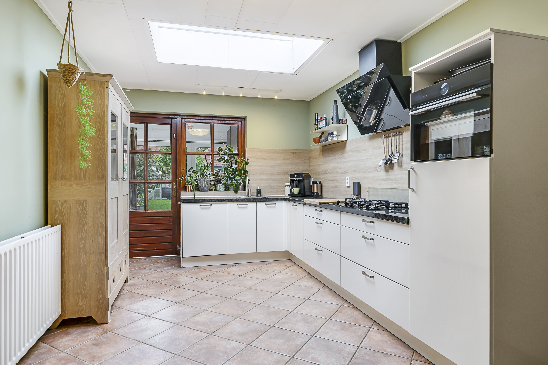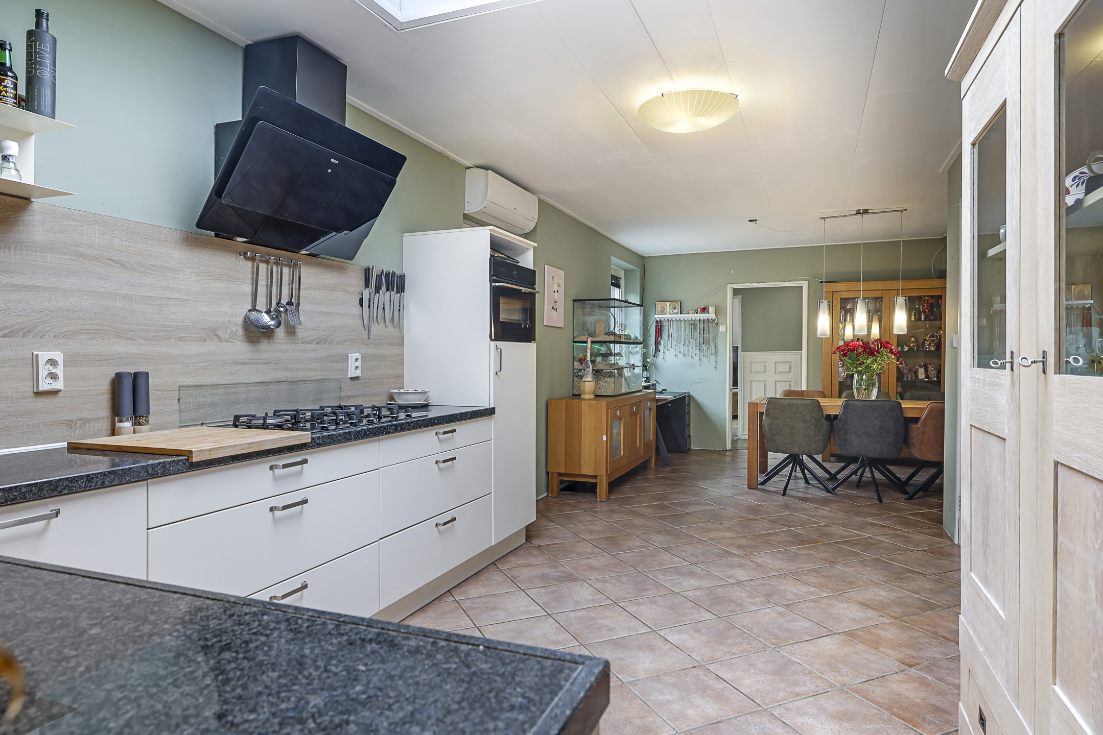 Eén van die royale ruimtes is de woonkeuken. Deze leefruimte is dermate ruim opgezet dat je er met gemak een 6-persoons eettafel kwijt kunt. In 2014 is er een nieuwe hoekkeuken geplaatst met onder meer een granieten werkblad en praktische kastruimte zoals brede ladekorven. De inbouwapparatuur bestaat uit een vaatwasser, een koelkast, een combi-oven/magnetron, een 5-pits kookplaat (gas-op-glas) en een afzuiger. Ongeveer 6 jaar geleden is er in het platte dak nog een nieuwe lichtkoepel geplaatst. Airconditioning zorgt ervoor dat het er altijd aangenaam is.