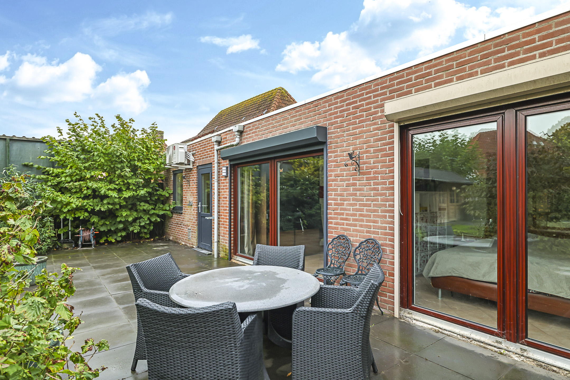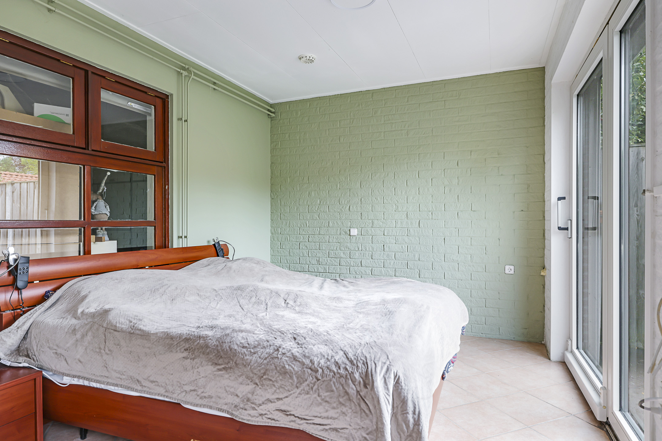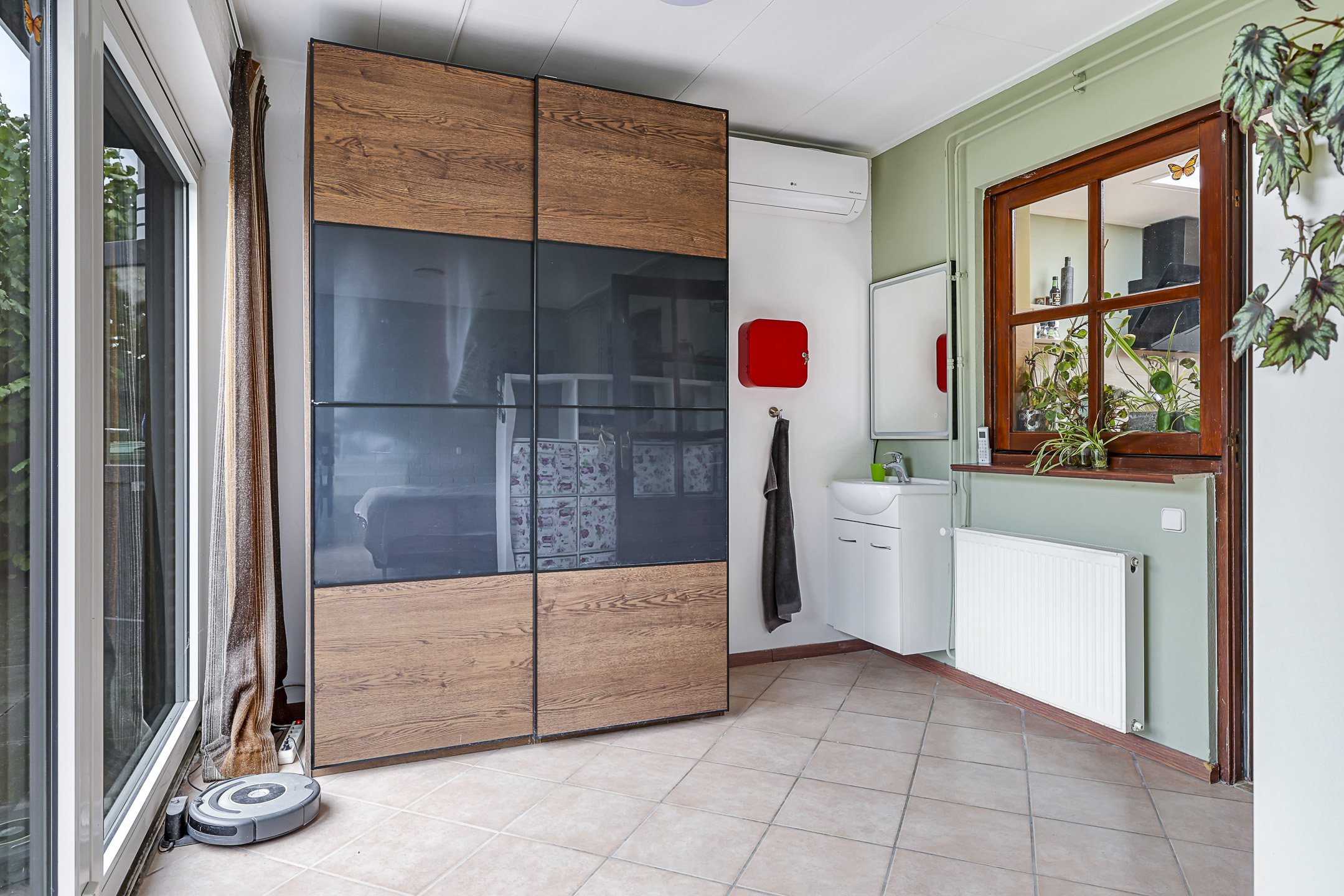 Slaap/tuinkamer met 2 brede schuifpuien, rolluiken, airconditioning en een wastafelmeubel.