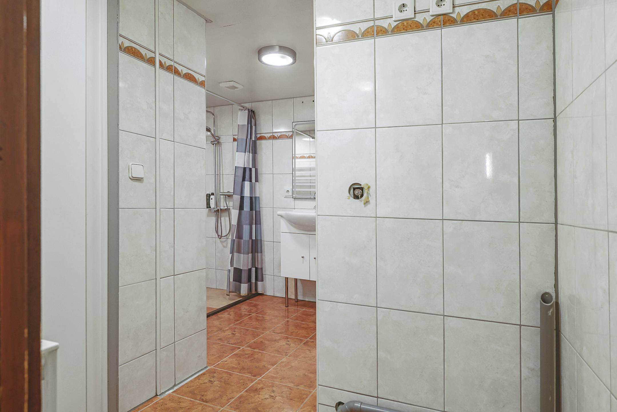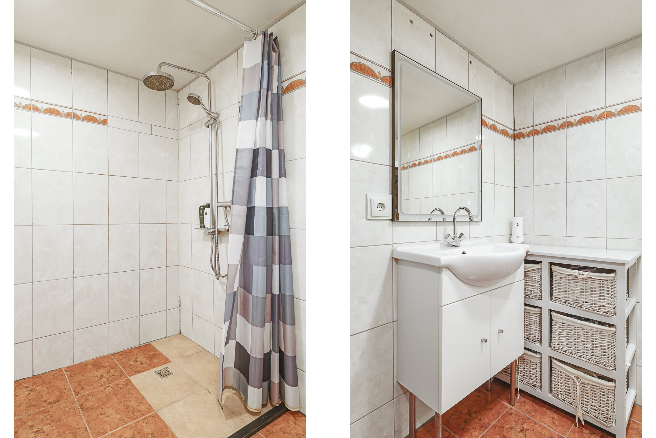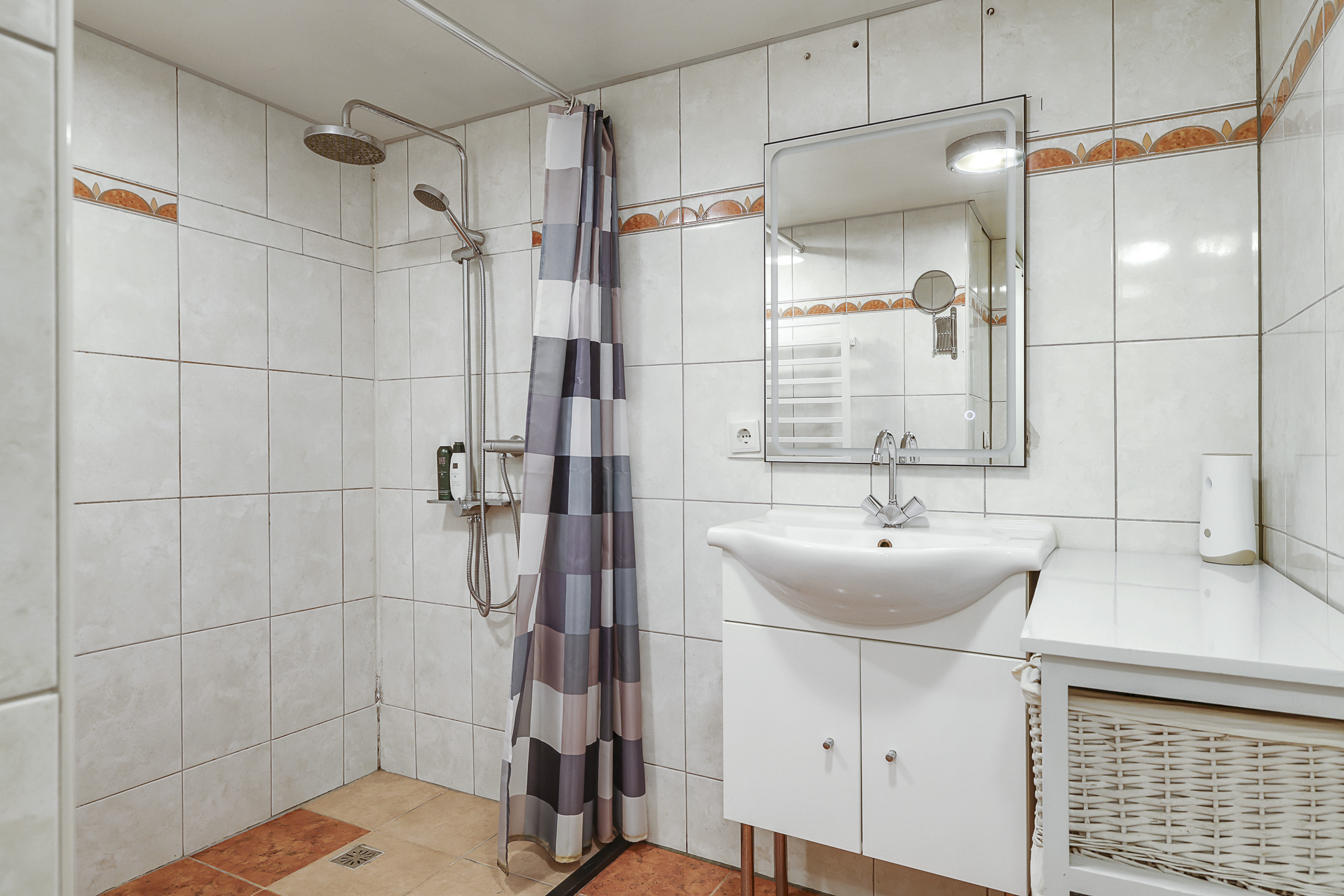 Badkamer met inloopdouche, wastafelmeubel en handdoekradiator