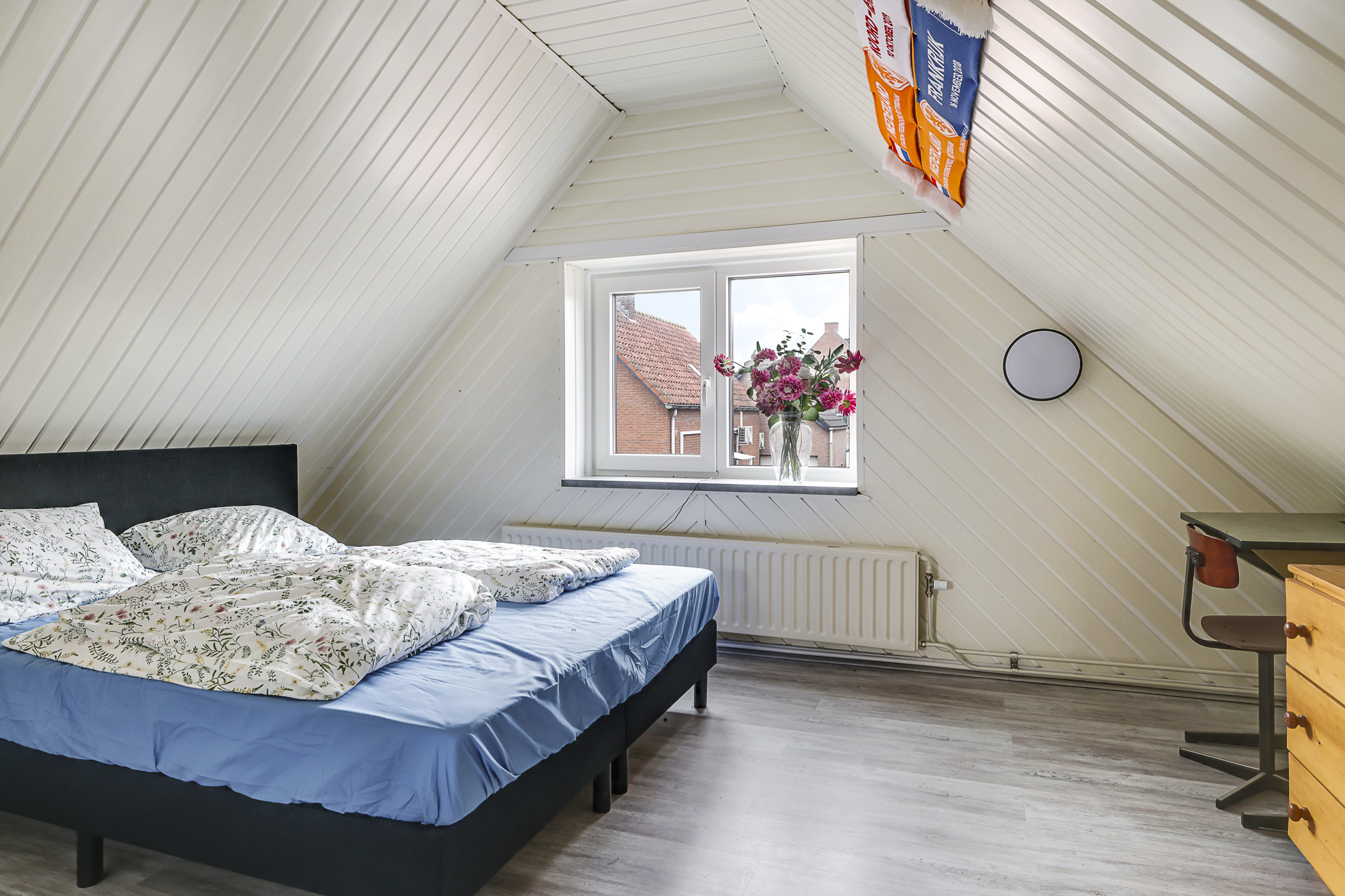 Slaapkamer (achterzijde) met aan beide kanten een dakkapel (voorheen 2 slaapkamers).