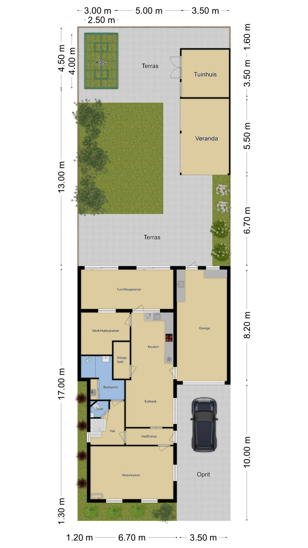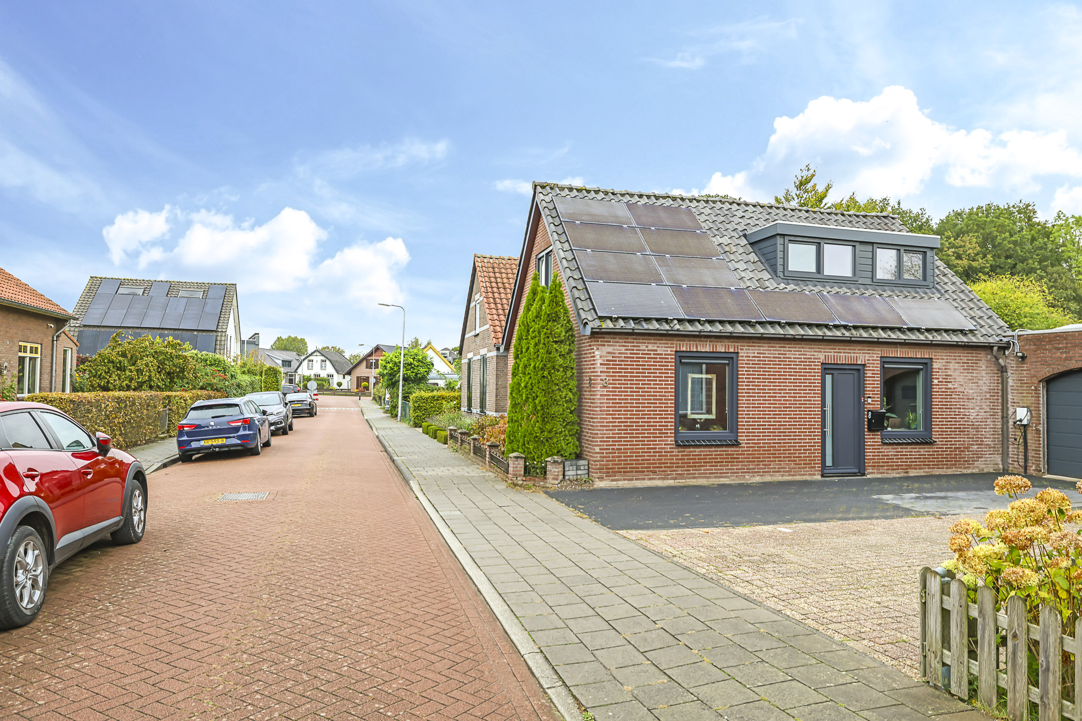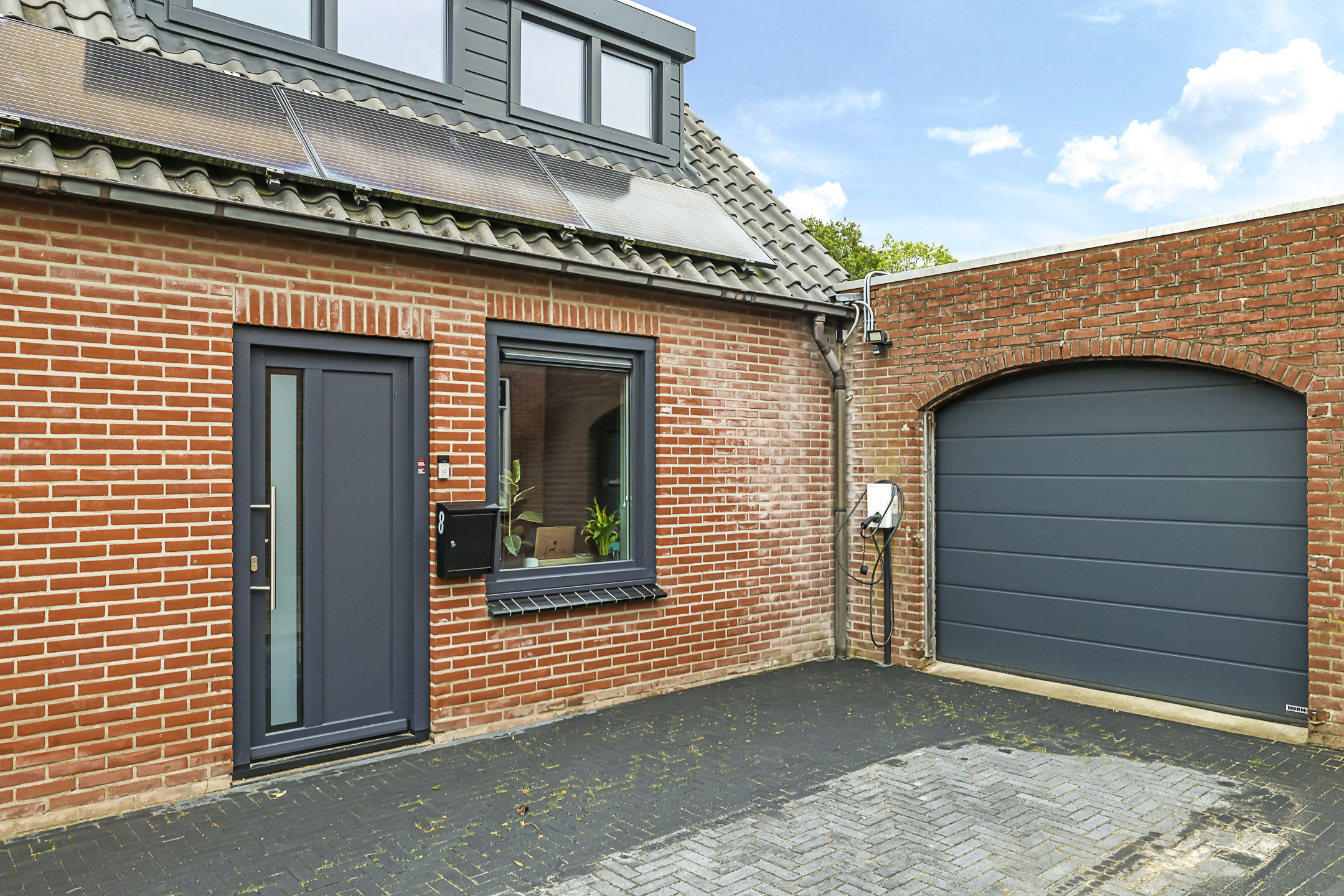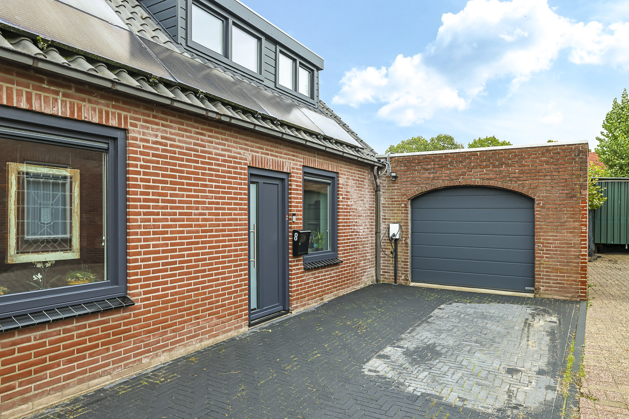 Vóór de garage ligt nog een comfortabele oprit van 3,5 meter breed met plaats voor 2 auto’s op eigen terrein. De aanwezig laadpaal blijft achter.