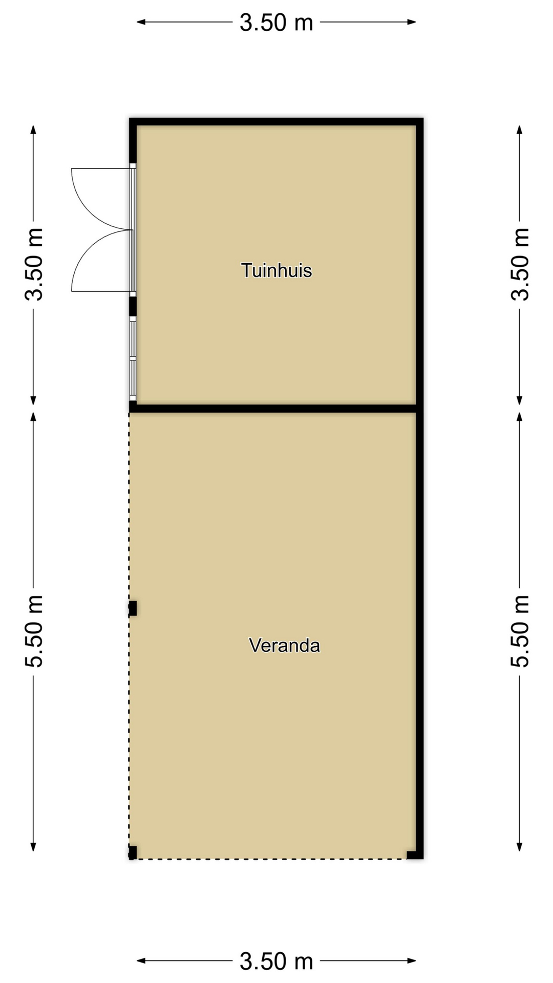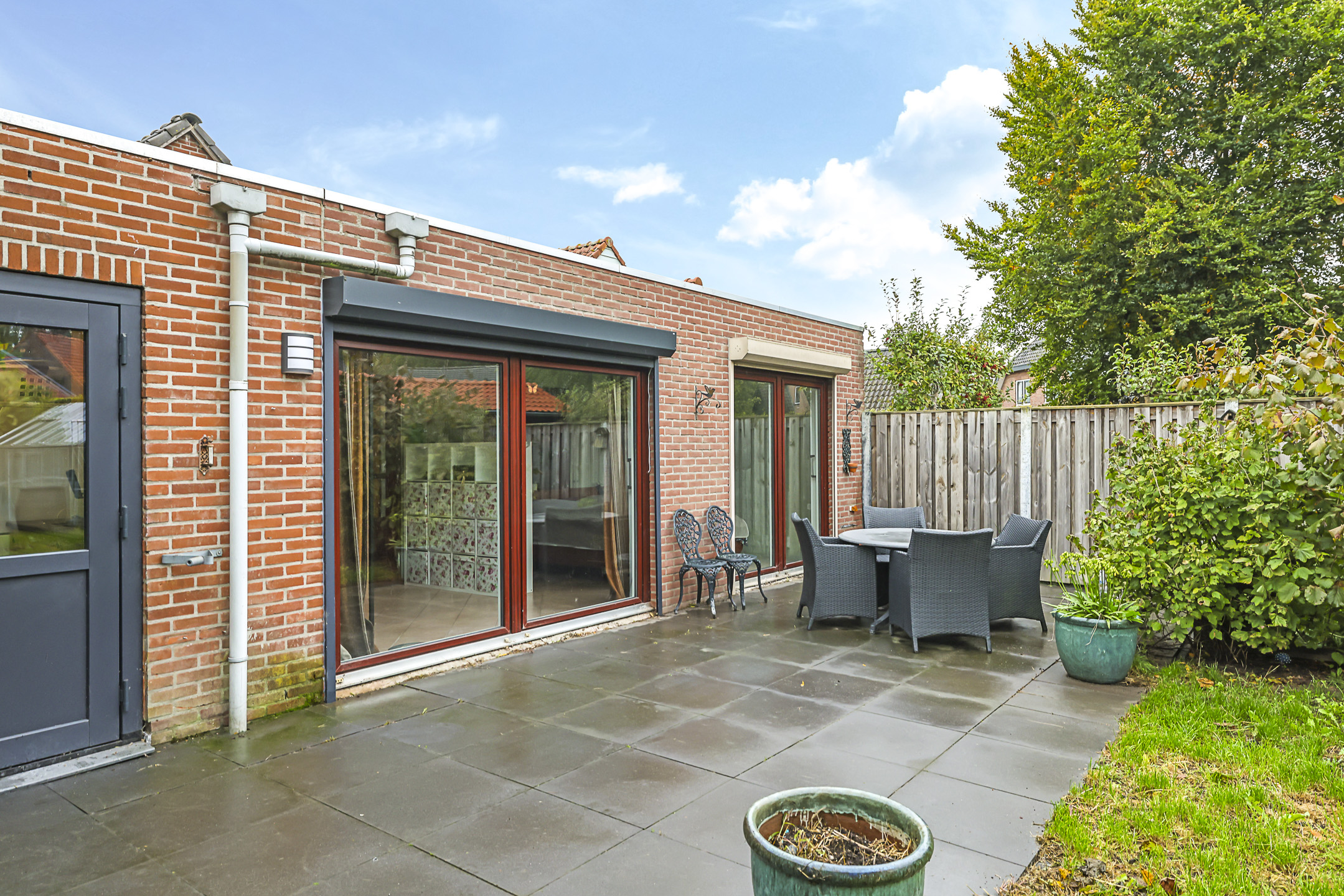 Tuinkamer met 2 brede schuifpuien v.v. elektrisch bedienbare rolluiken (1 is dit jaar vervangen (rolluik aan de achterzijde))
