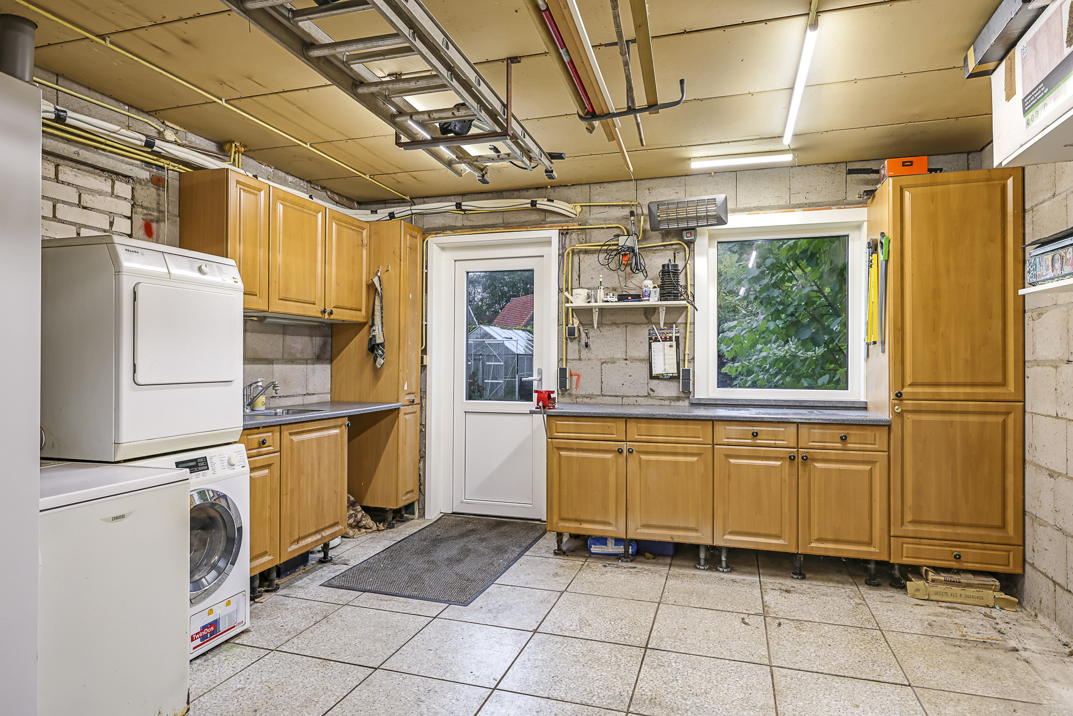 Daarnaast is er nog de aangebouwde garage die van binnenuit toegankelijk is. Deze garage is dermate groot dat je het zou kunnen opdelen en/of er (geheel) een andere bestemming aan kunt geven. De garage is immers in spouw gebouwd, voorzien van spouwisolatie en heeft een eigen groepenverdeelkast. Er zijn meerdere stopcontacten, een gootsteen met warm en koud water en de witgoedaansluitingen zijn hier te vinden. Een tuindeur geeft direct toegang tot de achtertuin.