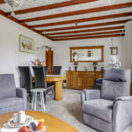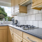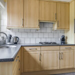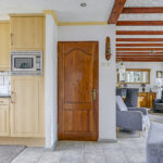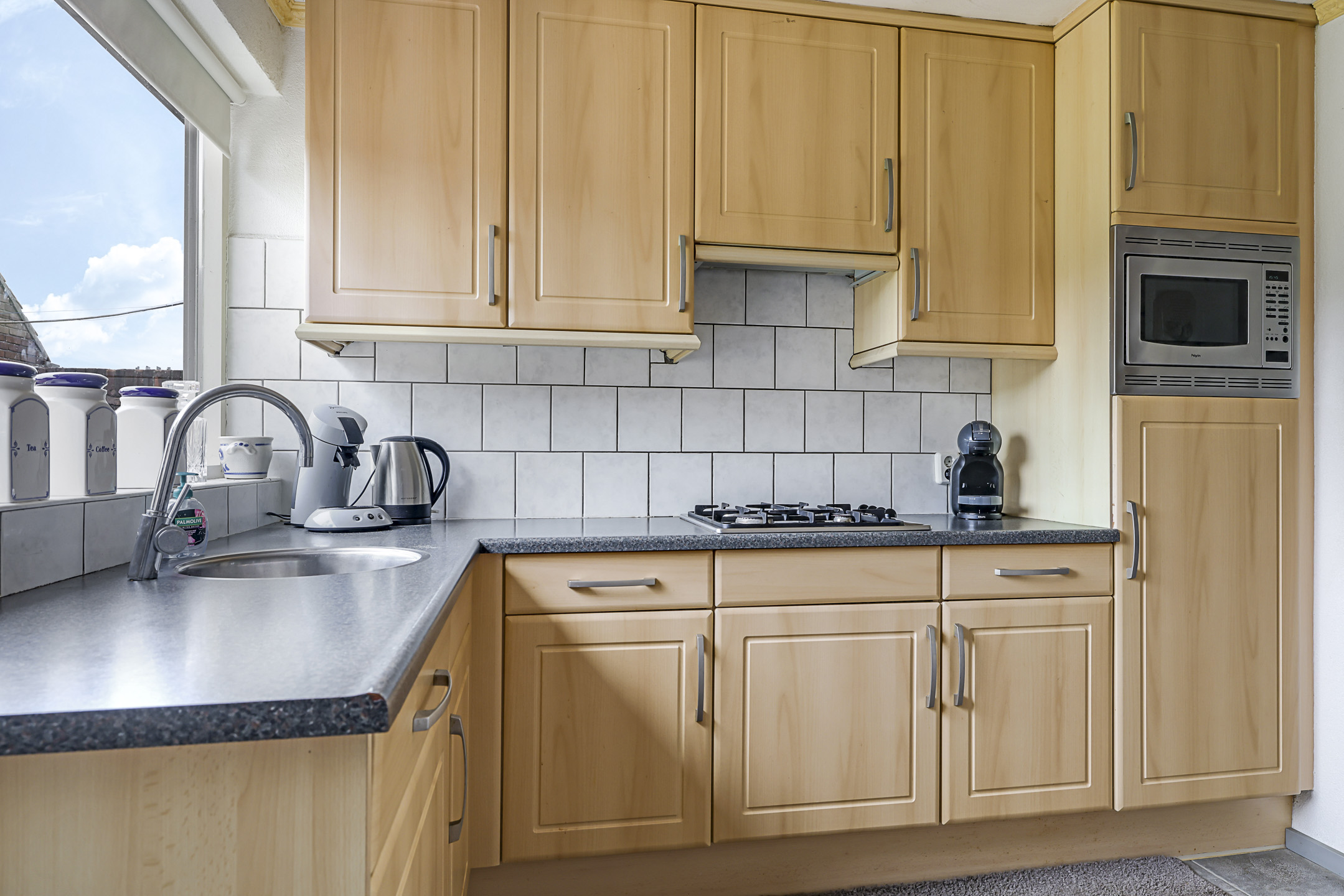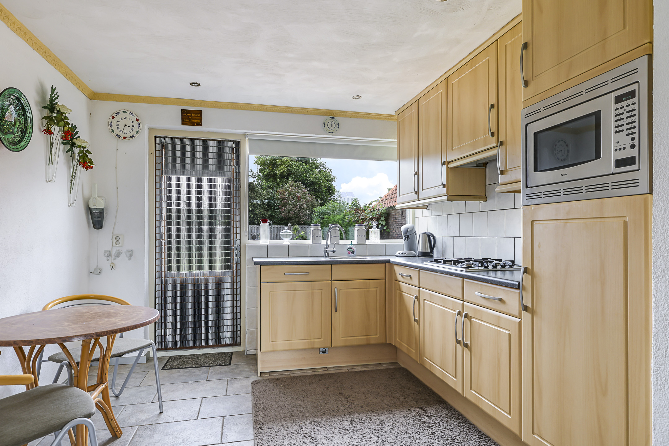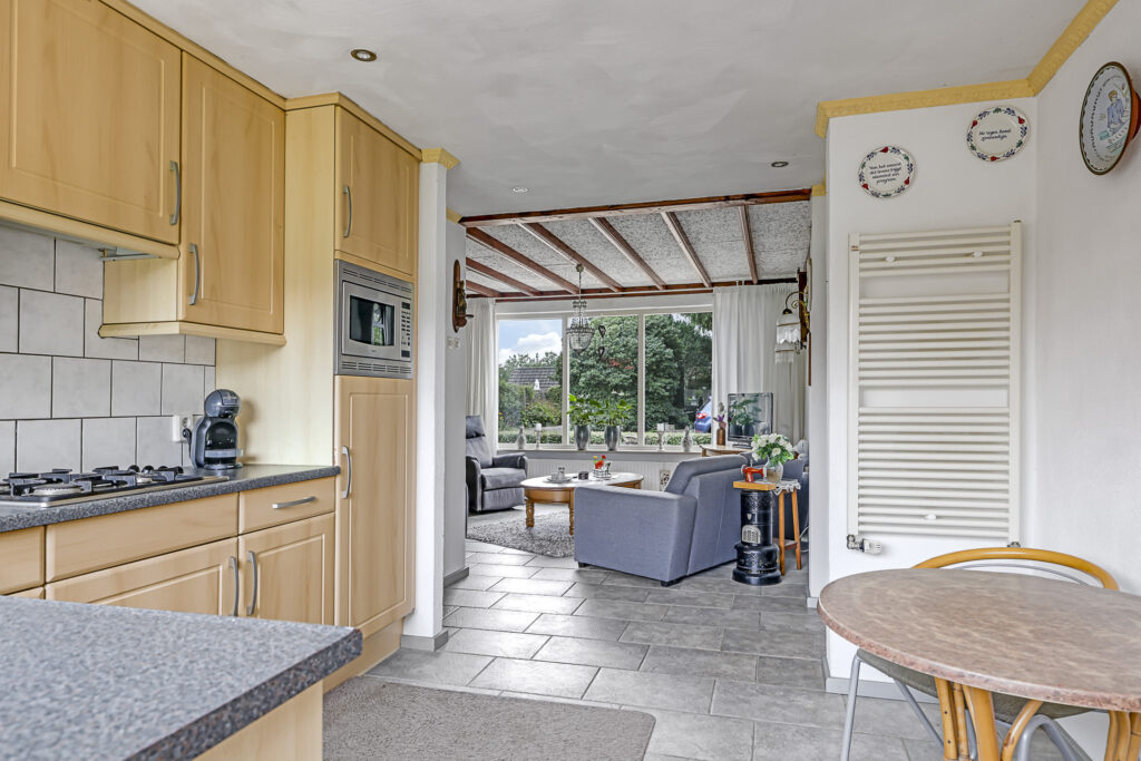 De open keuken heeft een praktische opstelling en is voorzien van diverse inbouwapparatuur, namelijk een 4-pits gaskookplaat, een afzuigkap, een combimagnetron en een vaatwasser. Tevens heeft deze keuken voldoende kastruimte voor een servies en levensmiddelen. De keuken is tuingericht en heeft een tuindeur naar het buitenterras.
