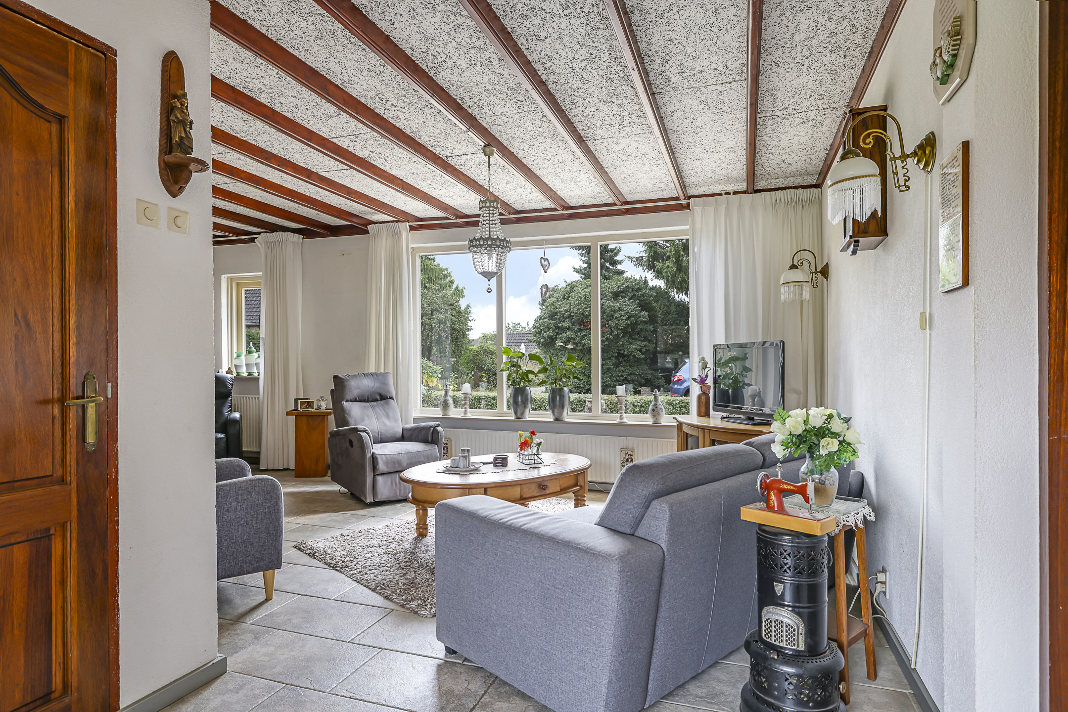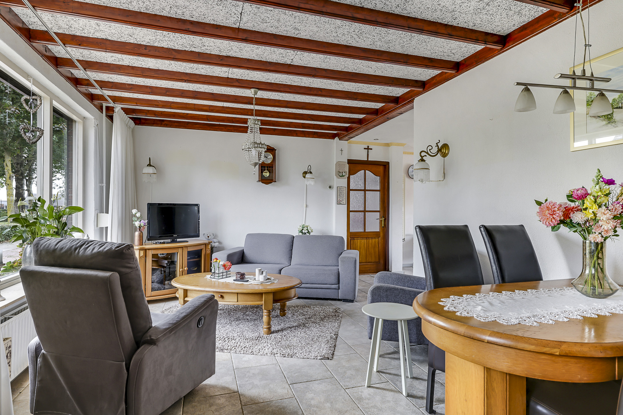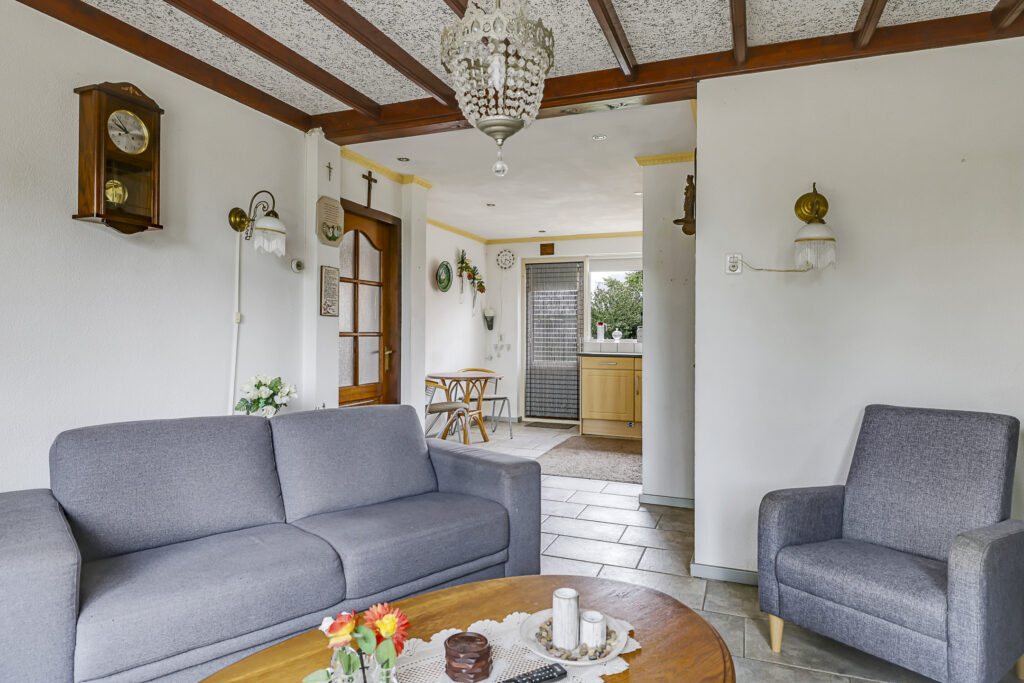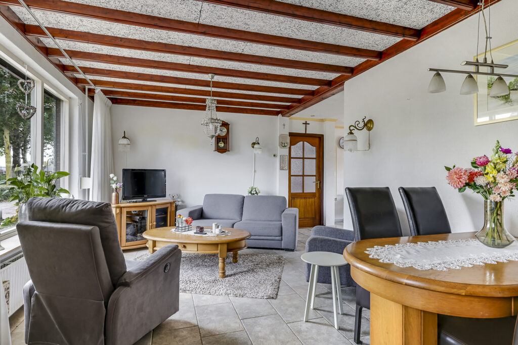 Door de uitzonderlijke breedtemaat van de woning, is ook de woonkamer breder dan gemiddeld. Dit ruimtelijke gevoel wordt verder versterkt door het grote raam met lichtinval. Doordat dit raam op de zuidzijde is georiënteerd, is hier een rolluik aangebracht die je elektrisch kunt bedienen. Wat erg comfortabel is, is de plavuizen vloer met vloerverwarming. Stel dat je de tegelvloer niet mooi vindt, dan zou je altijd nog kunnen kiezen voor egalisatie in combinatie met een PVC-vloer. Daarmee zou je de vloerverwarming kunnen behouden.