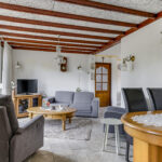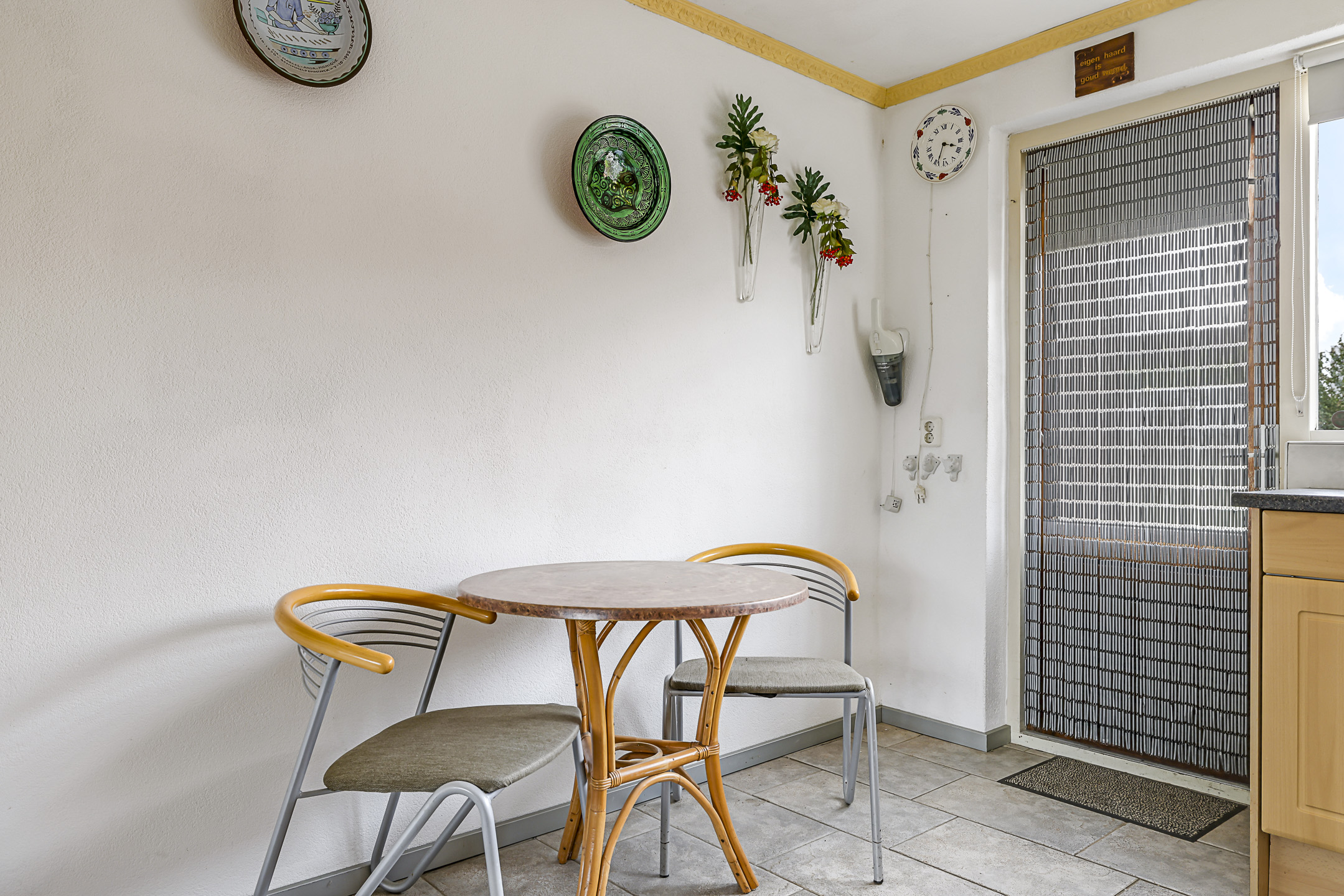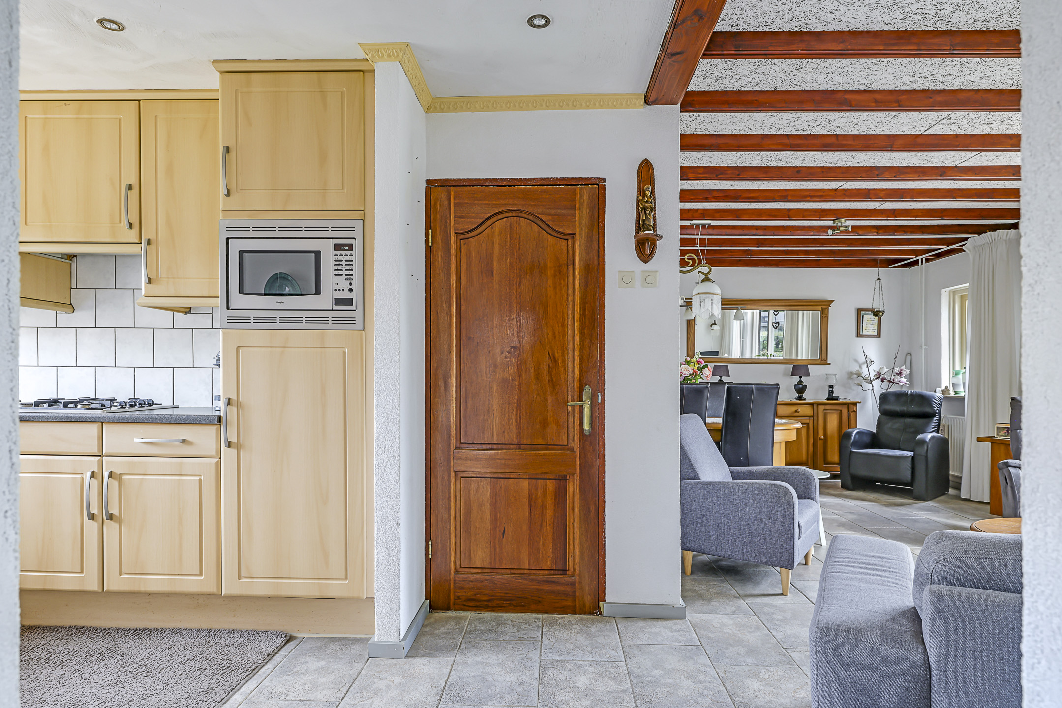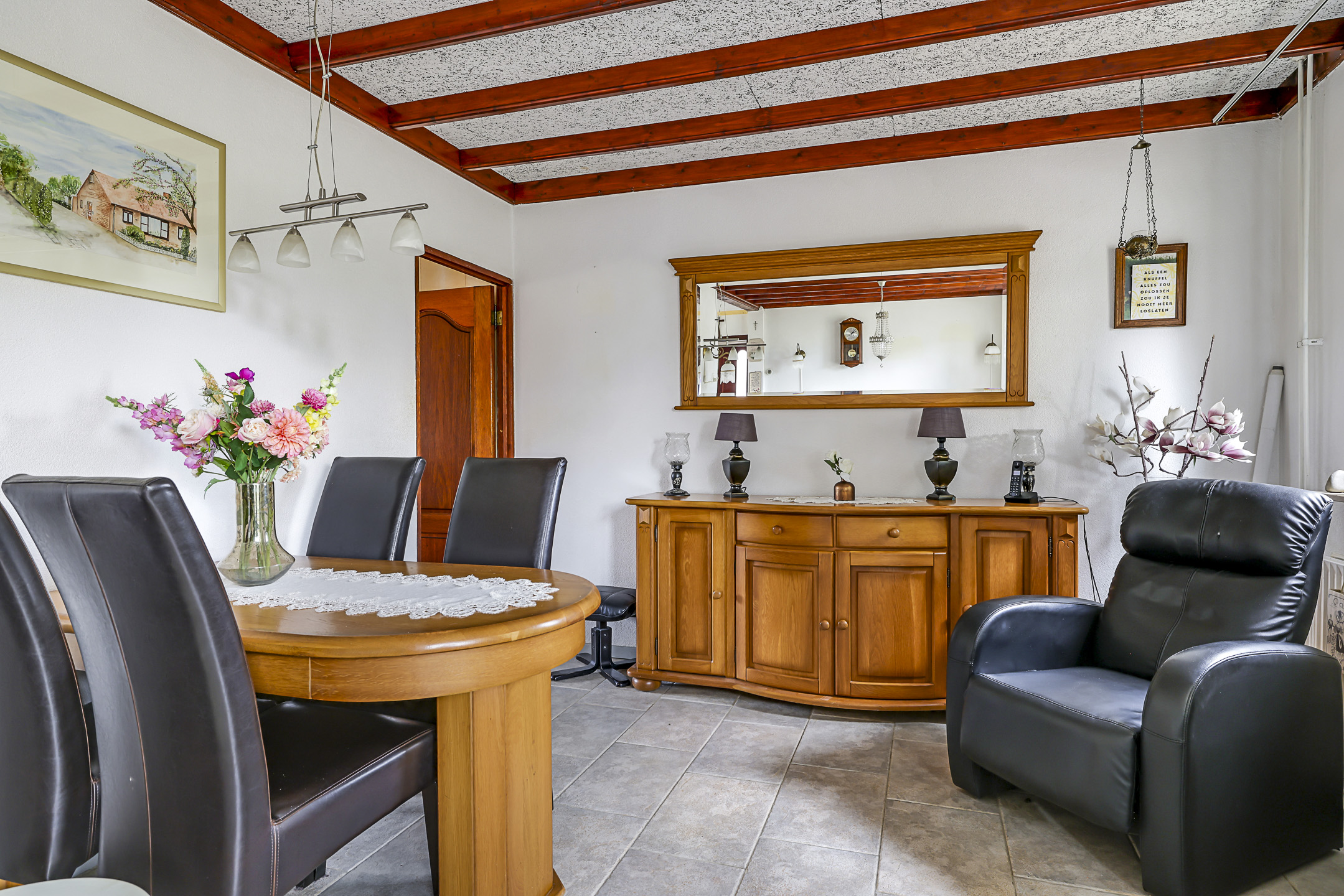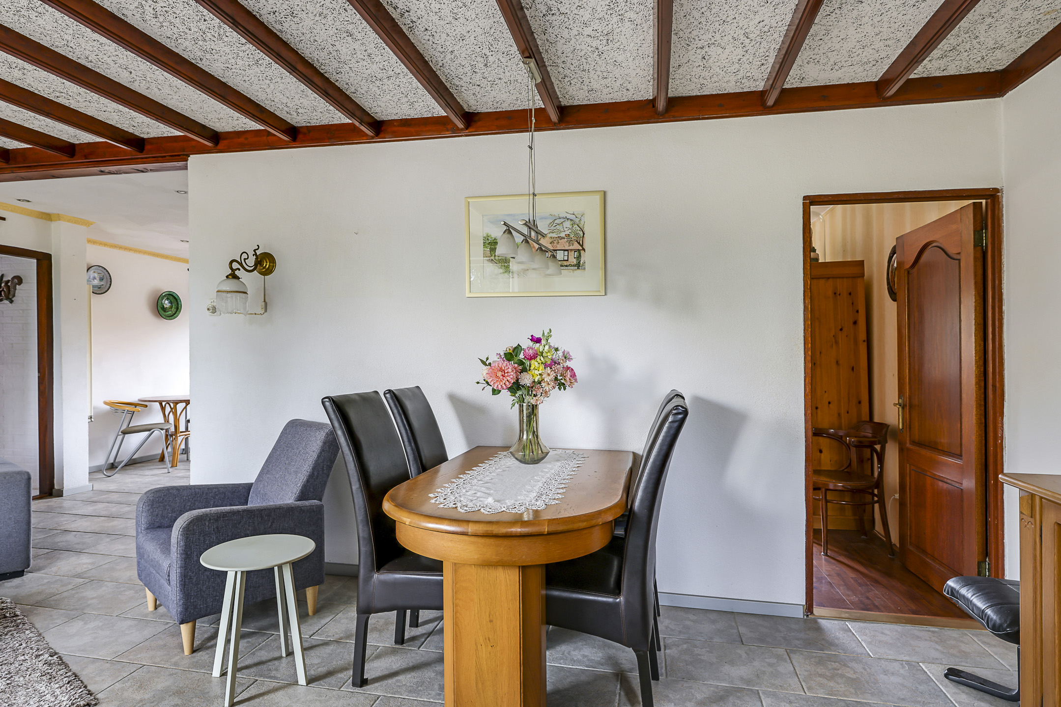 Door de uitzonderlijke breedtemaat van de woning, is ook de woonkamer breder dan gemiddeld. Dit ruimtelijke gevoel wordt verder versterkt door het grote raam met lichtinval. Doordat dit raam op de zuidzijde is georiënteerd, is hier een rolluik aangebracht die je elektrisch kunt bedienen. Wat erg comfortabel is, is de plavuizen vloer met vloerverwarming. Stel dat je de tegelvloer niet mooi vindt, dan zou je altijd nog kunnen kiezen voor egalisatie in combinatie met een PVC-vloer. Daarmee zou je de vloerverwarming kunnen behouden.