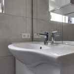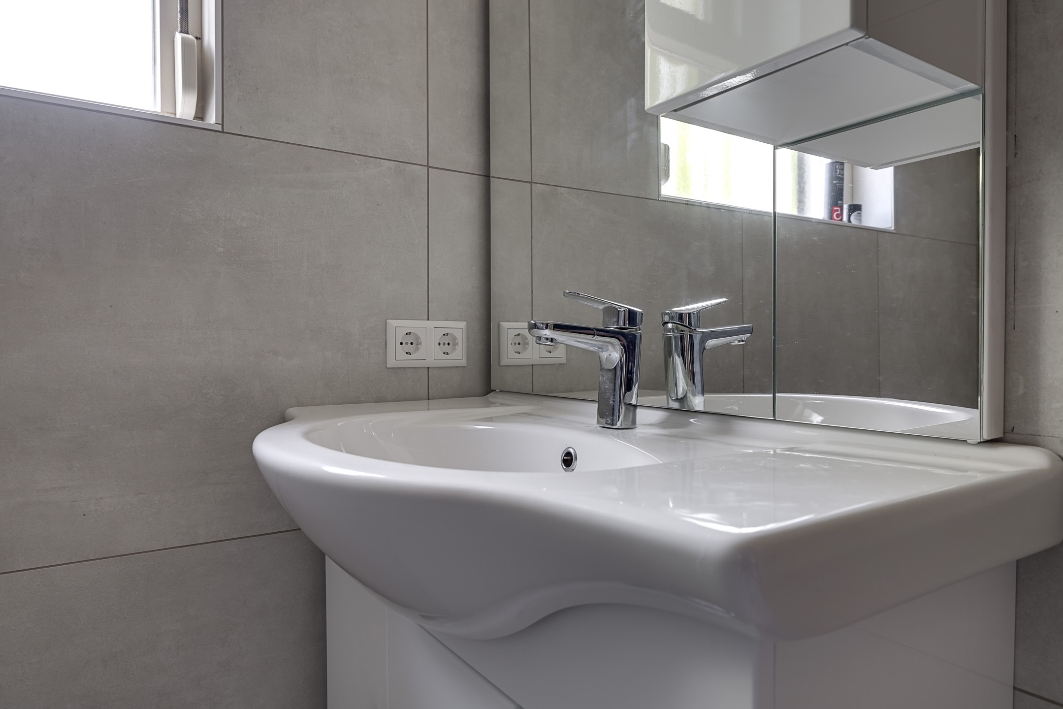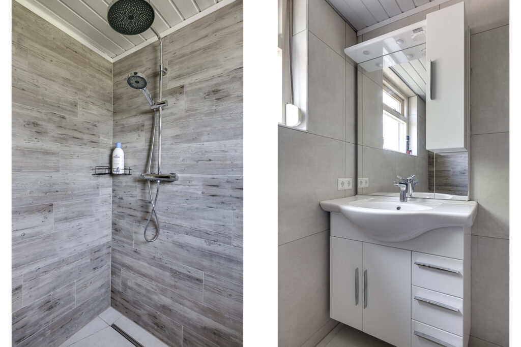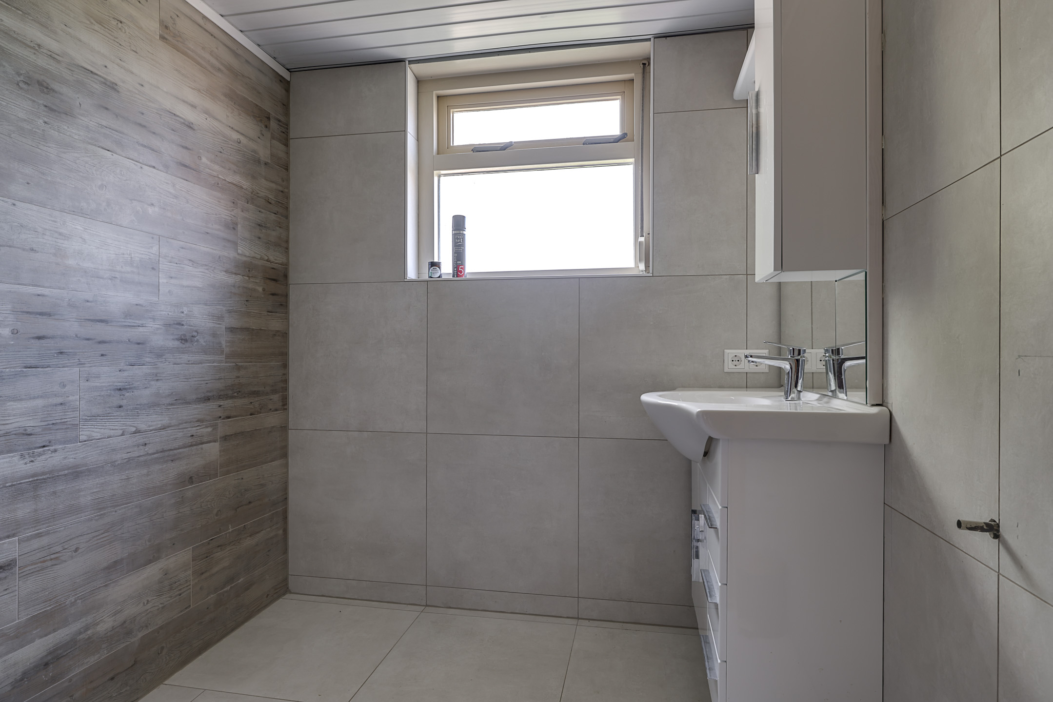 De badkamer is nog relatief nieuw (2021) hetgeen je direct ziet aan het sanitair en tegelwerk. Er is een comfortabele inloopdouche gerealiseerd met onder meer een rainshower, een handdouche en een drainafvoer. Tevens is er een wastafelmeubel geplaatst met erboven een spiegelkast. In beide elementen vind je opbergruimte voor toiletspullen. Wat verder opvalt is het groot formaat tegels, hetgeen de badkamer een strak en moderne uitstraling geeft. Tevens is het aanwezige raam nog noemenswaardig, aangezien je niet alleen daglicht hebt, maar ook op natuurlijke wijze kunt ventileren.