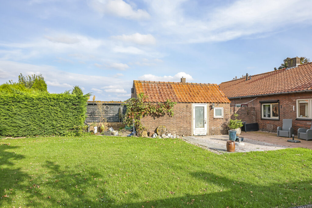 Er is een heerlijk groot terras aangelegd waardoor je prima een lekkere tuinset kwijt kunt. Het gazon en enkele borders met planten zorgen voor een groen karakter. Halverwege de tuin staat een stenen berging. Hier kun je fietsen stallen alsmede tuingereedschap en een grasmaaier opbergen.