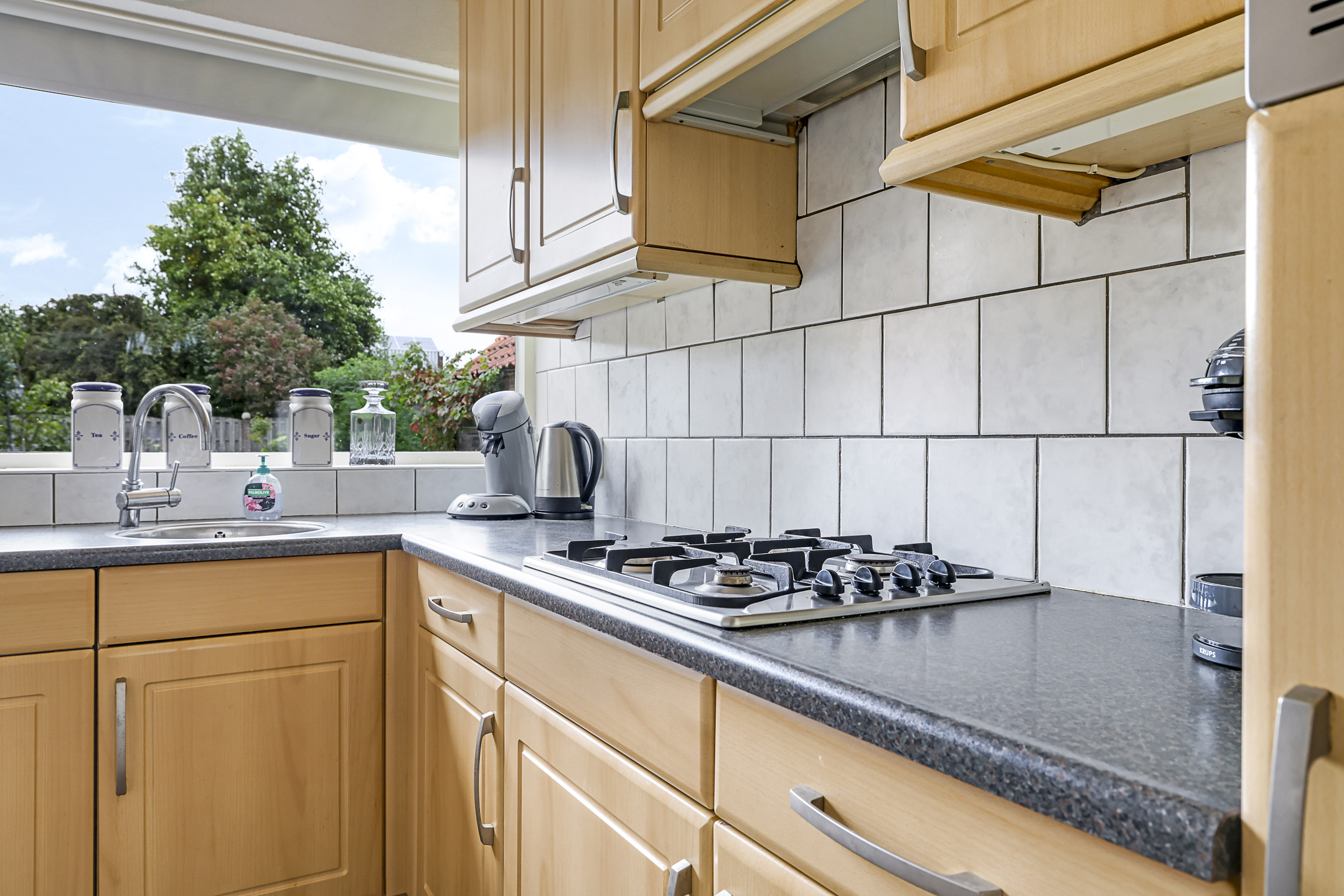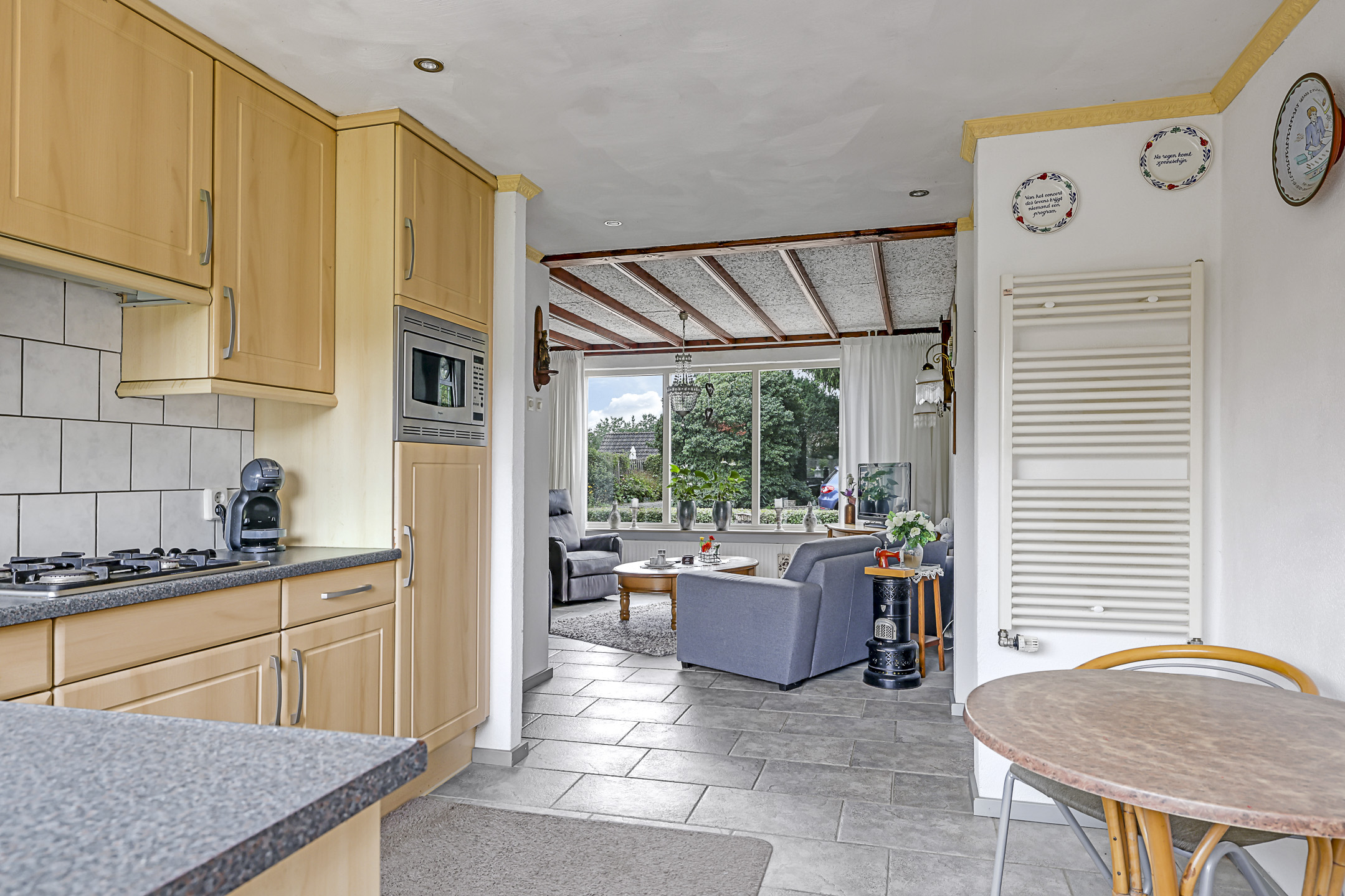 Open keuken v.v. inbouwapparatuur, vloerverwarming en tuindeur