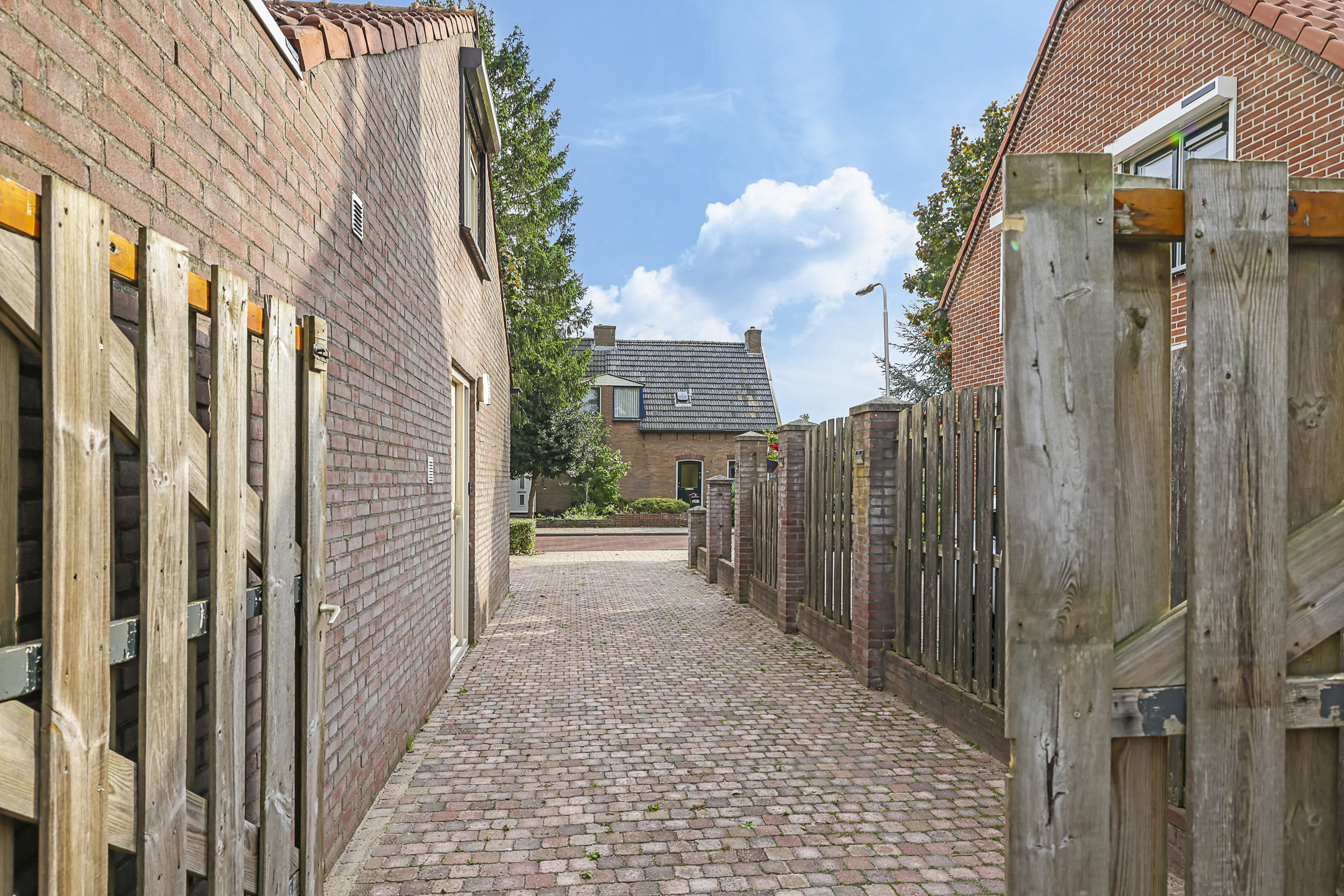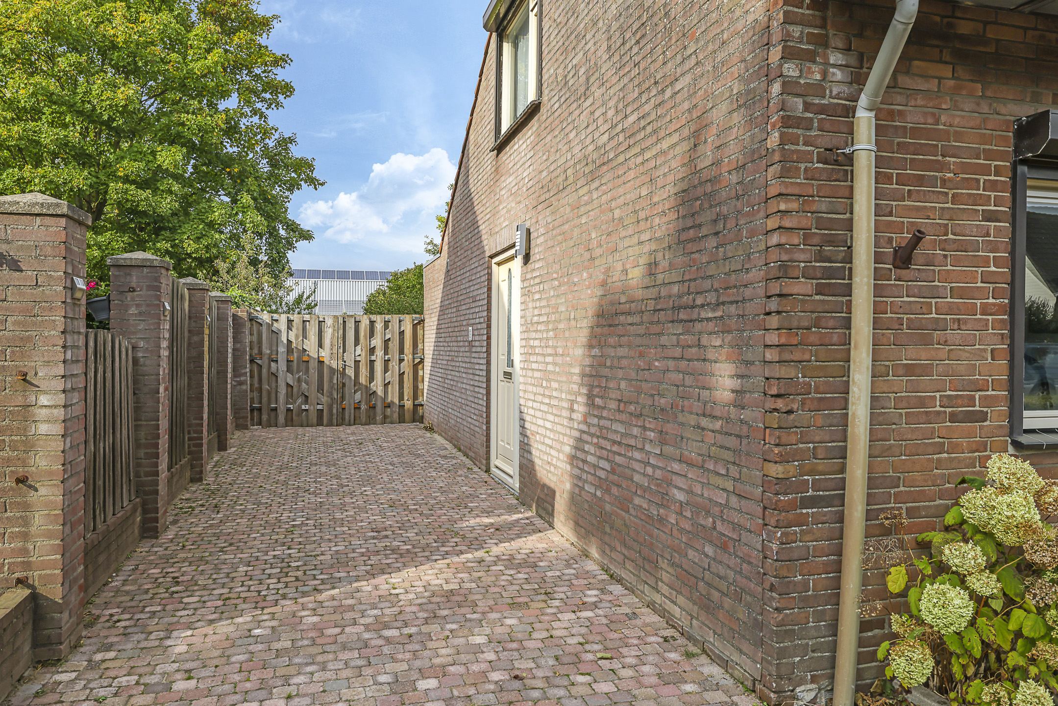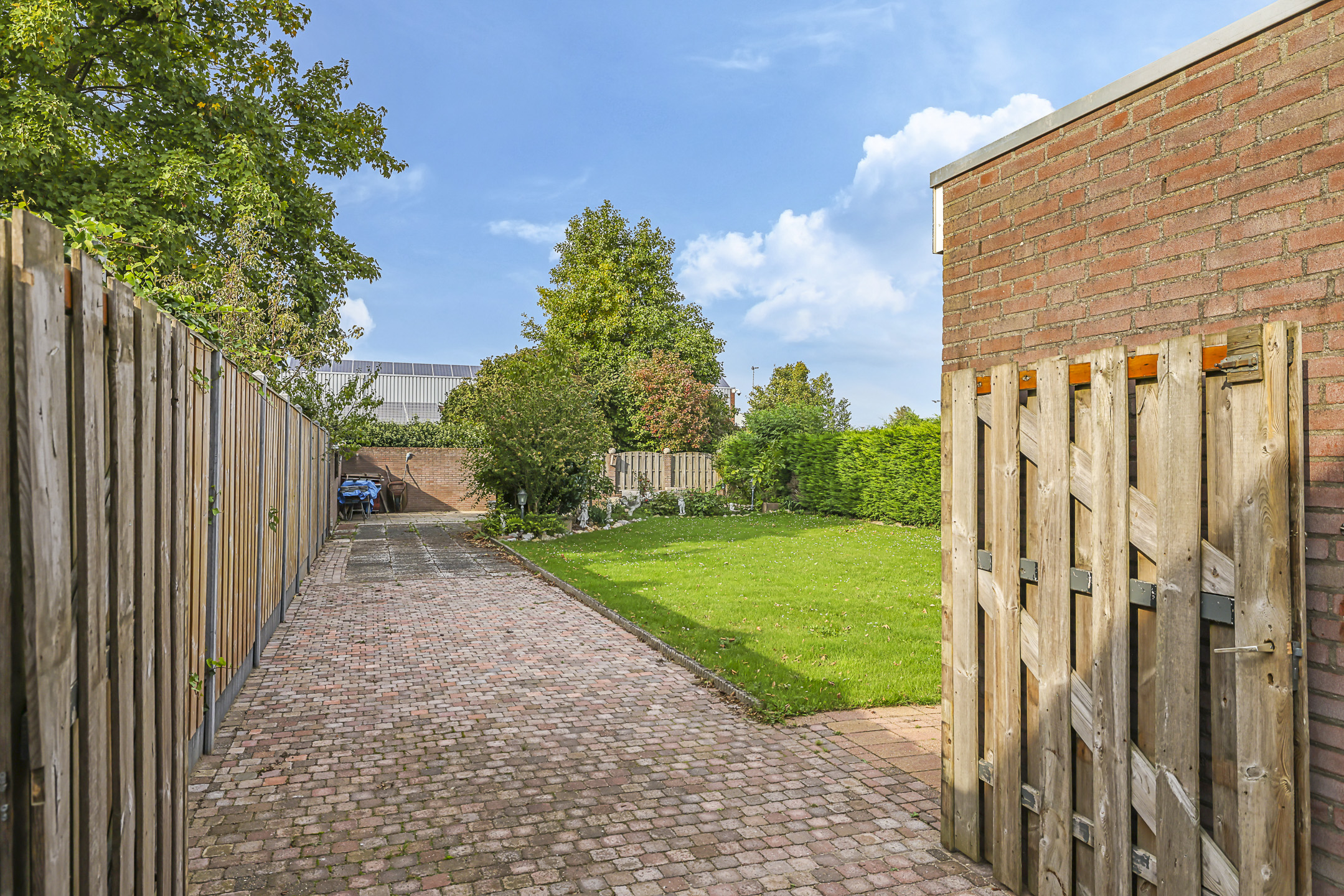 De grootte van het perceel biedt ook als voordeel dat je met gemak meerdere auto’s op eigen terrein kunt parkeren. Er is een diep oprit naast de woning aangelegd. Een dubbele poort schermt de achtertuin af, maar indien gewenst zou je met een auto, aanhanger of camper helemaal door kunnen rijden tot achterop het perceel. Het is bijna onwerkelijk maar je zou kunnen stellen dat je oprit maar liefst ca. 39 (!) meter diep is.