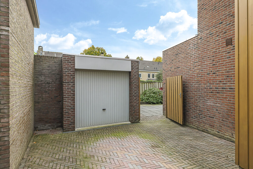 In de hoek van de tuin is een stenen garage gebouwd welke tevens is voorzien van elektra. Ideaal wanneer je een motor of fiets binnen wilt stallen, of juist wilt klussen. Aan de voorzijde biedt de garage via een kanteldeur toegang tot de oprit, aan de zijkant is een loopdeur aanwezig met toegang tot de tuin.