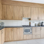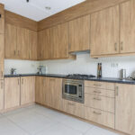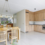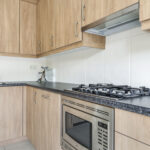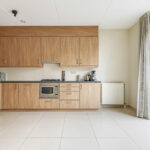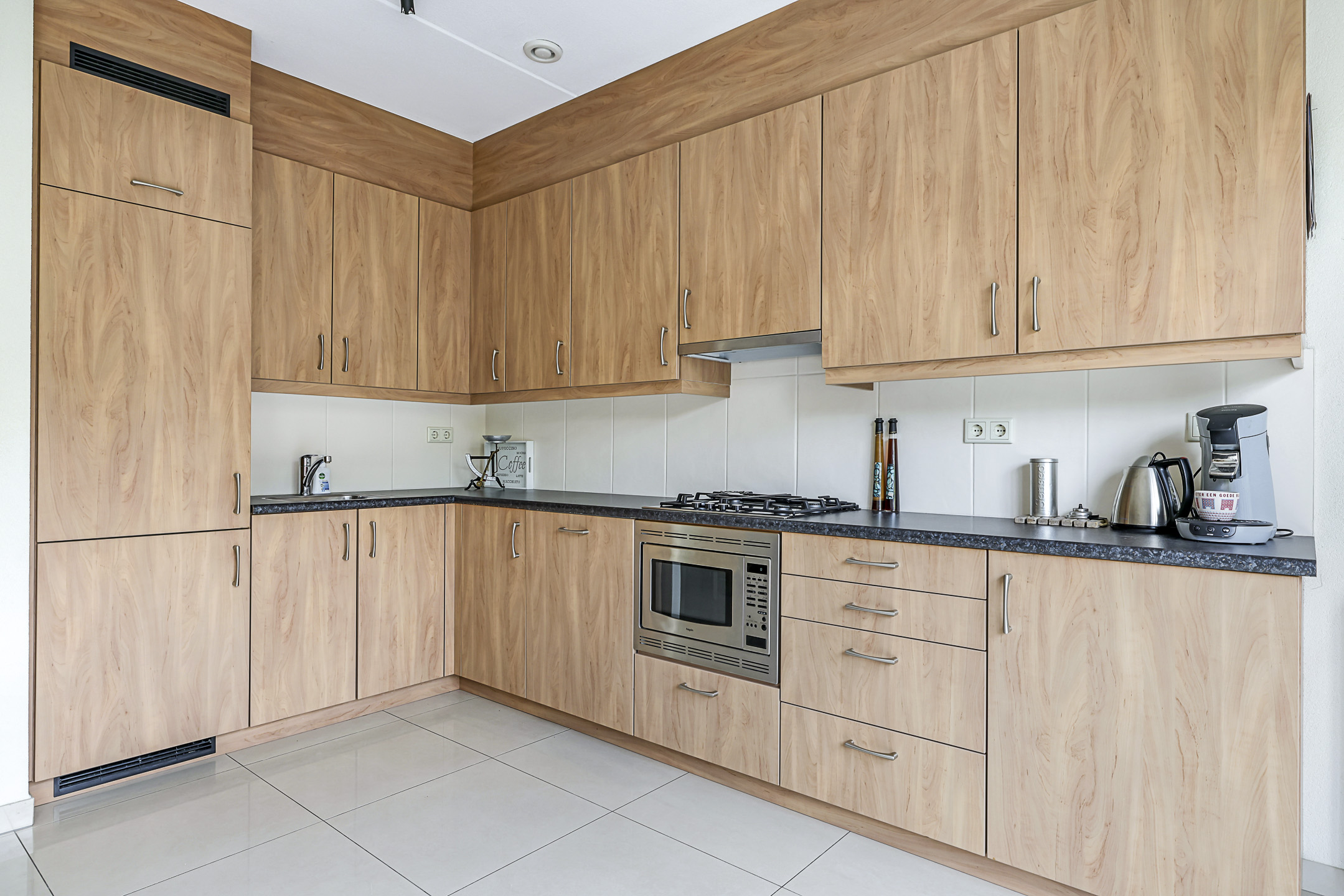 De keuken bevindt zich aan de achterzijde van de woning en is dus ook de ruimte waar de woning is uitgebouwd. Dit zorgt er niet alleen voor dat je er royale eethoek kan plaatsen, ook is het keukenblok uitgebreider dan normaal. De keuken is in een hoekopstelling geplaatst met bovenkasten wat zorgt voor veel werk- en opbergruimte. De aanwezige inbouwapparatuur bestaat uit een 4-pits gaskookplaat, een afzuigkap, een combi-oven/magnetron, een koel/vriescombinatie en een vaatwasser. In de keuken zet je de openslaande tuindeuren eenvoudig open waardoor je in de zomerdag binnen en buiten bij elkaar kunt betrekken.