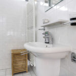 De laatste deur op de overloop is van de badkamer. Deze ruimte is ingedeeld met onder andere een inloopdouche, een wastafel en een 2e toilet (zwevend geplaatst). Ook de handdoekradiator ontbreekt niet in de ruimte. Een hooggeplaatst raam zorgt voor lichtinval en een ventilatiemogelijkheid. Ook is er mechanische ventilatie is aanwezig.