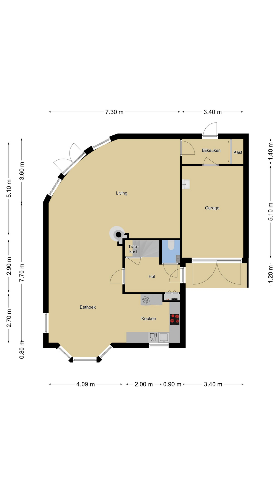 Maar liefst ca. 60m² aan leefruimte in de woonkamer zorgt ervoor dat je hier met een groot gezin prima kunt wonen. De living heeft een L-indeling met aan de voorzijde een erker en aan de achterzijde een kwartronde glaspui die door loopt tot aan de vloer. In deze pui zitten 2 openslaande deuren waardoor je een directe verbinding hebt met het buitenterras. Bovendien is de woning vanbinnen 7,3m breed waardoor je er ook met gemak een grote hoekbank kwijt kunt.