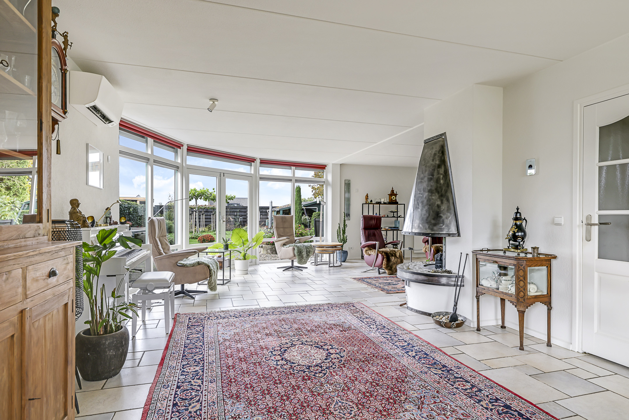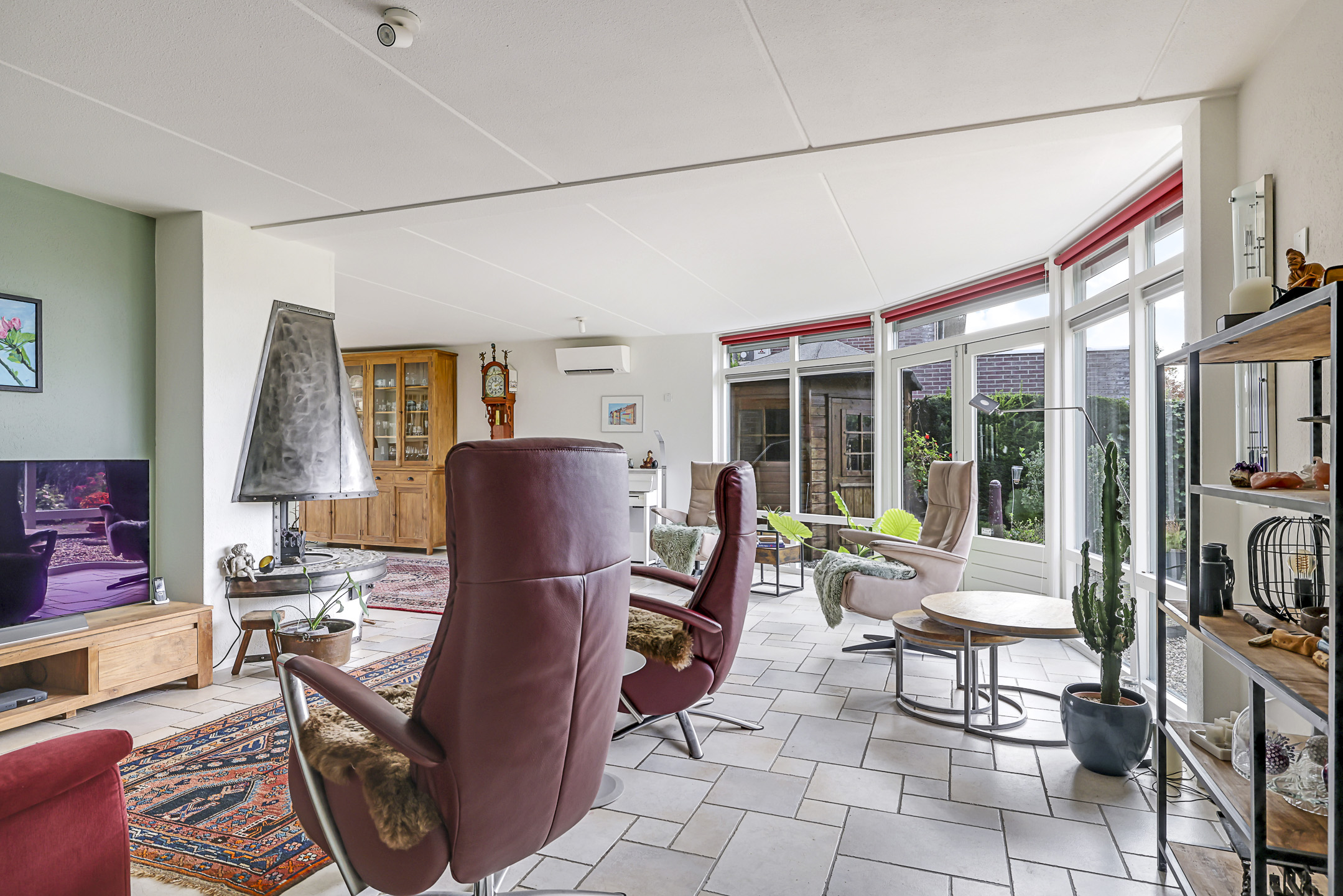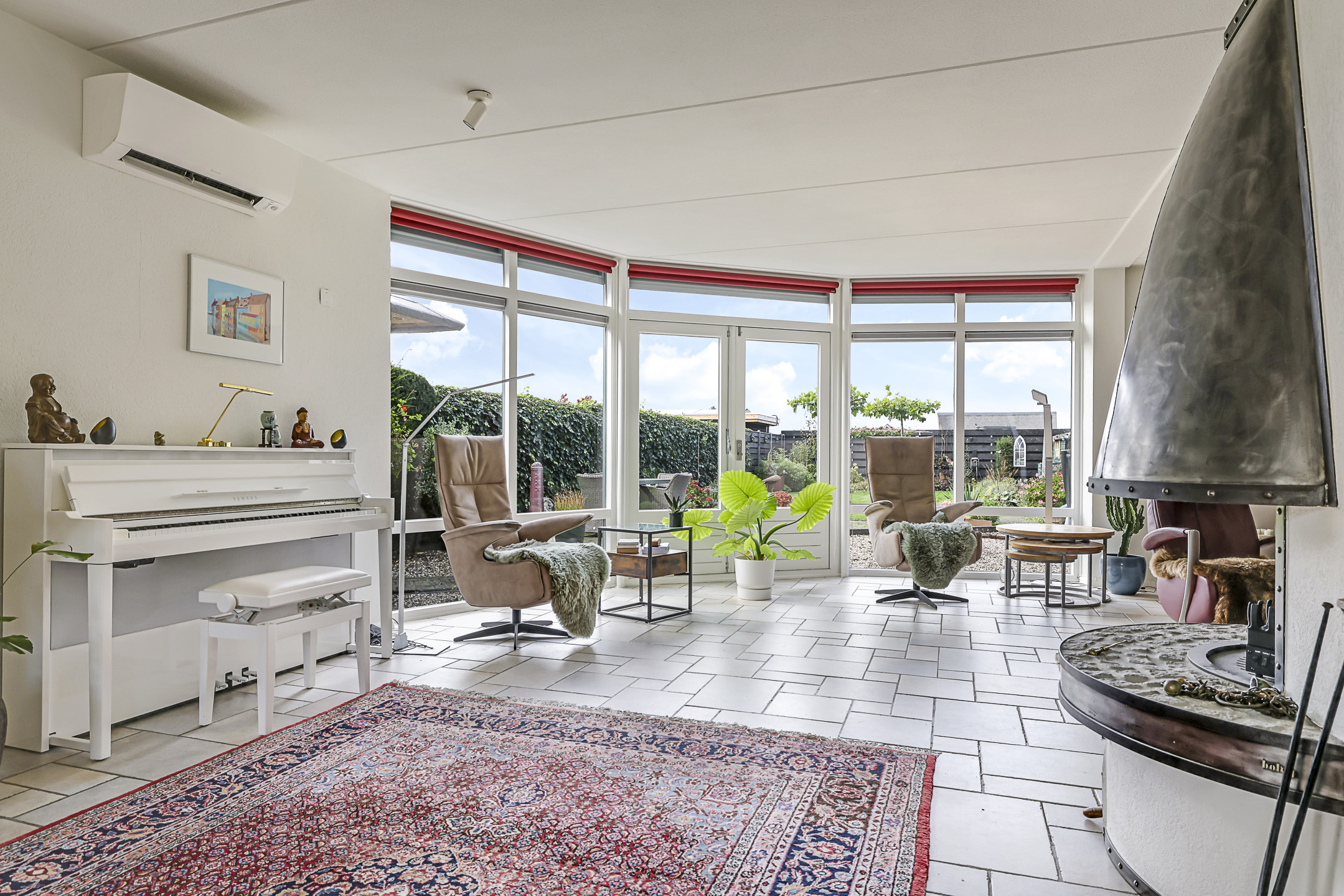 Centraal, op de hoek van de woonkamer, is een gashaard aanwezig. De tegelvloer is voorzien van vloerverwarming waardoor het altijd comfortabel aanvoelt. Diverse ramen zorgen voor een prettige lichtinval, waaronder de erker en de glaspui. In het voor- en najaar is het heerlijk om lekker achter het glas van de zon te genieten, maar in de zomer kan dit ook te warm zijn. Daarom is er een airco-unit geplaatst en zijn de ramen voorzien van stormvaste screens langs de ramen op (elektrisch bedienbaar).