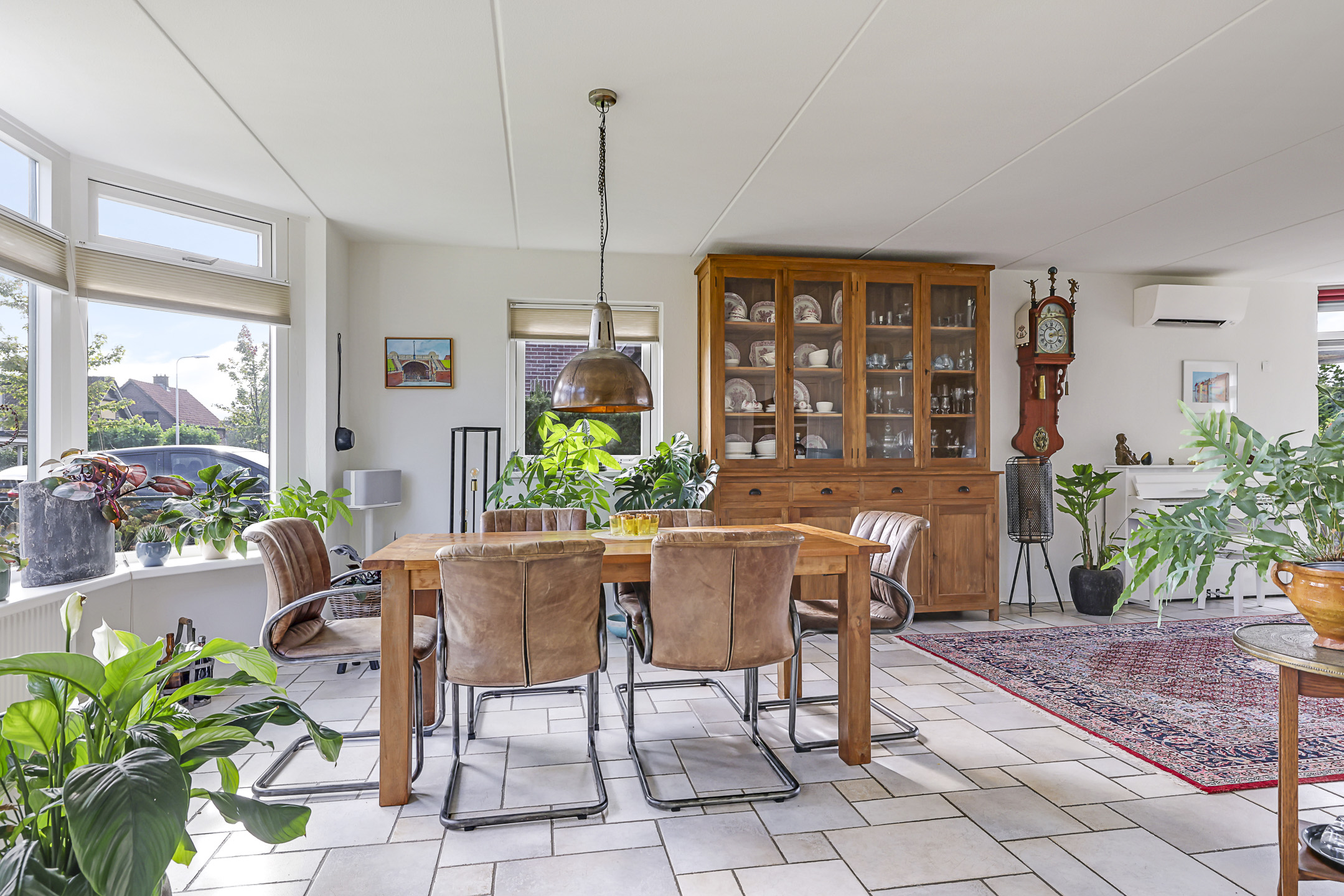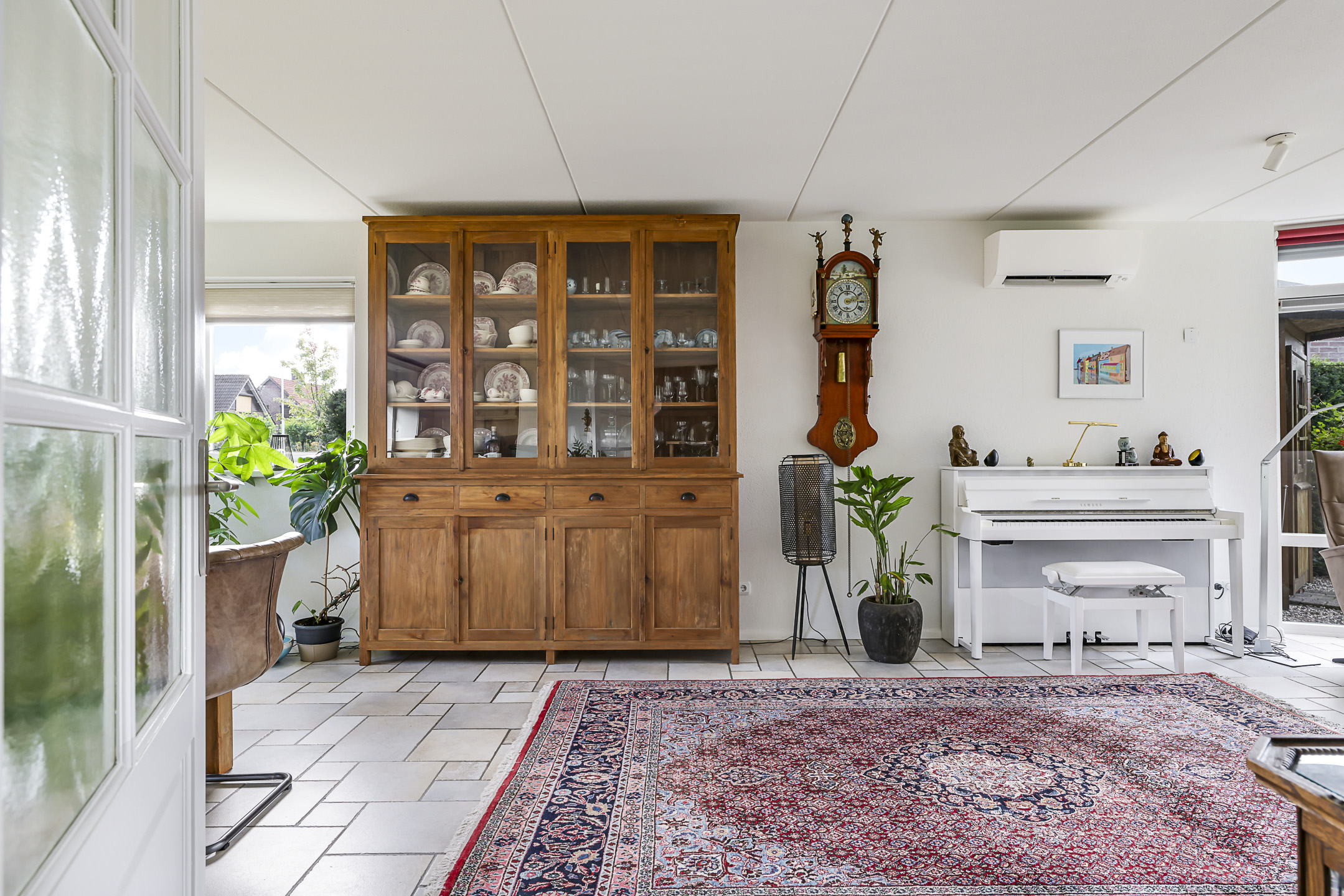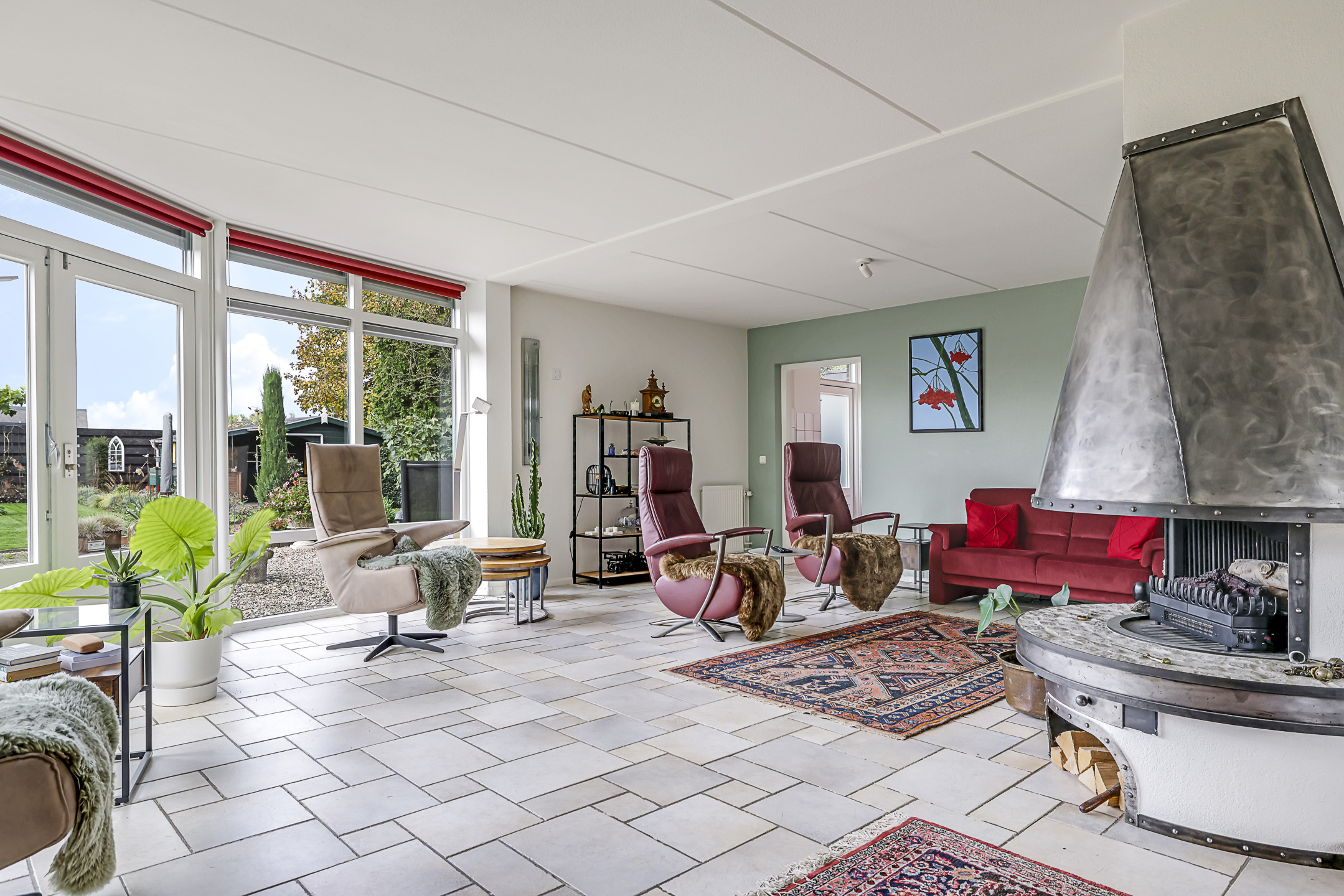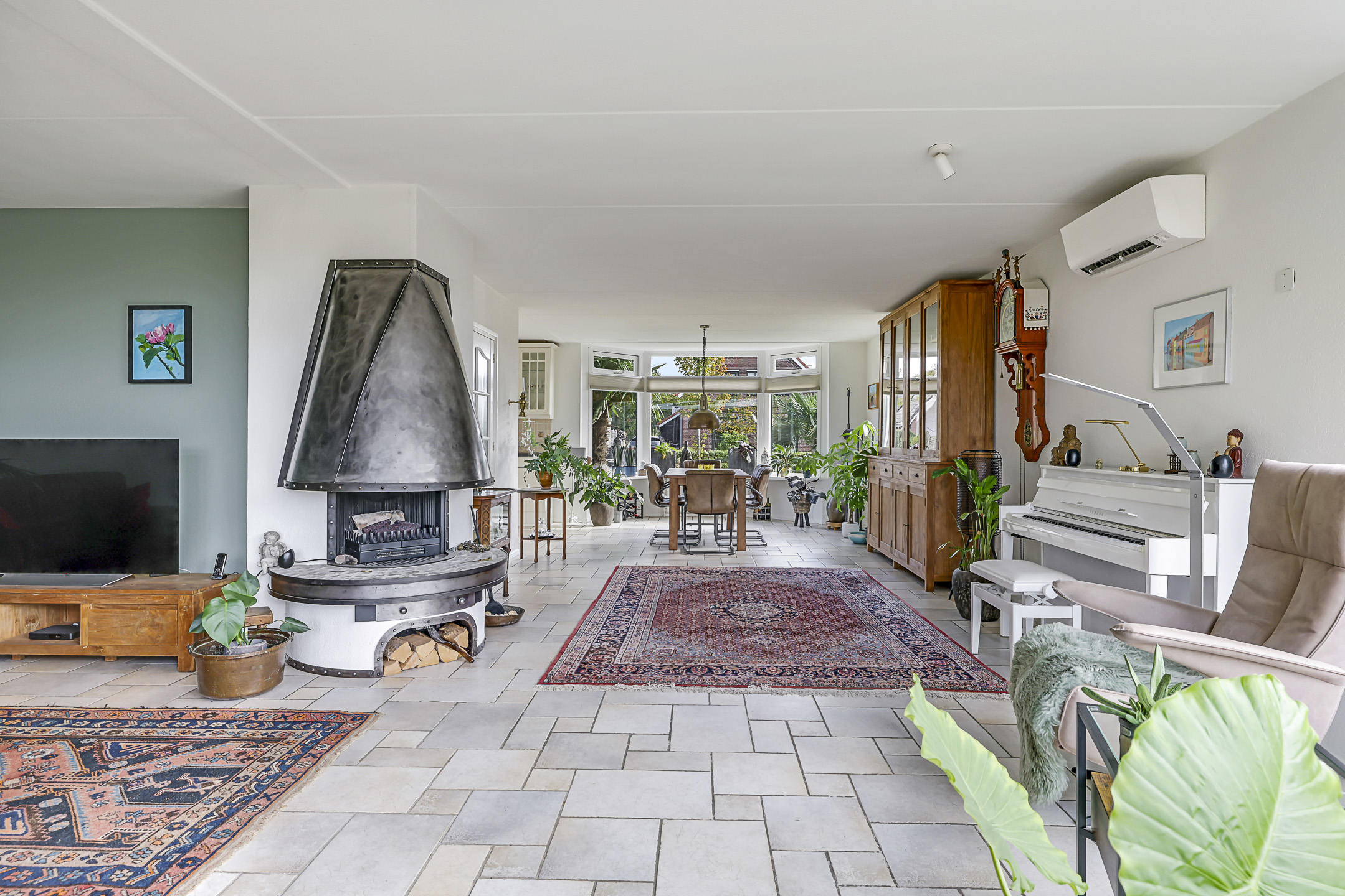 Centraal, op de hoek van de woonkamer, is een gashaard aanwezig. De tegelvloer is voorzien van vloerverwarming waardoor het altijd comfortabel aanvoelt. Diverse ramen zorgen voor een prettige lichtinval, waaronder de erker en de glaspui. In het voor- en najaar is het heerlijk om lekker achter het glas van de zon te genieten, maar in de zomer kan dit ook te warm zijn. Daarom is er een airco-unit geplaatst en zijn de ramen voorzien van stormvaste screens langs de ramen op (elektrisch bedienbaar).