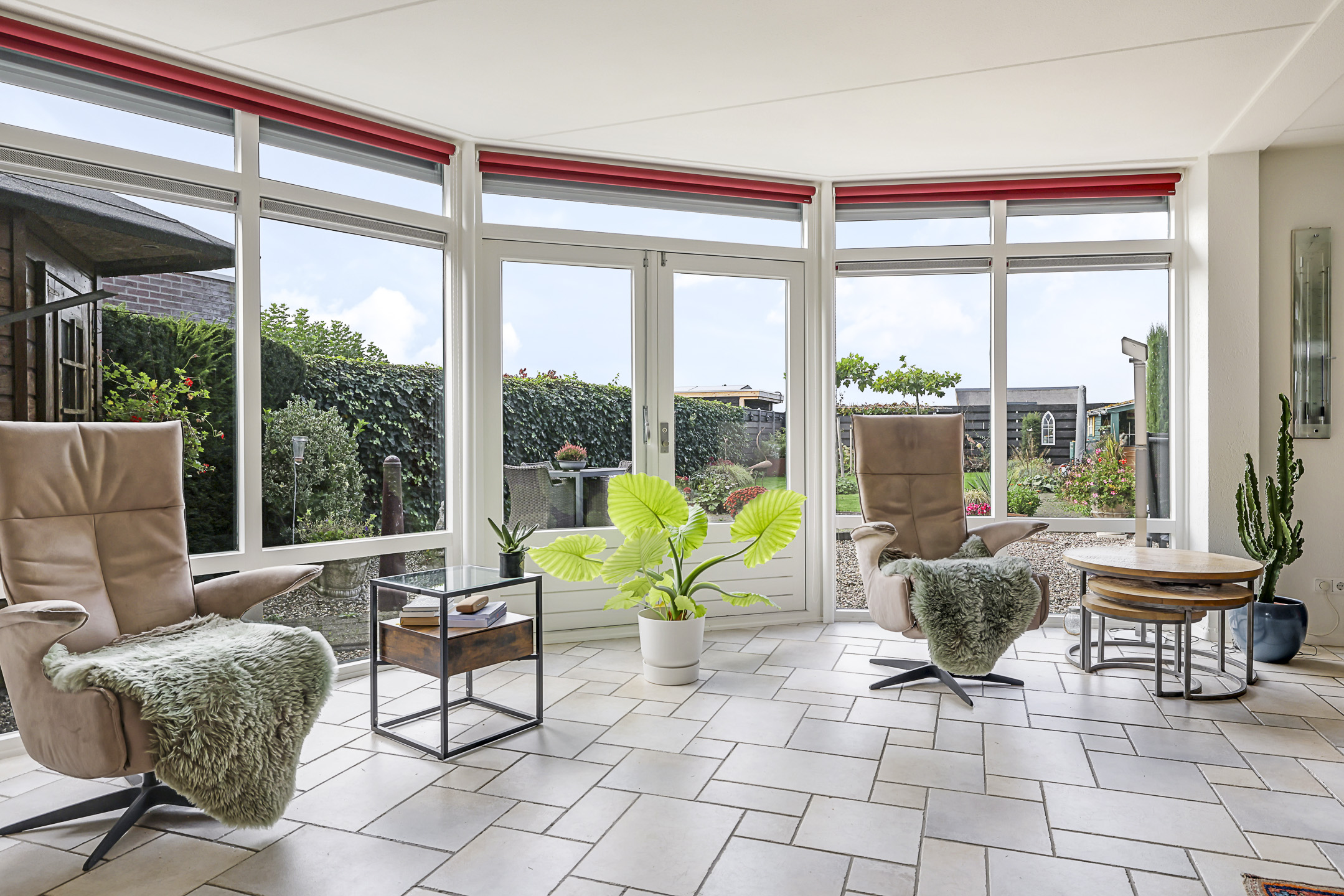 Stormvaste screens langs de glaspui in de woonkamer (elektrisch bedienbaar)
