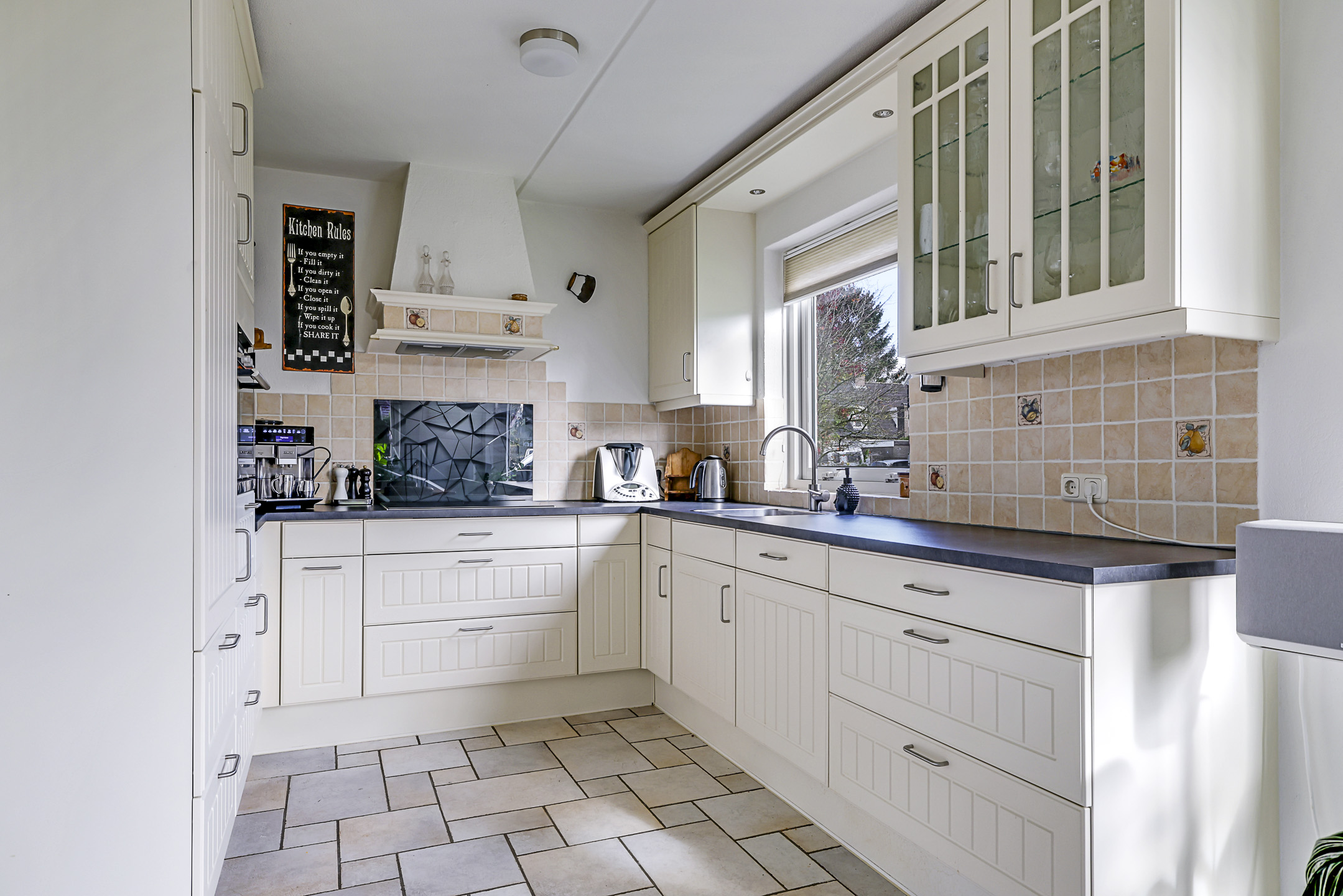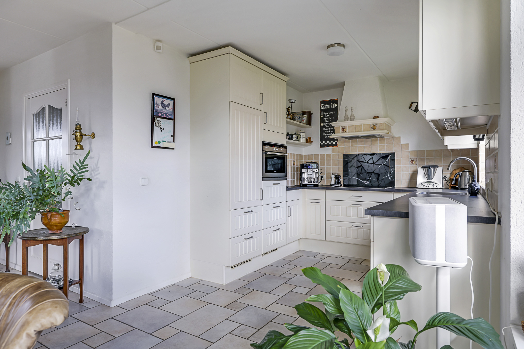 Grenzend aan de woonkamer is de keuken gelegen. Deze heeft een open karakter waarbij de keuken in een U-opstelling is geplaatst. De keuken heeft een landelijke stijl met lichte kleurstellingen. Het keukenblok heeft veel kastruimte en is voorzien van alle wenselijke inbouwapparatuur waaronder een vaatwasser, een combi-oven/magnetron, een koelkast, een inductie kookplaat en een afzuigschouw. Veel ruimte zit er onder andere in de diepe ladekorven. Wandschapjes, landelijke wandtegeltjes en inbouwspots maken de keuken compleet.