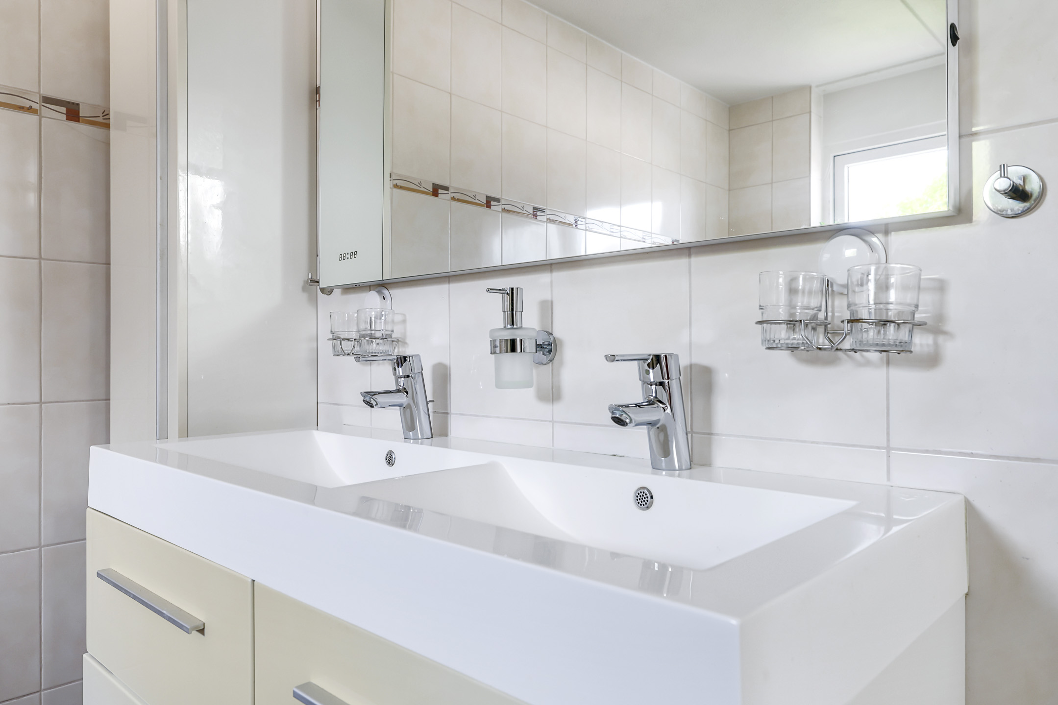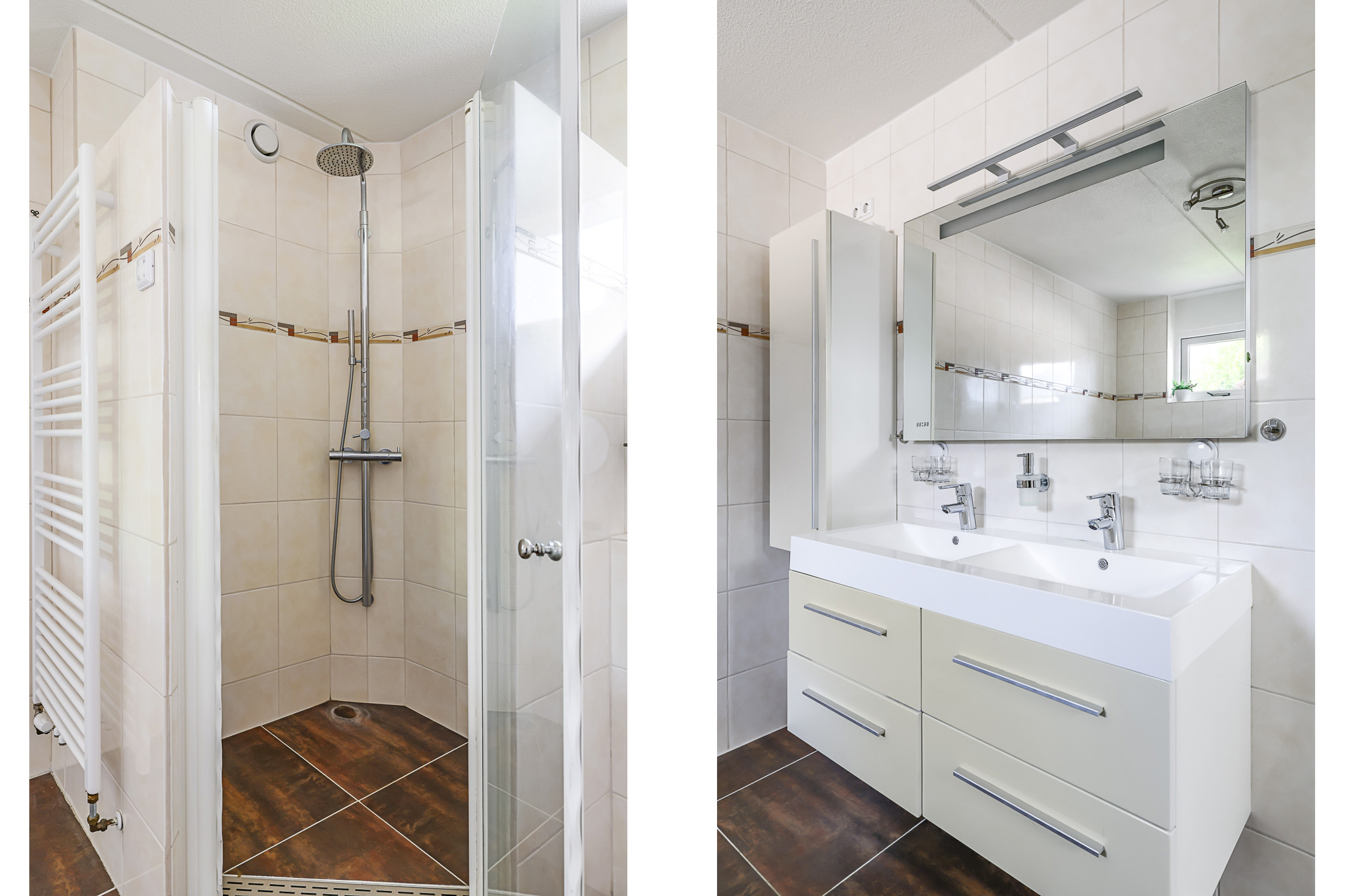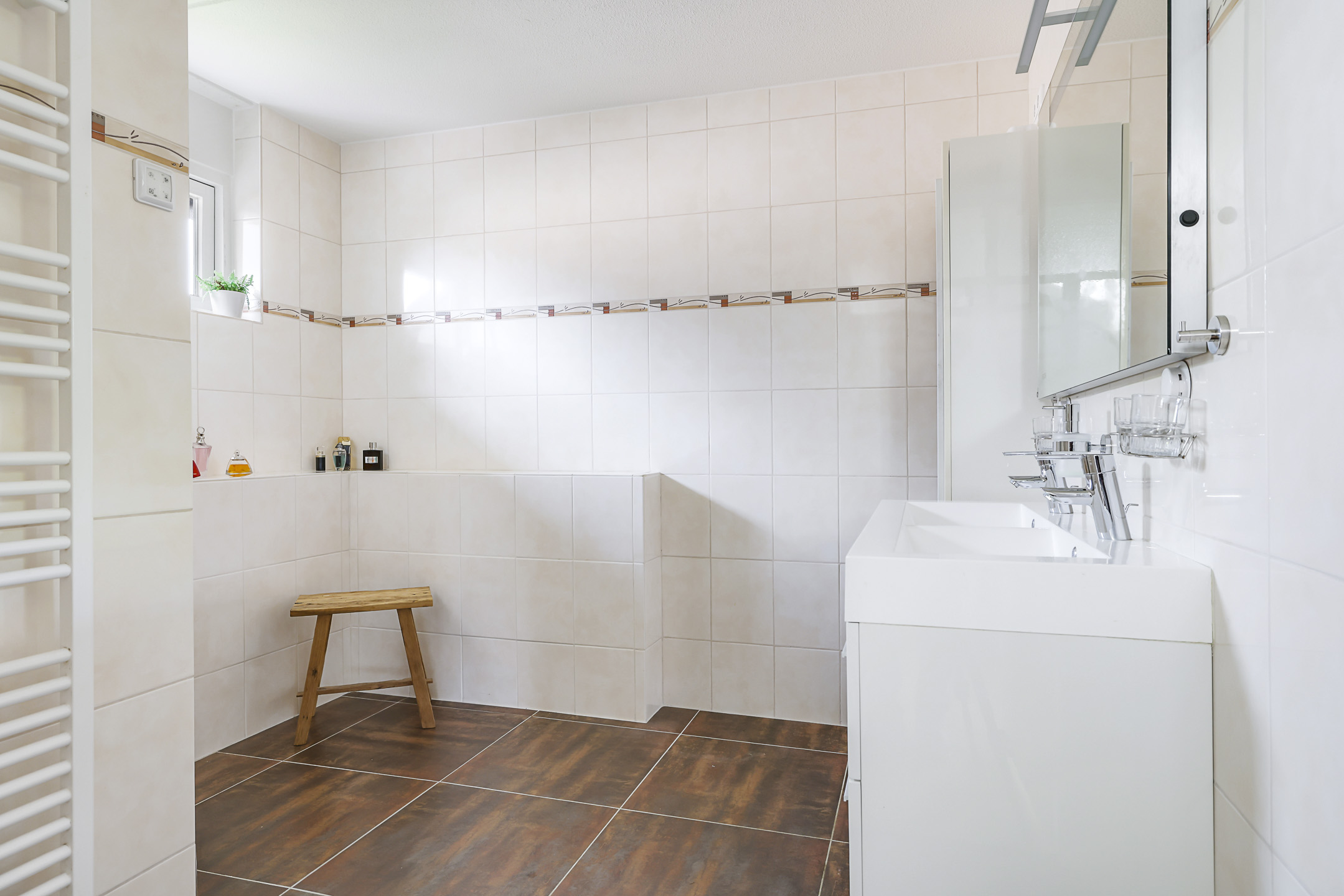 De badkamer is al eens vernieuwd met nieuw tegelwerk en sanitair. Zo is de ruimte ingedeeld met een inloopdouche en een 2-persoons wastafelmeubel met ladekorven. Boven het meubel hangt een grote spiegel welke is voorzien van verlichting. Naast het wastafelmeubel is nog een kolomkast met extra kastruimte geplaatst. Voorheen was er ook een bad aanwezig in de ruimte, mocht je het wensen dan zou je hier weer een bad kunnen plaatsen. Net als de begane grond is ook hier de tegelvloer voorzien van vloerverwarming op de cv. Koude voeten hoef je hier dus niet te krijgen. Verder zorgt een raampje voor daglicht en een ventilatiemogelijkheid. Uiteraard is de badkamer ook te ventileren met de mechanische ventilatie.