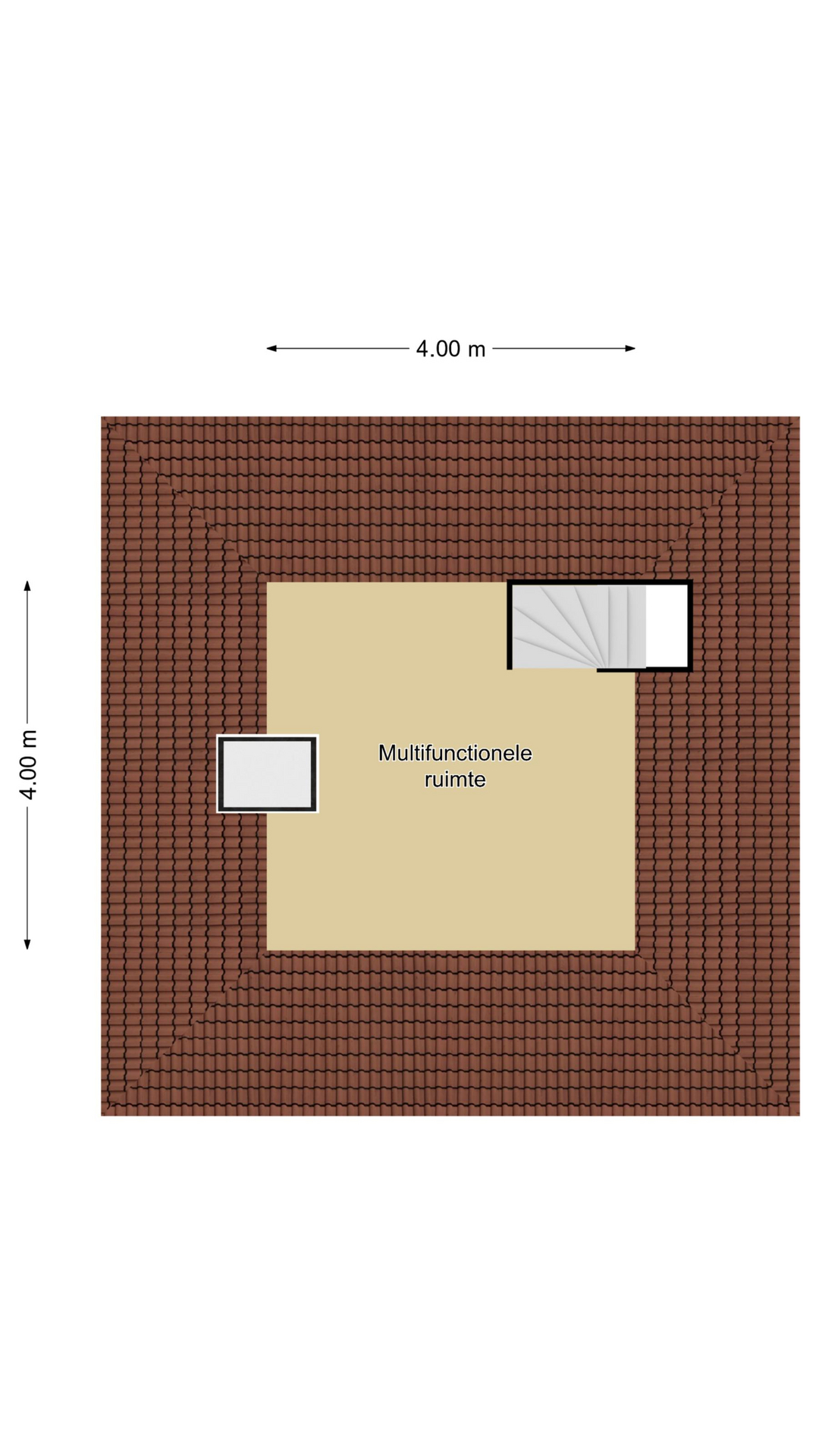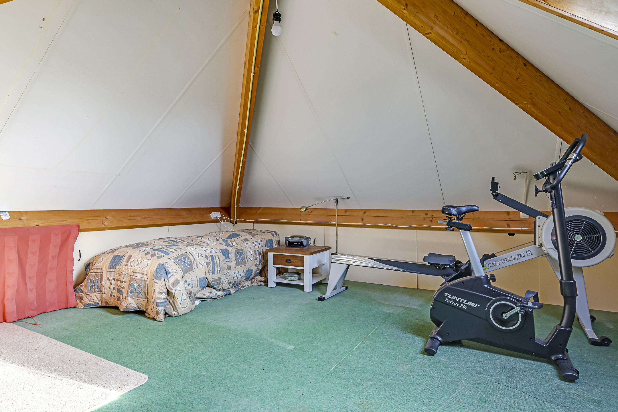 Via een 2e hardhouten trap bereiken we de 2e verdieping. Dit betreft een open ruimte waarbij duidelijk de contouren van het puntdak zichtbaar zijn. Ondanks de schuine dakvlakken is de leefruimte (vanaf 1,5m hoogte gemeten) nog steeds 4 meter bij 4 meter (16m²). Hierdoor leent deze woonlaag zich uitstekend voor het realiseren van een volwaardige, 5e slaapkamer. Er is al een dakvenster aanwezig voor de nodige lichtinval en de nok ligt op bijna 3 meter hoogte. Onder de schuine kanten zijn rondom knieschotten geplaatst waardoor je er diverse spullen kunt opbergen. Wat we nog wel eens zien is dat een dergelijke verdieping een houten constructievloer heeft, maar in dit geval betreft het een minder gehorige betonvloer.