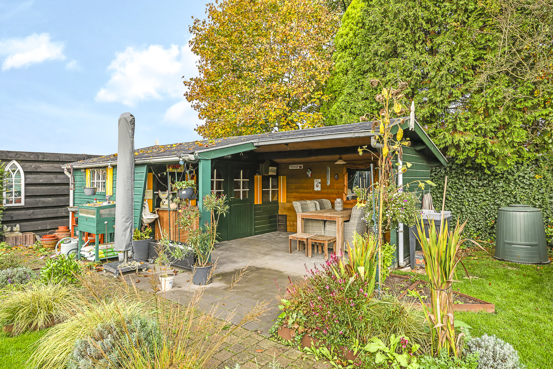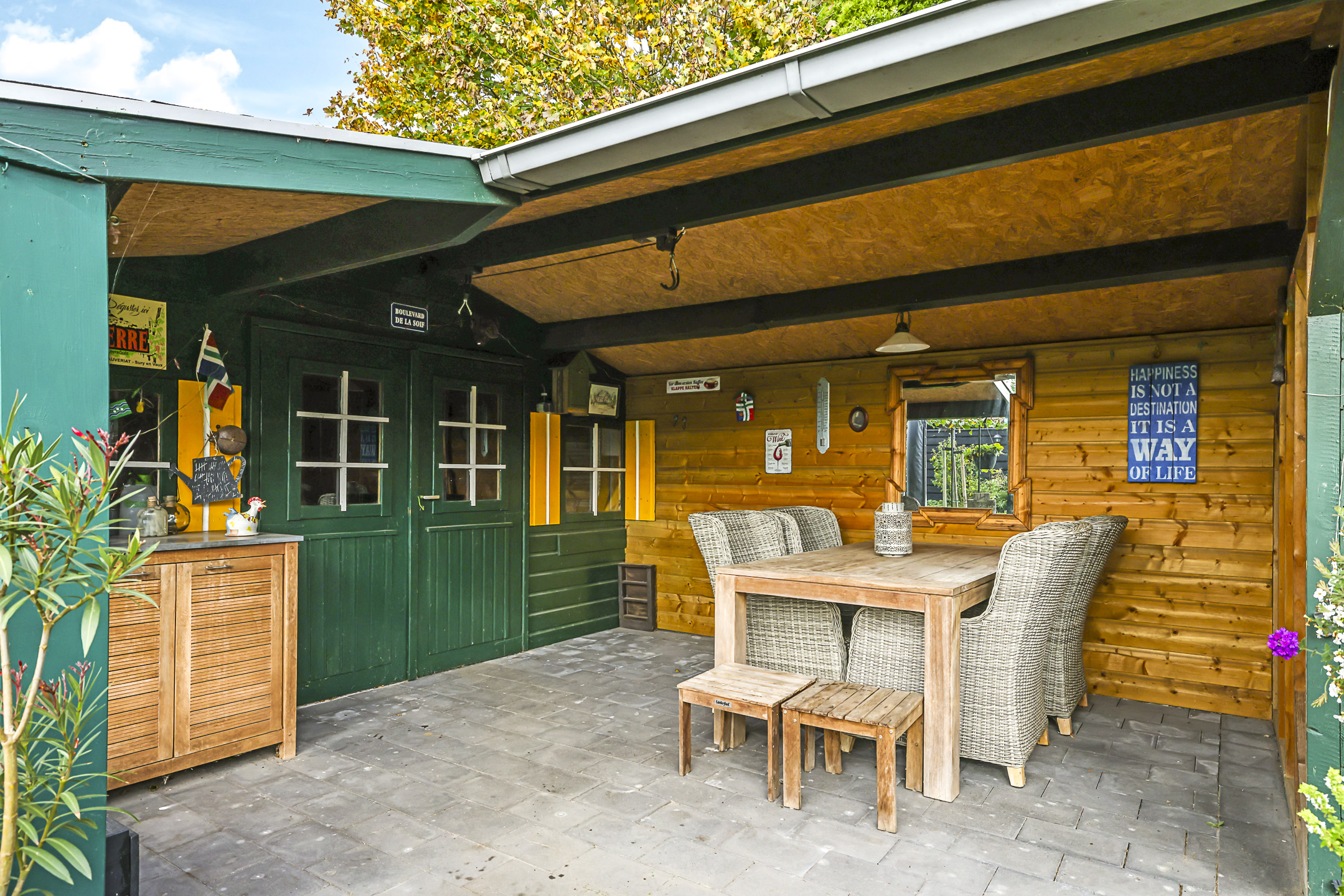 Veranda aan een tuinhuis voor een overdekte zithoek
