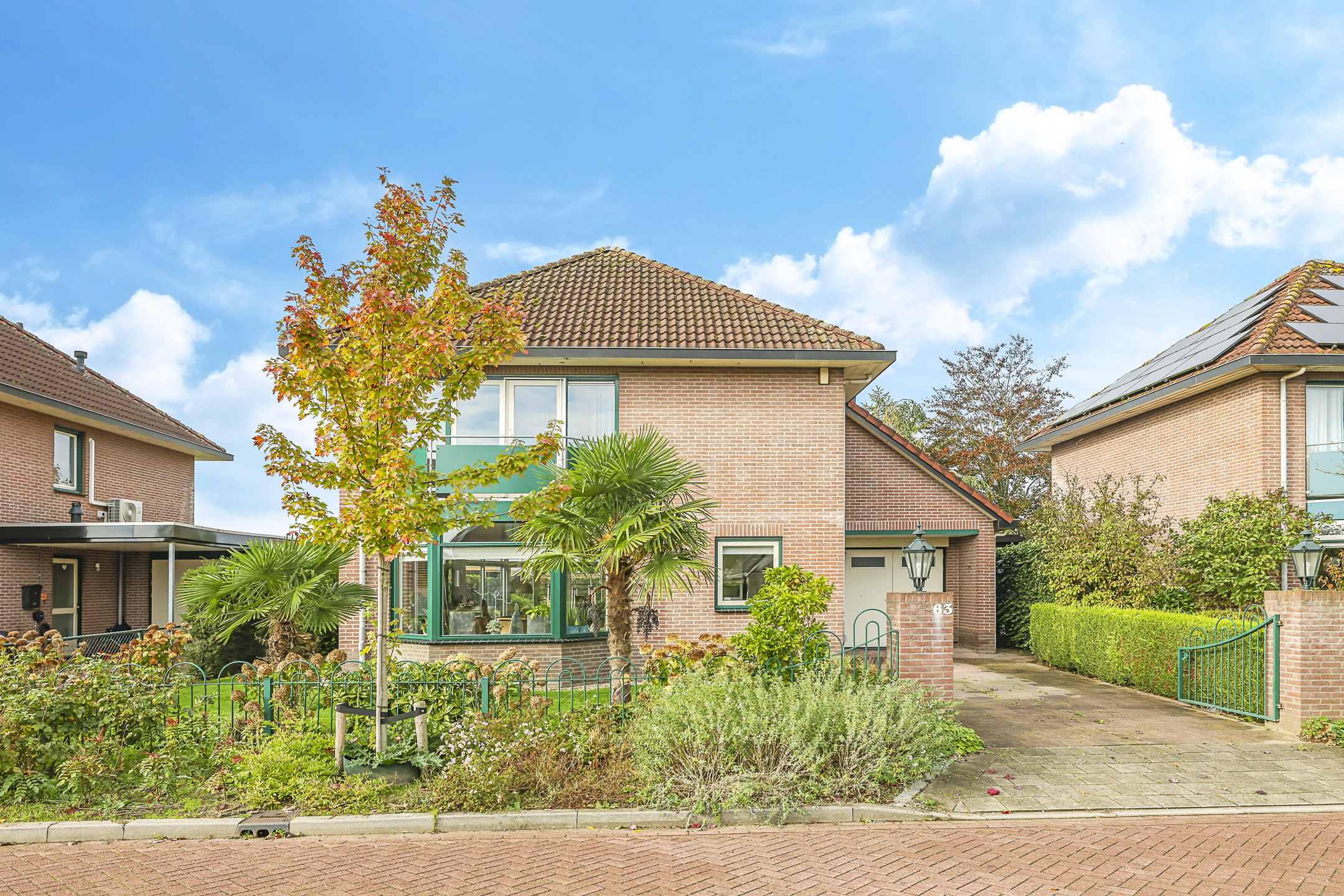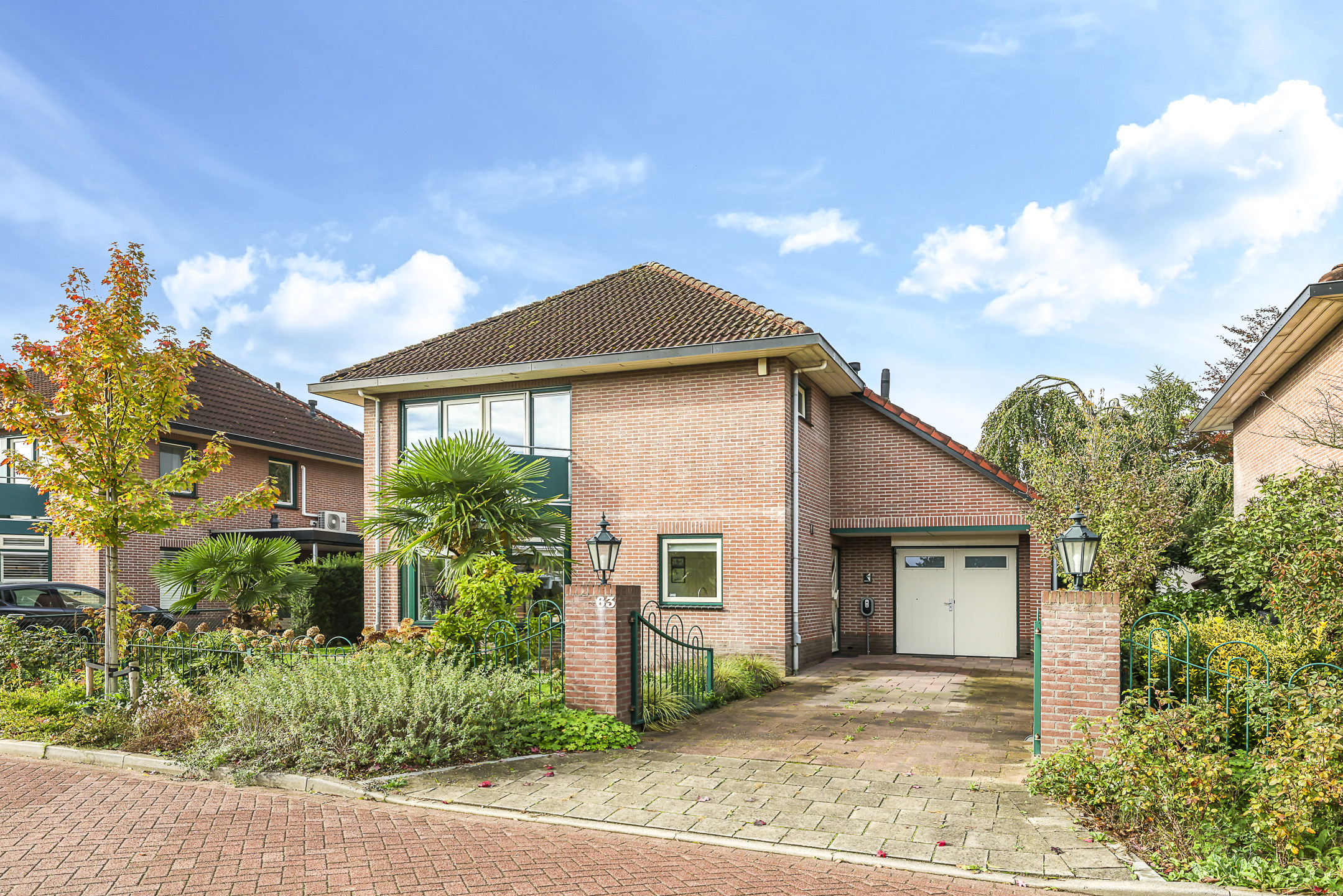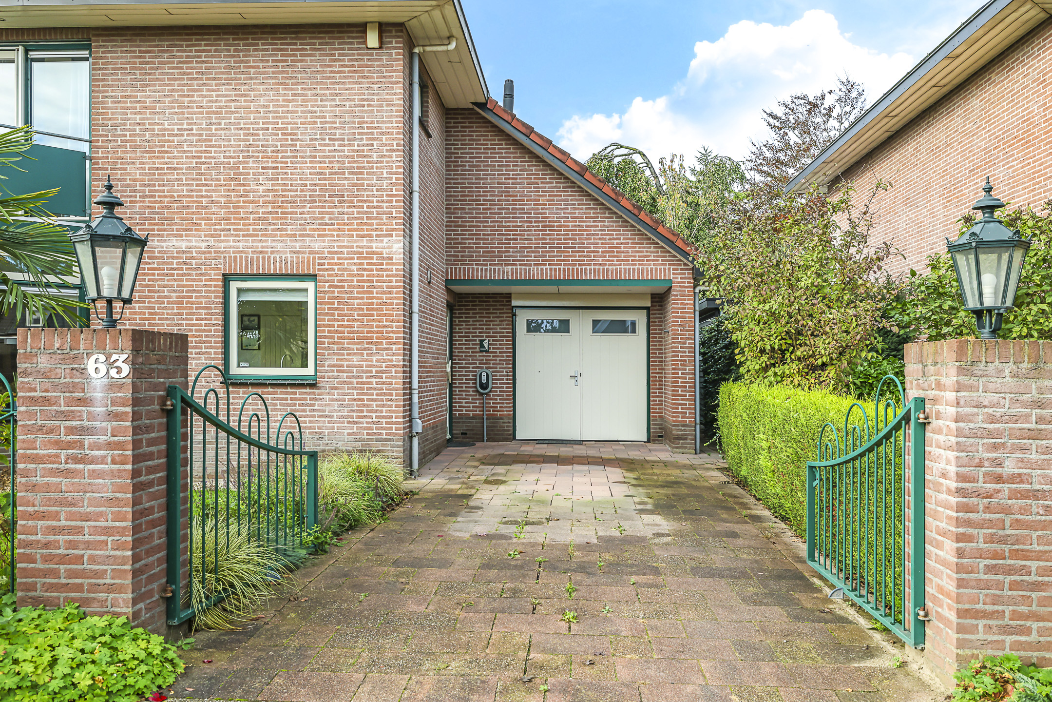Prettige oprit met luifel bij de voordeur en sierhekwerk/poort aan de straat