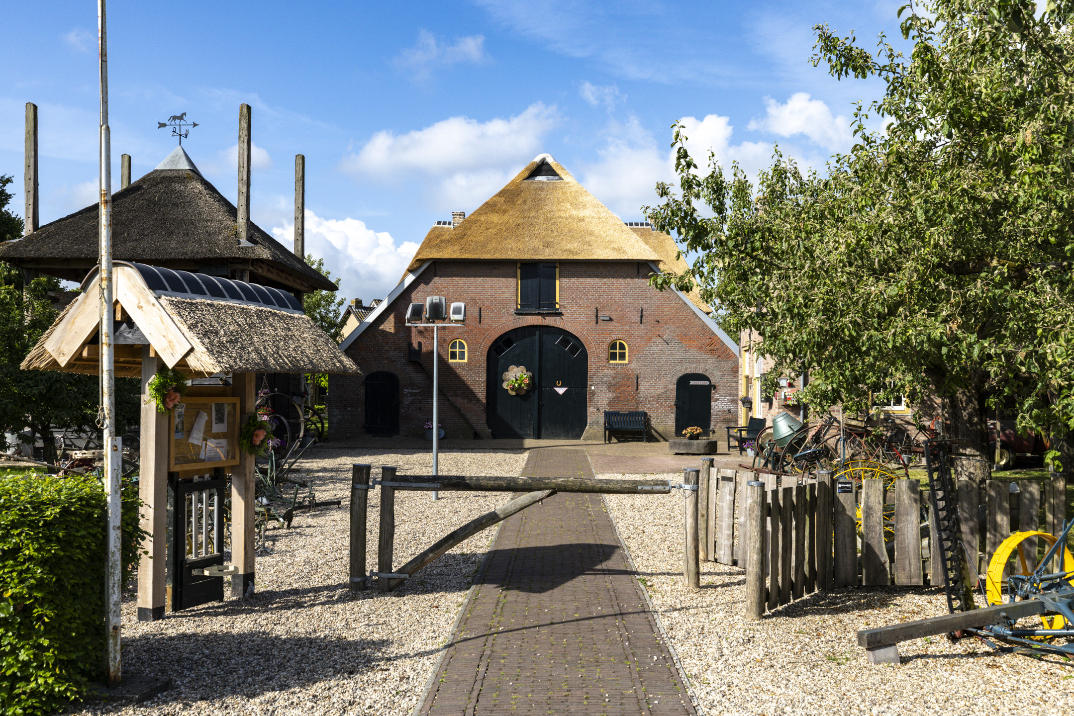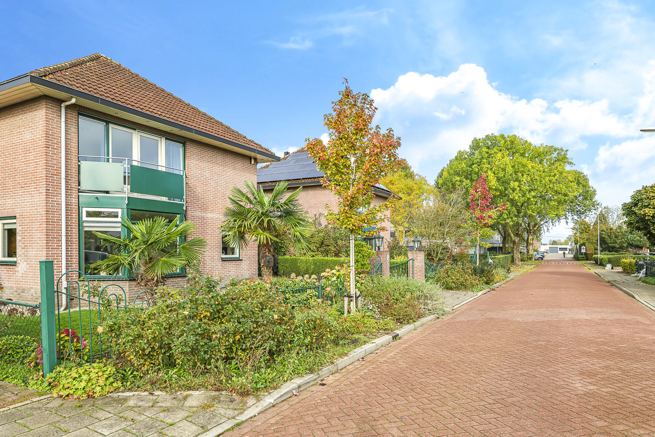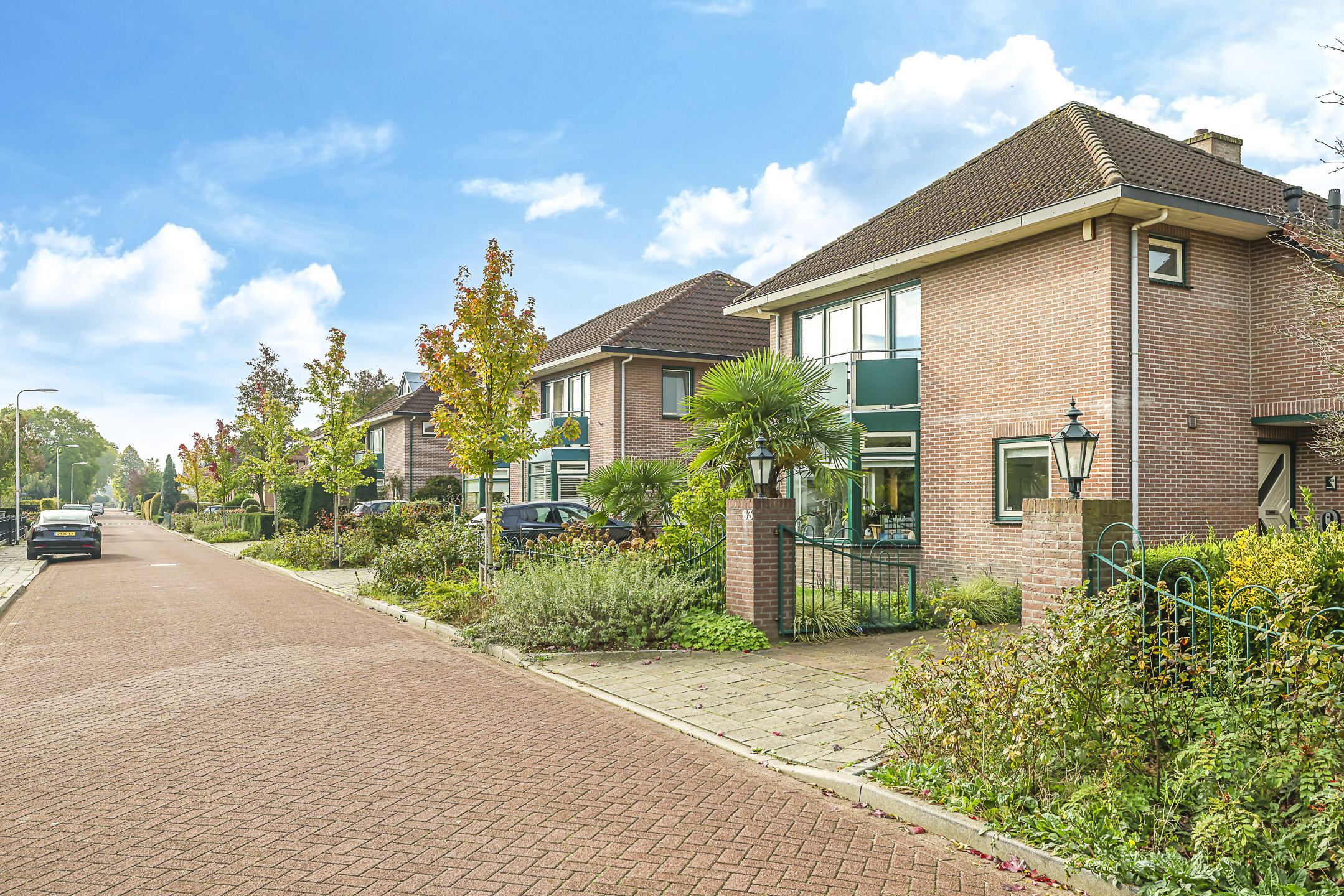 Prettige oprit met luifel bij de voordeur en sierhekwerk/poort aan de straat