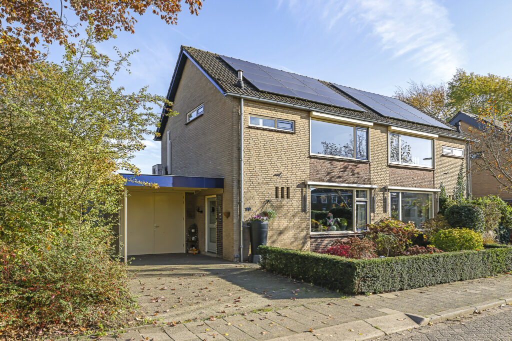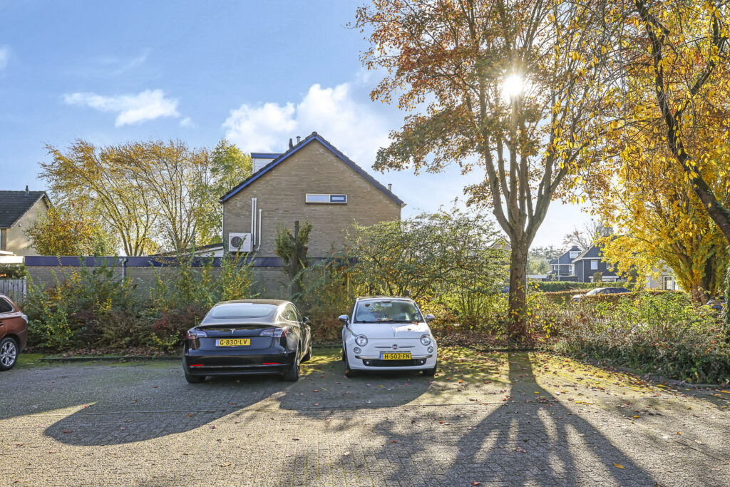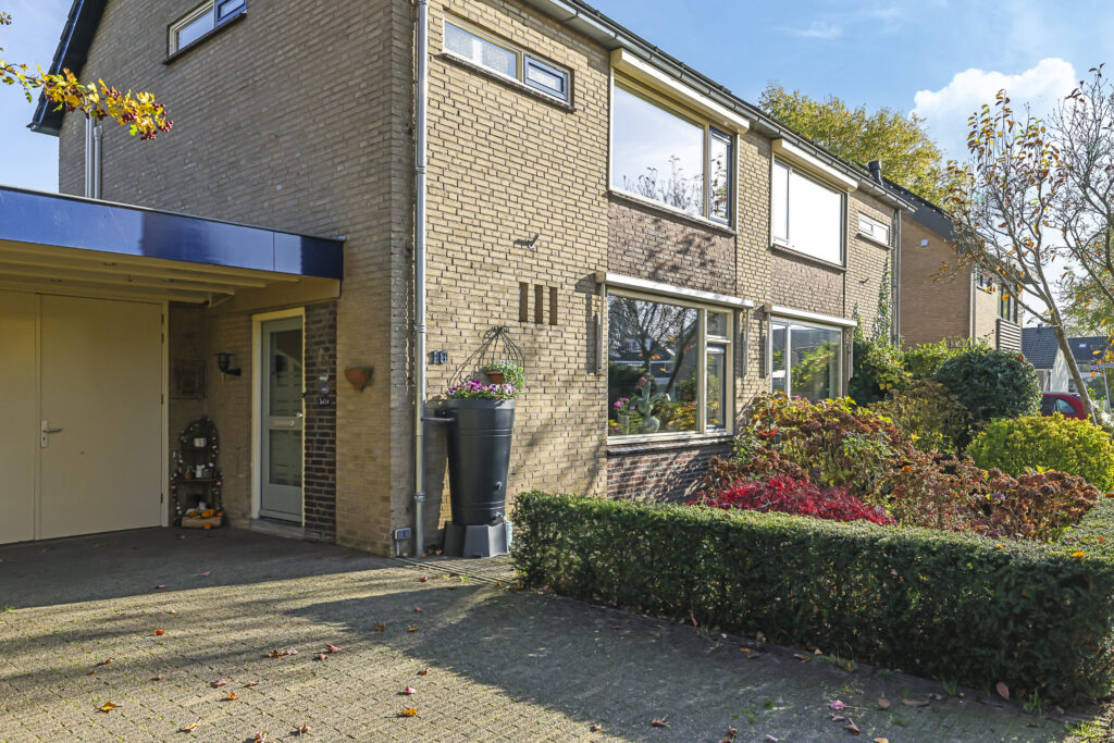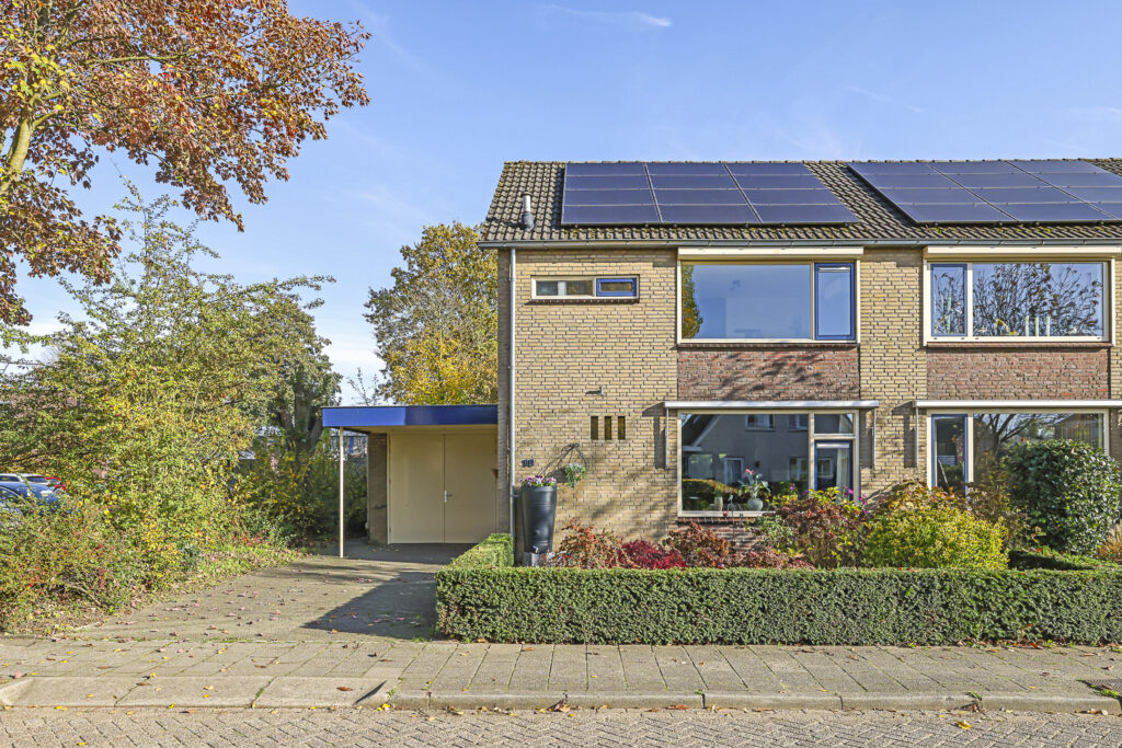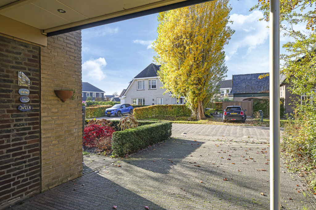 De voortuin biedt een oprit met parkeergelegenheid op eigen terrein. Nog een pluspunt is de ‘halve’ carport met inbouwspots waardoor je bij de voordeur altijd droog staat.
