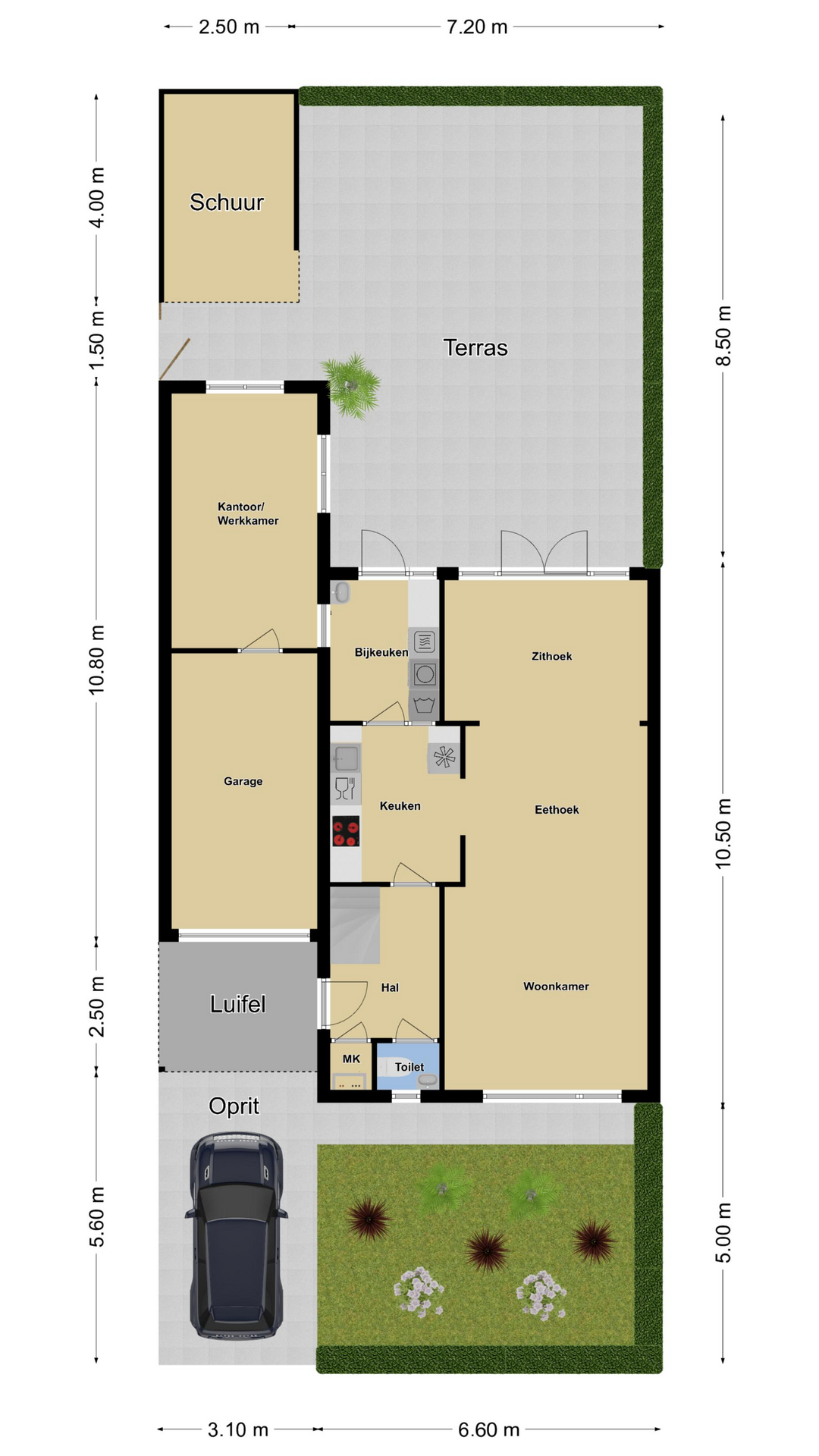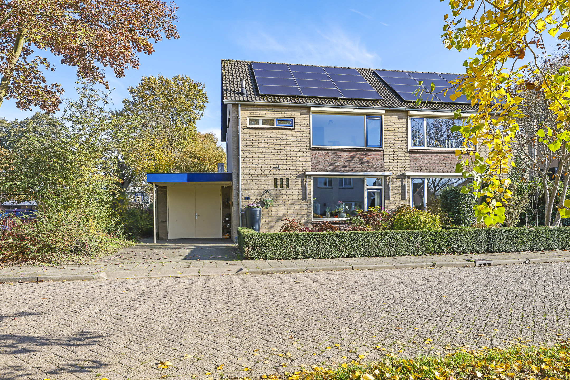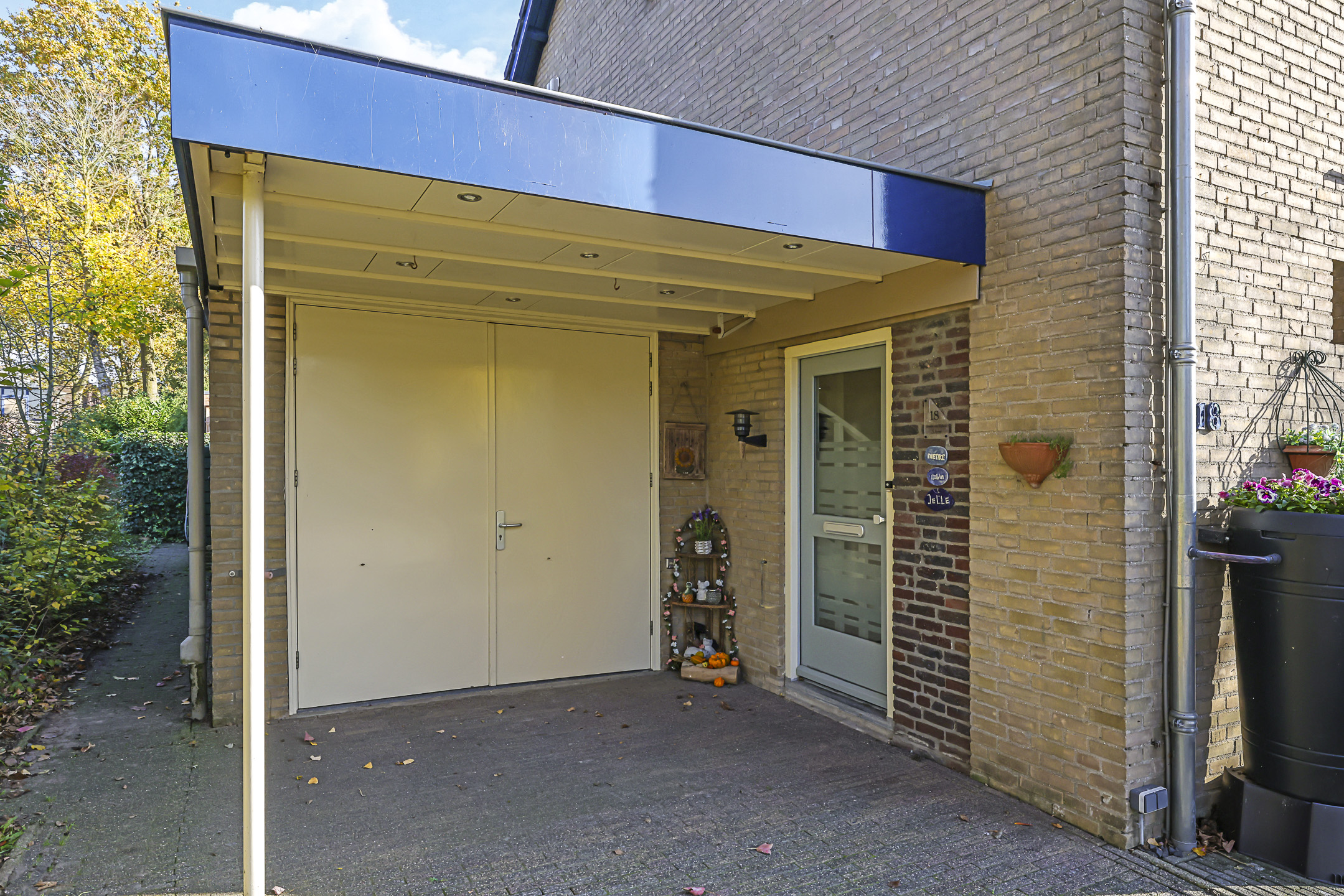 De voortuin biedt een oprit met parkeergelegenheid op eigen terrein. Nog een pluspunt is de ‘halve’ carport met inbouwspots waardoor je bij de voordeur altijd droog staat.