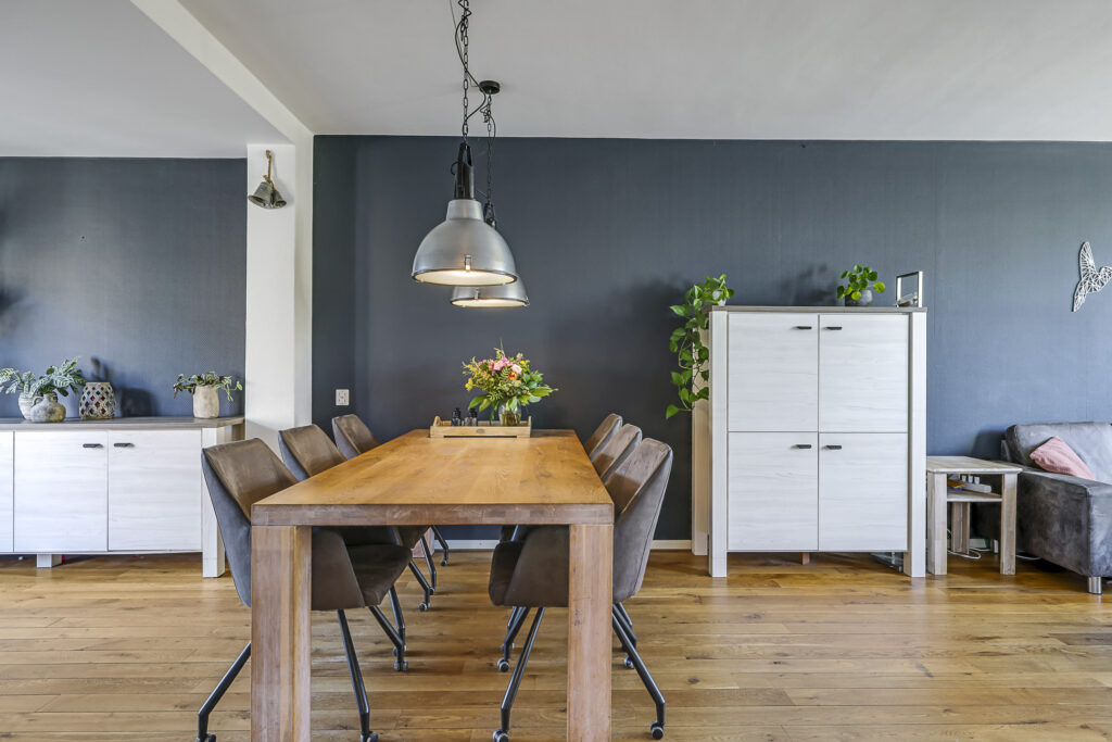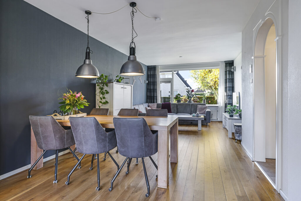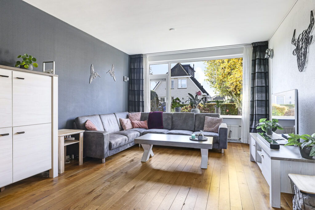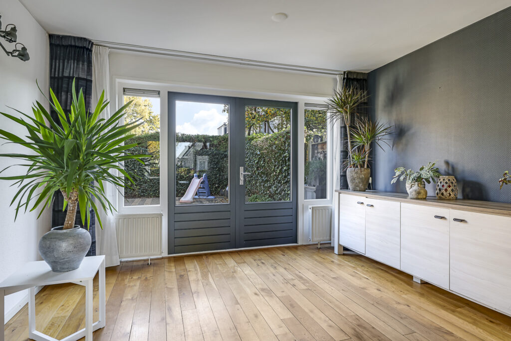 De woonkamer heeft een warme woonsfeer, mede door de eikenhouten vloer en de mogelijkheid om verschillende zithoeken te creëren. Zo biedt de aanbouw de mogelijkheid voor een speelhoek voor kinderen, het plaatsen van een piano of een bureau voor de studerende tiener. In de achtergevel zijn dubbele deuren geplaatst waardoor je eenvoudig het buitenleven bij de woning betrekt. Aan zowel de voor- als achtergevel is zonwering aangebracht.