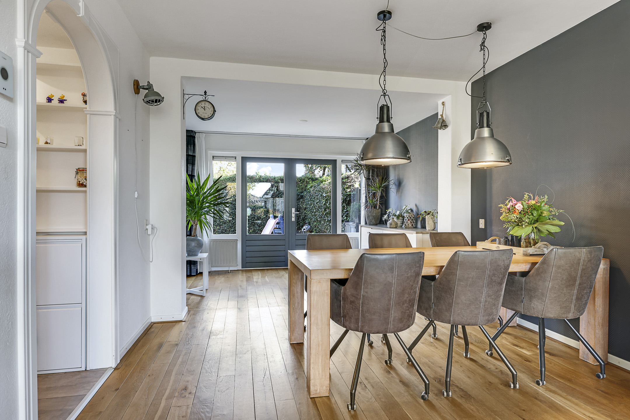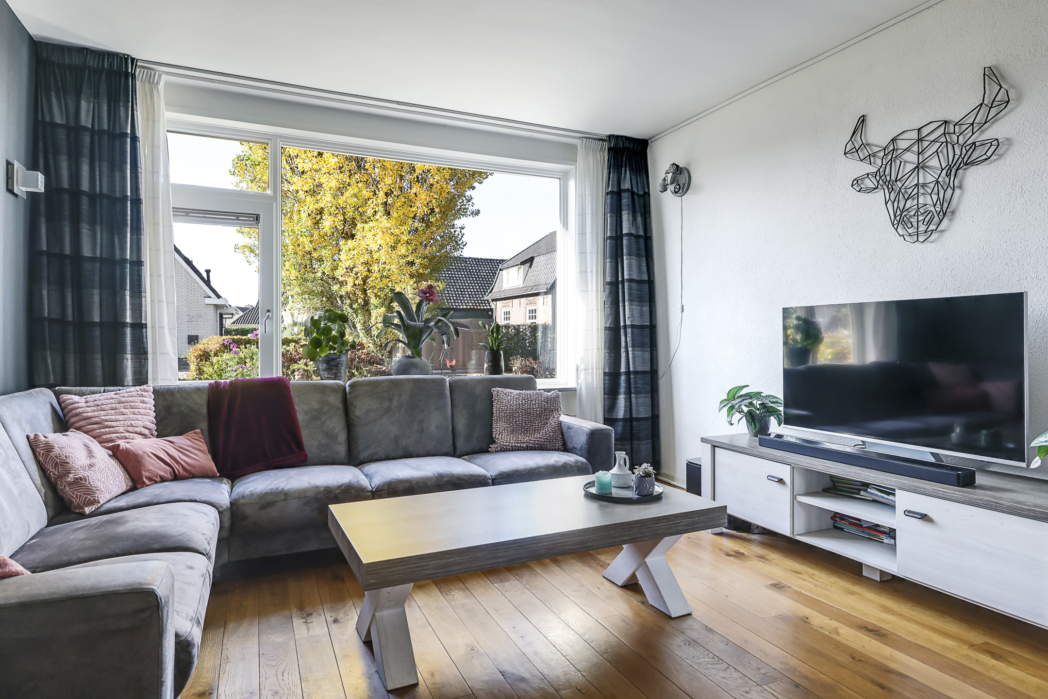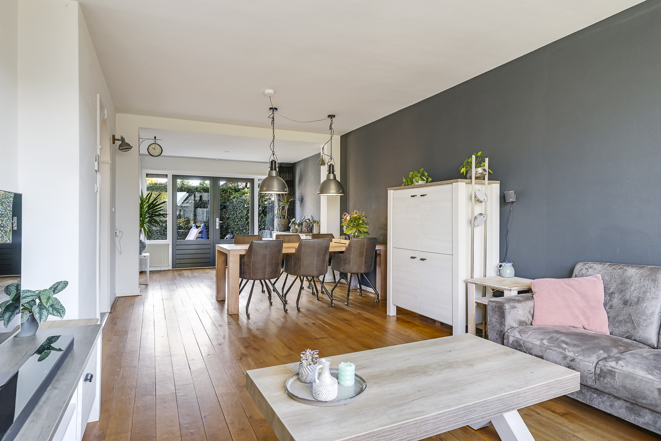 De woonkamer heeft een warme woonsfeer, mede door de eikenhouten vloer en de mogelijkheid om verschillende zithoeken te creëren. Zo biedt de aanbouw de mogelijkheid voor een speelhoek voor kinderen, het plaatsen van een piano of een bureau voor de studerende tiener. In de achtergevel zijn dubbele deuren geplaatst waardoor je eenvoudig het buitenleven bij de woning betrekt. Aan zowel de voor- als achtergevel is zonwering aangebracht.