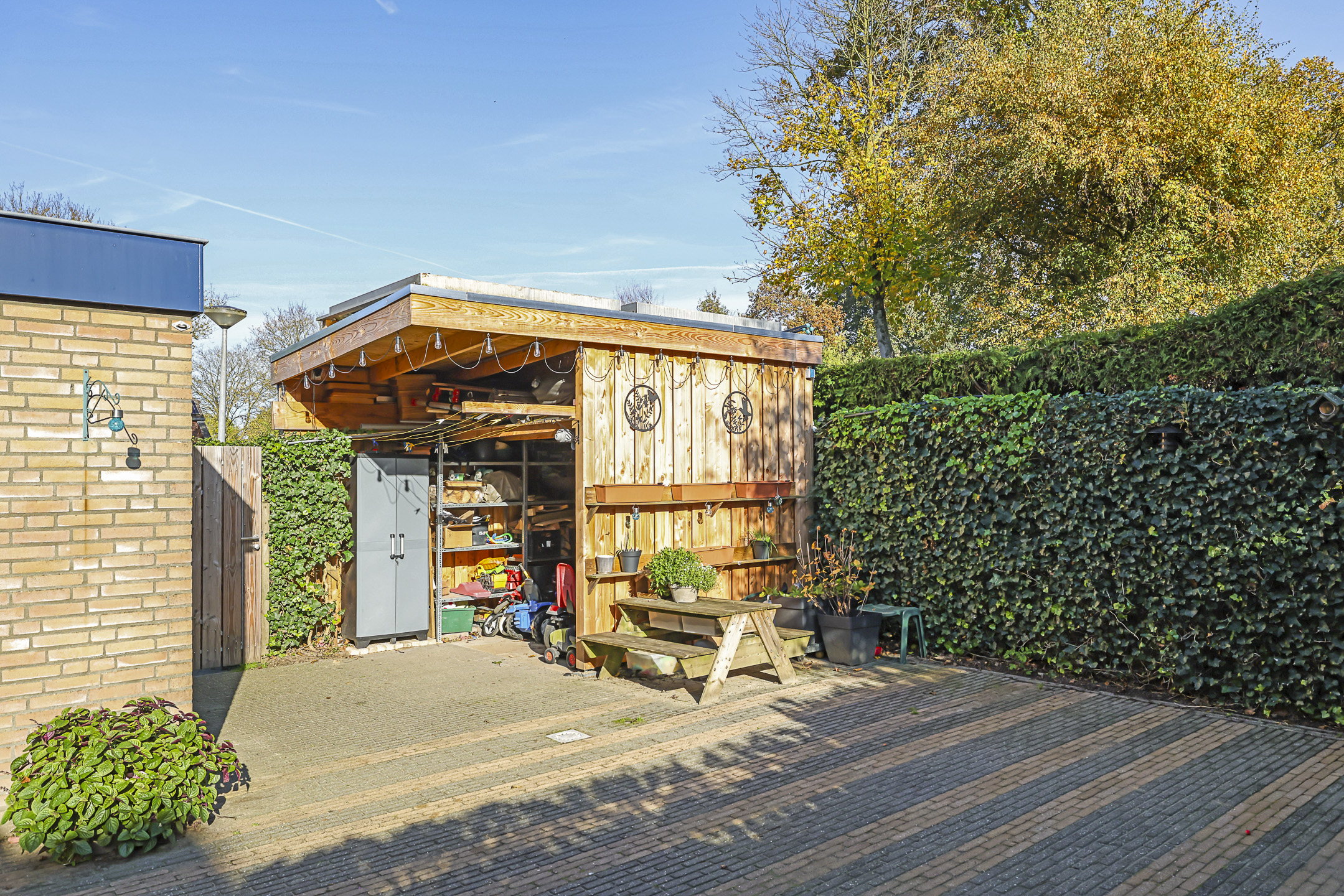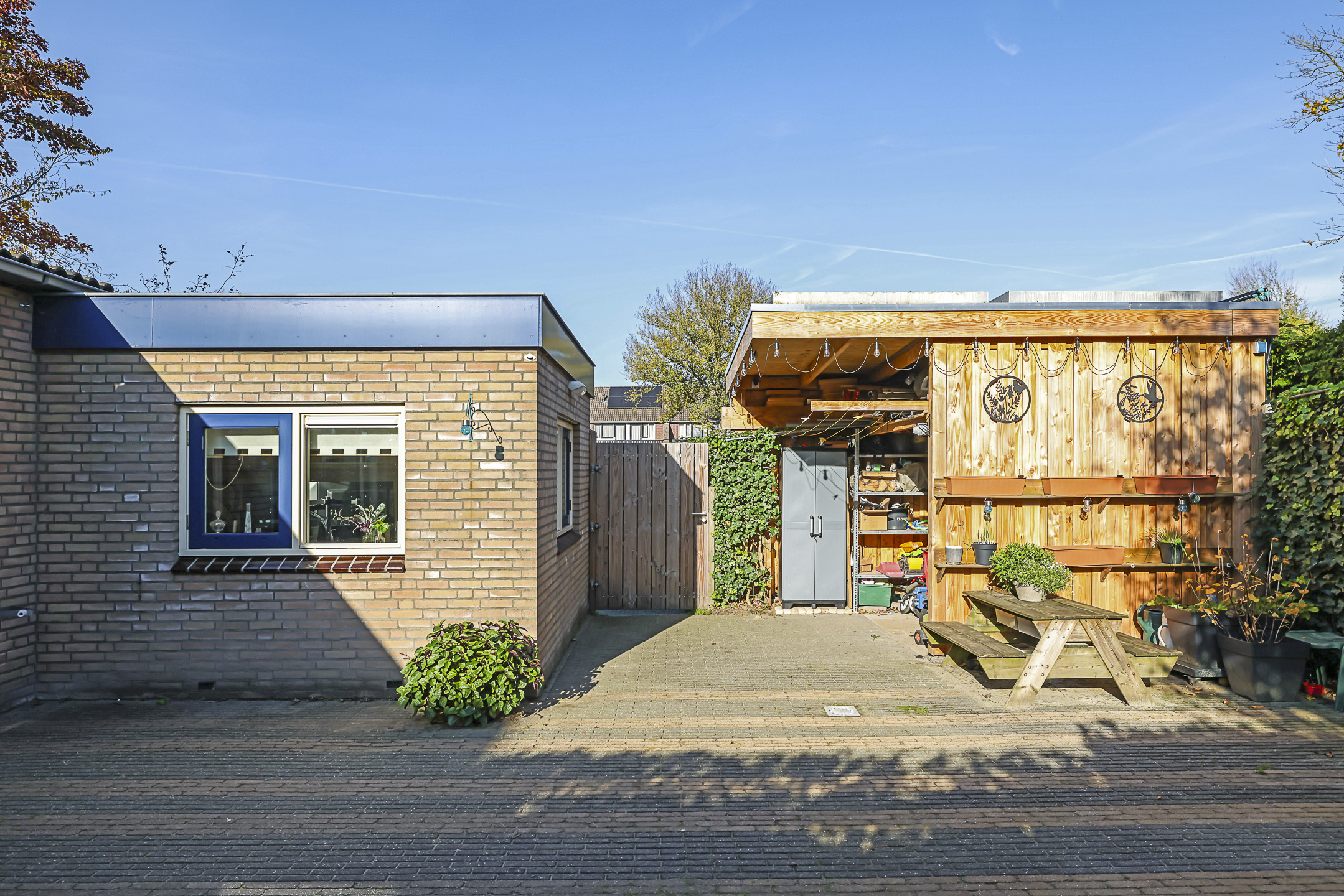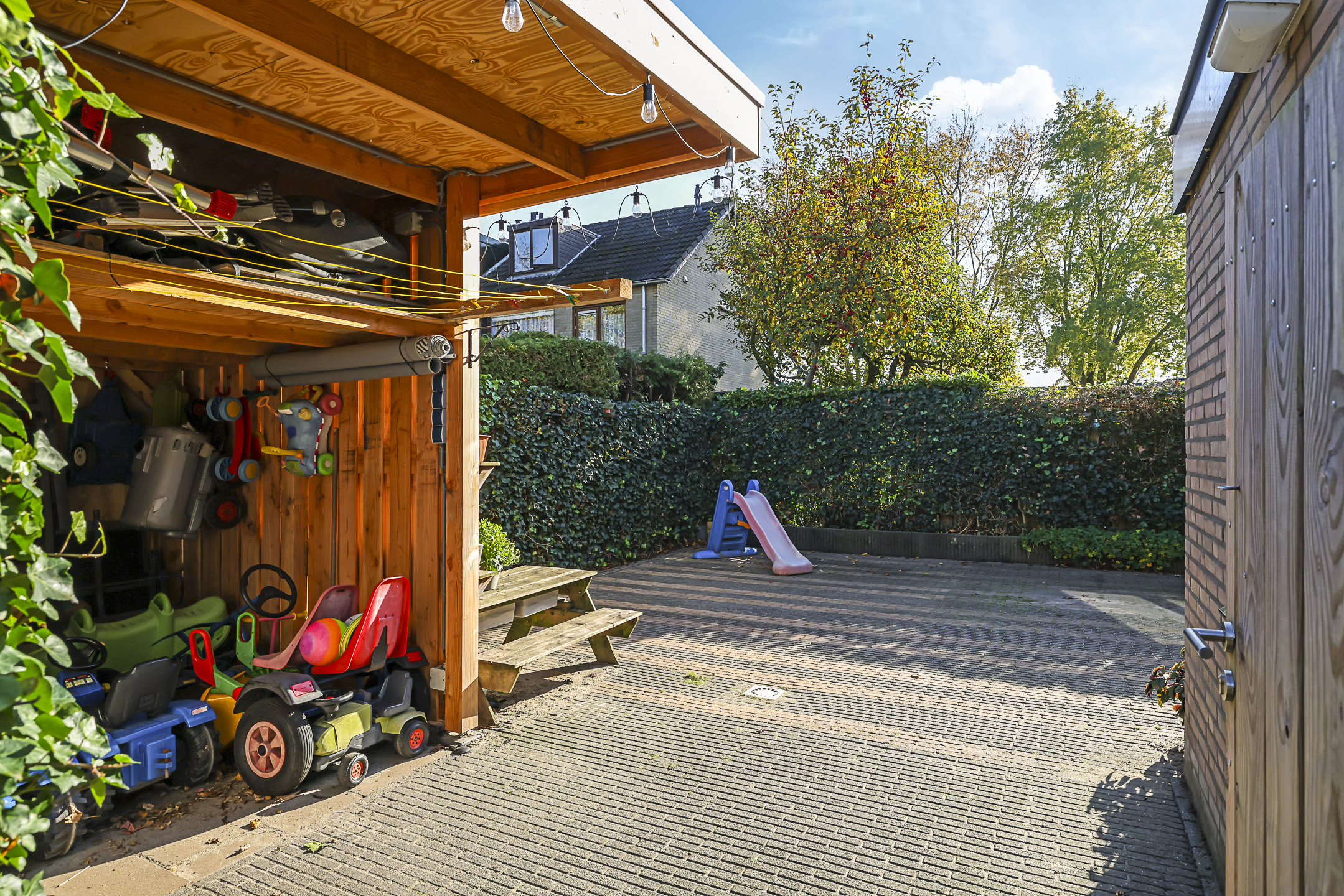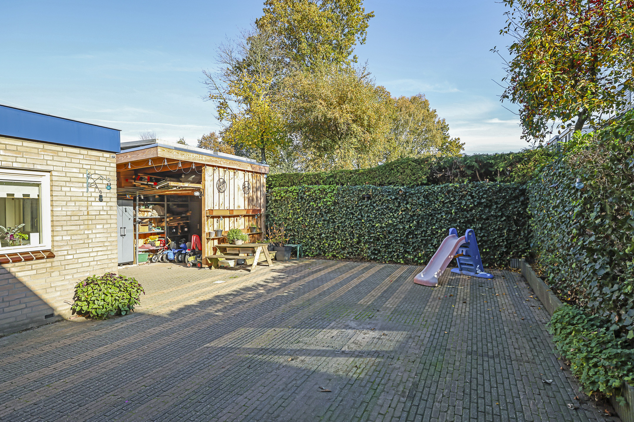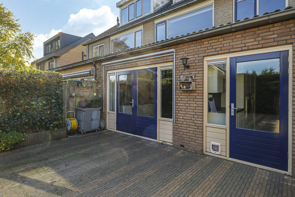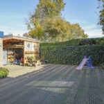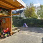 De achtertuin biedt een fijne buitenruimte voor wanneer je graag in de tuin zit. De tuin is onderhoudsarm aangelegd waarbij de erfafscheidingen voor een groen karakter zorgen. Doordat de tuin geheel bestraat is, kun je er met gemak een uitgebreide loungeset kwijt. Erg handig is de extra schuur die achter in de hoek is gebouwd. Deze is 10m2 groot en biedt veel ruimte voor het opbergen van een tuinset/kussens en buitenspeelgoed. Wanneer je deze schuur verder open maakt, zou je er ook eenvoudig een veranda van kunnen maken. Het bijgebouw staat in ieder geval gunstig op de zon.
