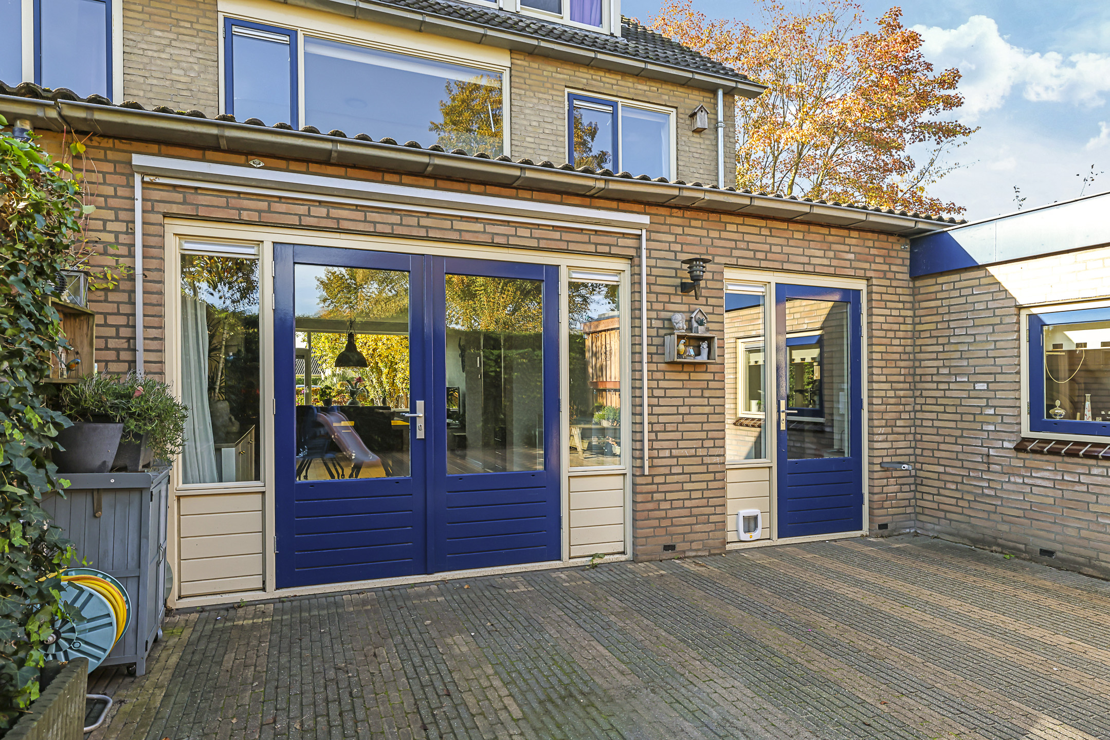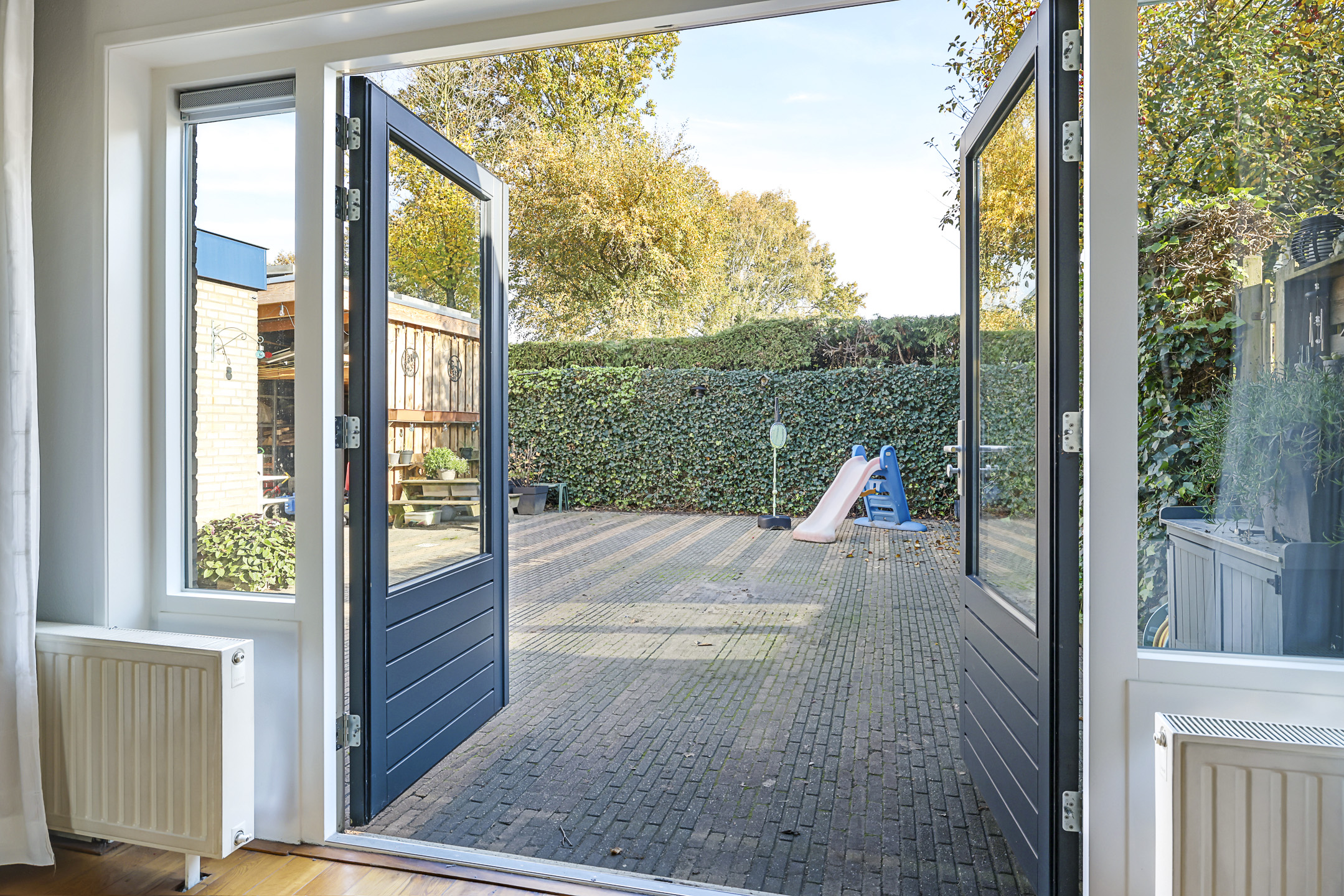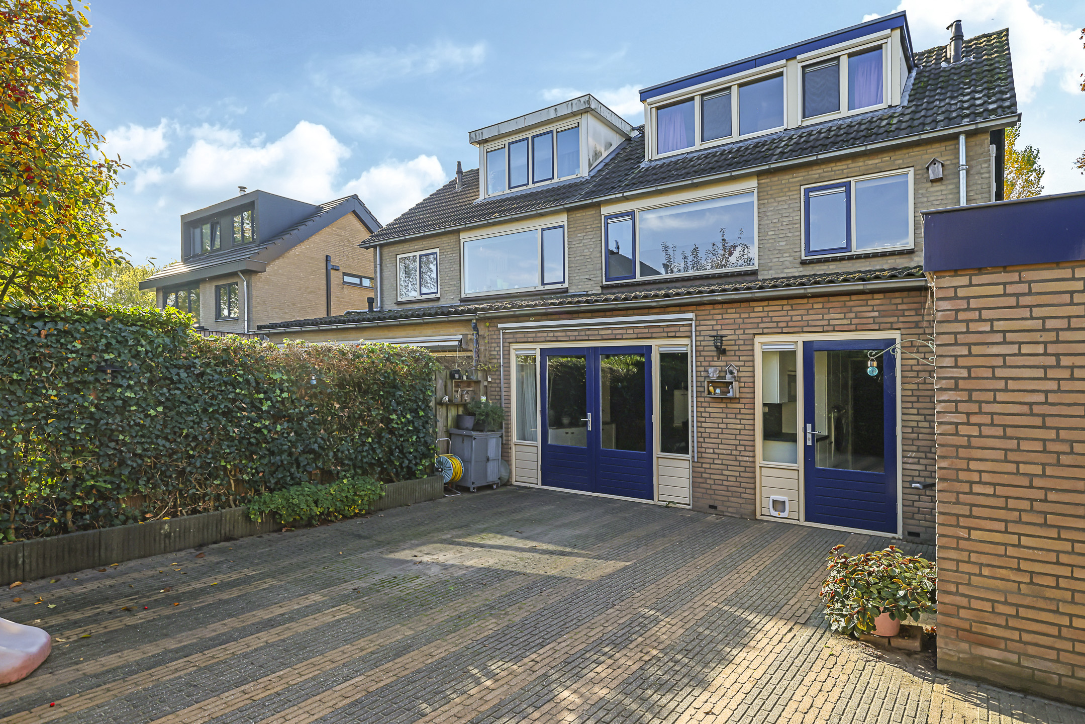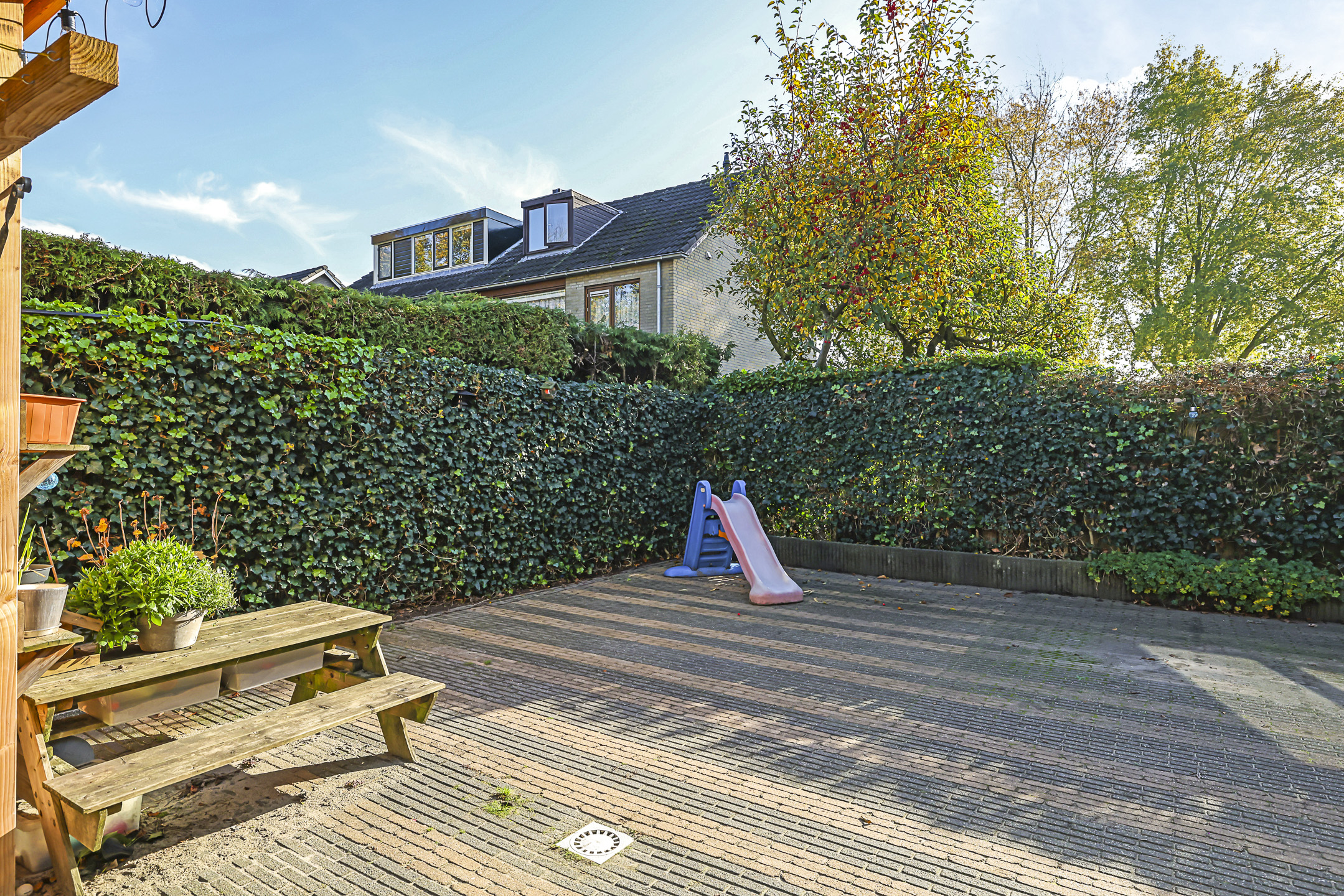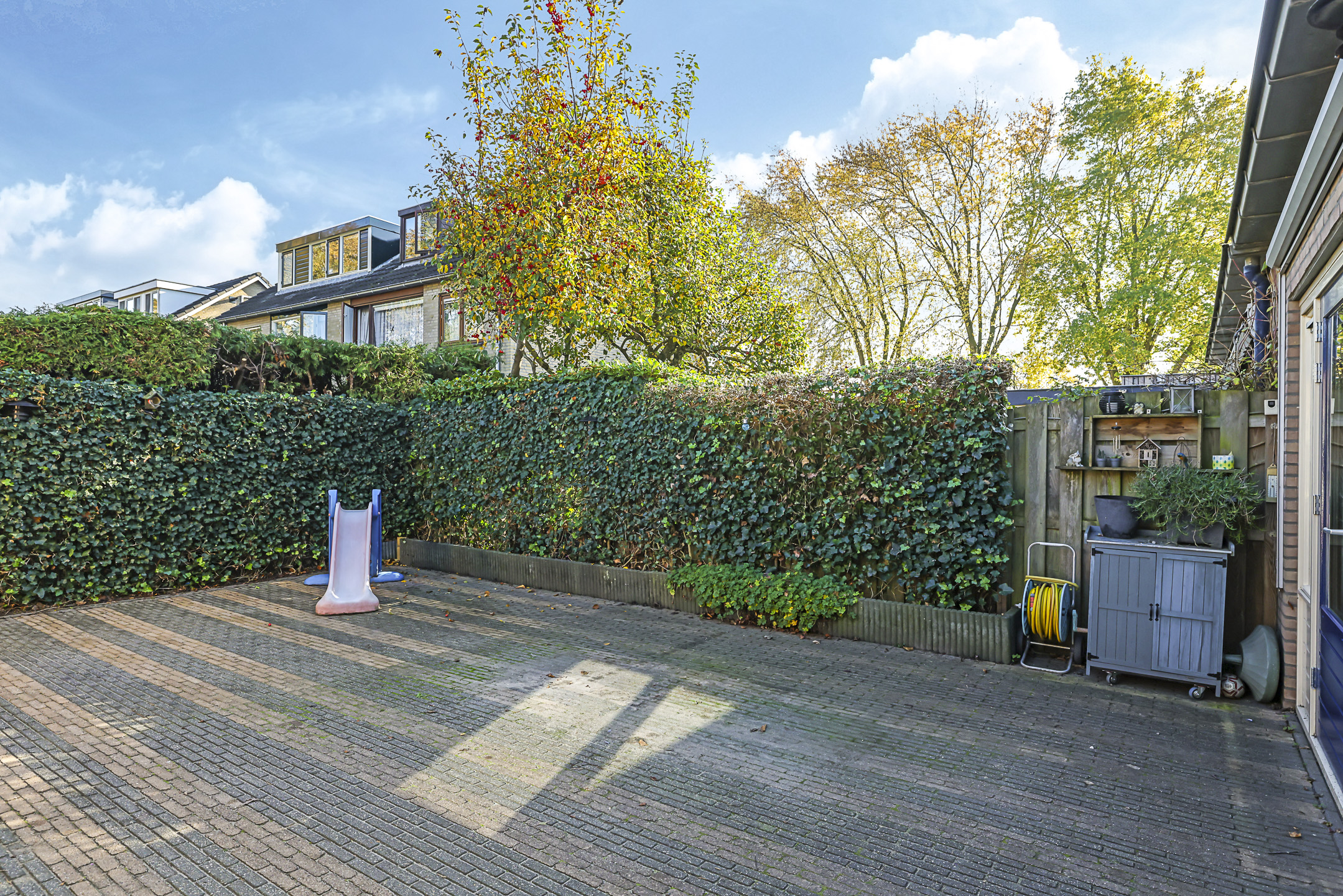 De achtertuin biedt een fijne buitenruimte voor wanneer je graag in de tuin zit. De tuin is onderhoudsarm aangelegd waarbij de erfafscheidingen voor een groen karakter zorgen. Doordat de tuin geheel bestraat is, kun je er met gemak een uitgebreide loungeset kwijt. Erg handig is de extra schuur die achter in de hoek is gebouwd. Deze is 10m2 groot en biedt veel ruimte voor het opbergen van een tuinset/kussens en buitenspeelgoed. Wanneer je deze schuur verder open maakt, zou je er ook eenvoudig een veranda van kunnen maken. Het bijgebouw staat in ieder geval gunstig op de zon.