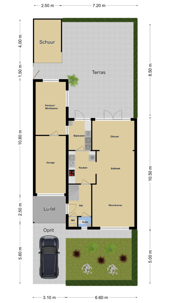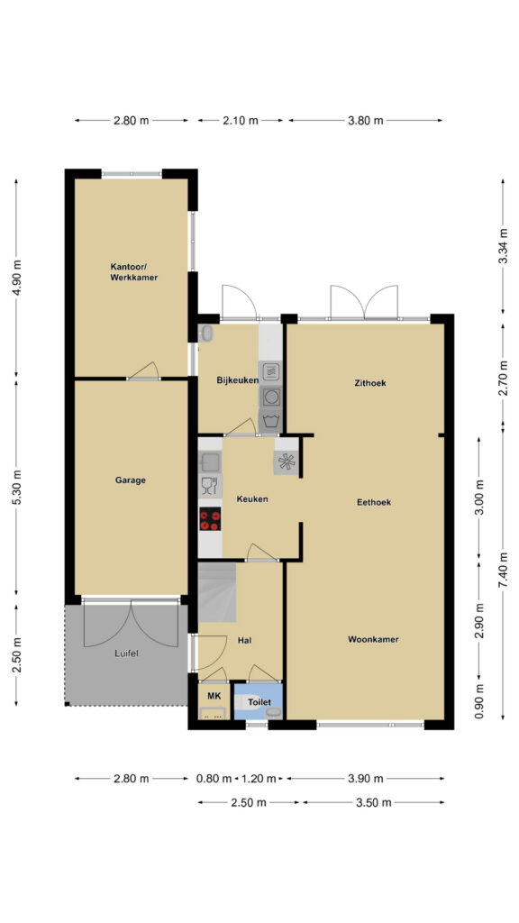 Vaak gaat een werkkamer op de begane grond ten koste van de garage, maar hier is dat niet het geval. De garage is nog steeds 5,3 meter lang (binnenmaat) en is de ideale stallingsruimte voor (elektrische) fietsen en/of een motor. Er zou dan nog steeds voldoende ruimte kunnen overblijven voor een werkbank.