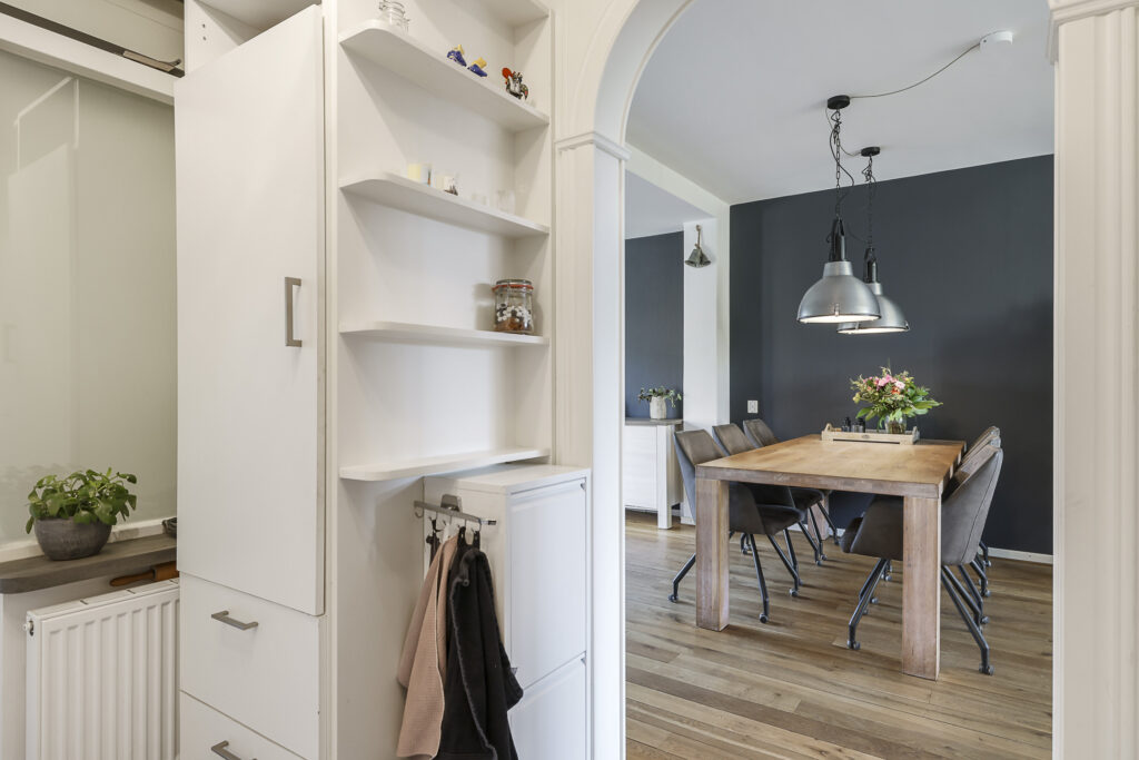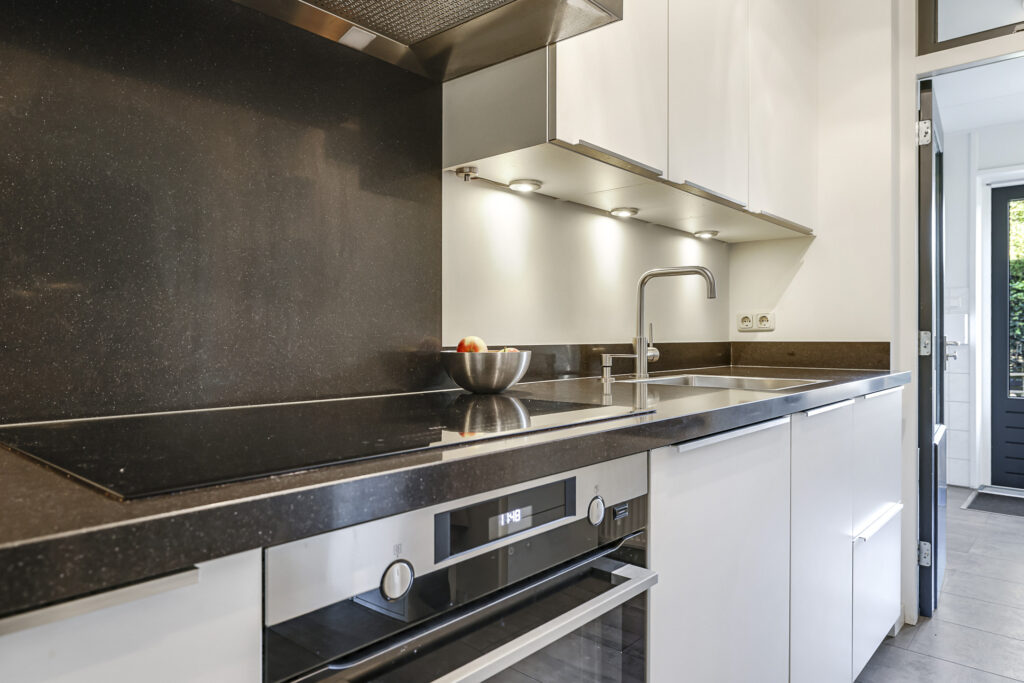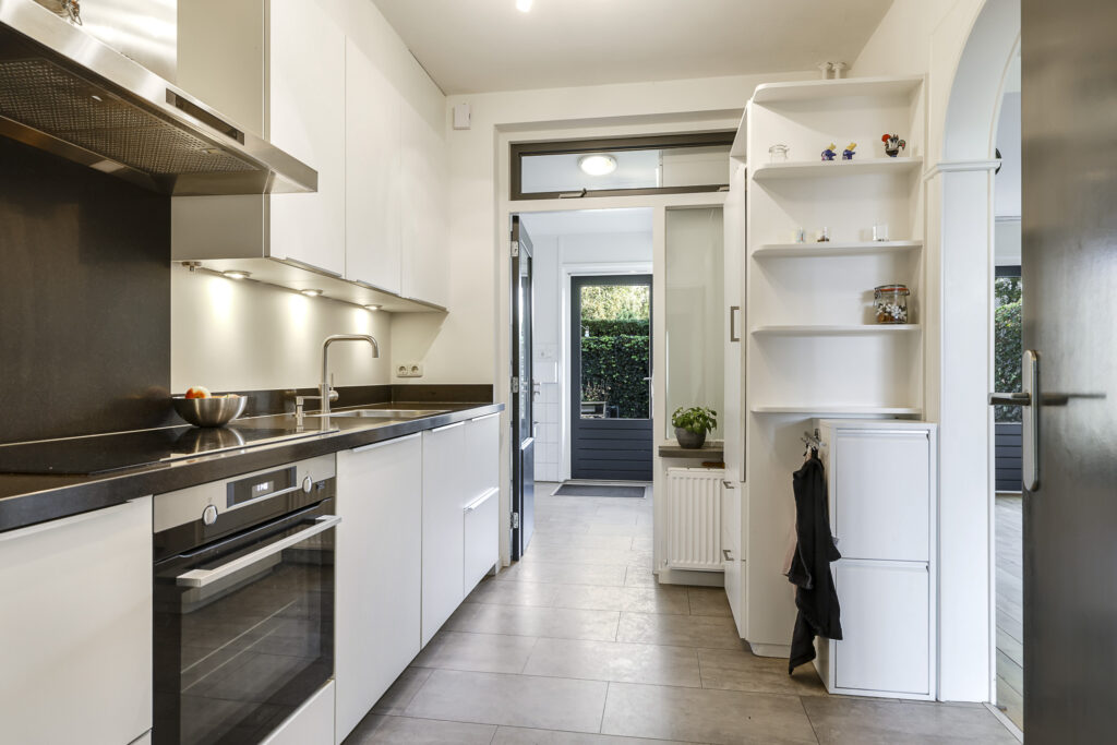In 2020 is er in deze woning een nieuwe keuken geplaatst. Het betreft een degelijke, neutrale keuken met mat witte fronten en strakke grepen. Het aanrechtblad is uitgevoerd in composiet en is net iets hoger en dieper dan normaal. Hierdoor heb je meer werkruimte op het aanrecht. De inbouwapparatuur bestaat uit een grote heteluchtoven, een vaatwasser met XXL-formaat en een brede inductie kookplaat met afzuigschouw erboven. Tegenover de nieuwe keukenopstelling is nog een koelkast ingebouwd. Erg handig is de originele inbouwkast waar je onder meer je servies kunt opbergen. Mocht je de keuken optisch ruimtelijker en lichter willen maken, dan zou je de muur tussen de woonkamer en keuken door middel van het plaatsen van een draagbalk kunnen openbreken.