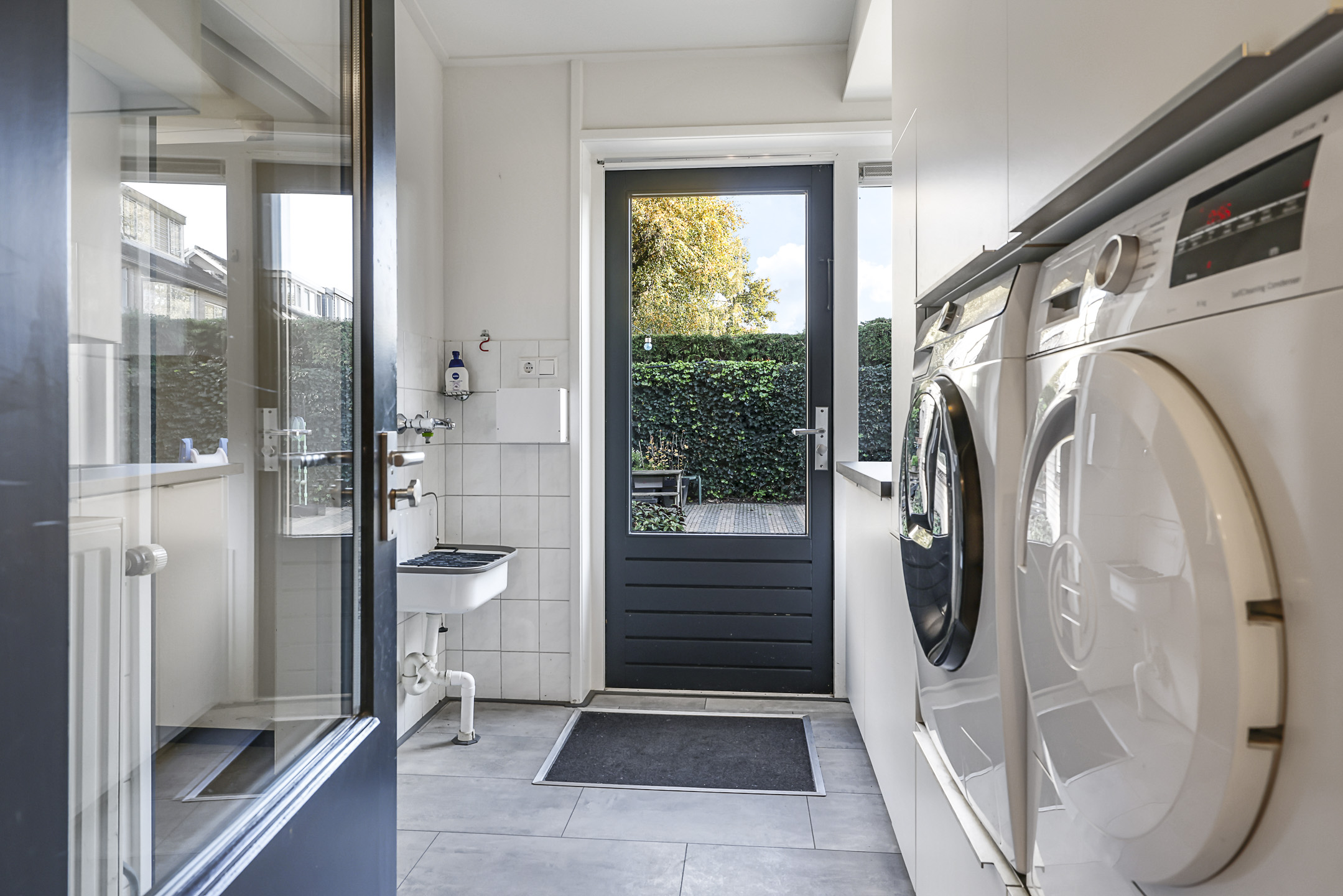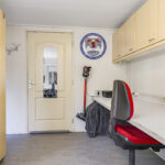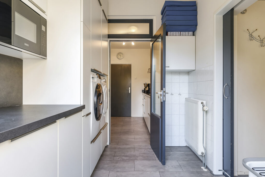 Vanuit de keuken loop je de bijkeuken in, welke is gecreëerd door de aanbouw. Deze bijkeuken is erg praktisch omdat er een 2e keukenopstelling c.q. wastoren is geplaatst die je als het verlengde van je keuken mag zien (zelfde stijl). Het heeft namelijk een aanrecht, een apothekerskast en er is zelfs een magnetron ingebouwd. Tevens kun je hier de wasmachine en wasdroger op hoogte ‘inbouwen’. Verder is er extra kastruimte waardoor je hier ook schoonmaakspullen en voorraad kunt opbergen. In de andere hoek is er nog een gootsteen aanwezig. Vanuit deze bijkeuken loop je niet alleen de achtertuin in, maar er is ook een doorloop naar de aangebouwde ‘kantoorruimte’ en inpandige garage.