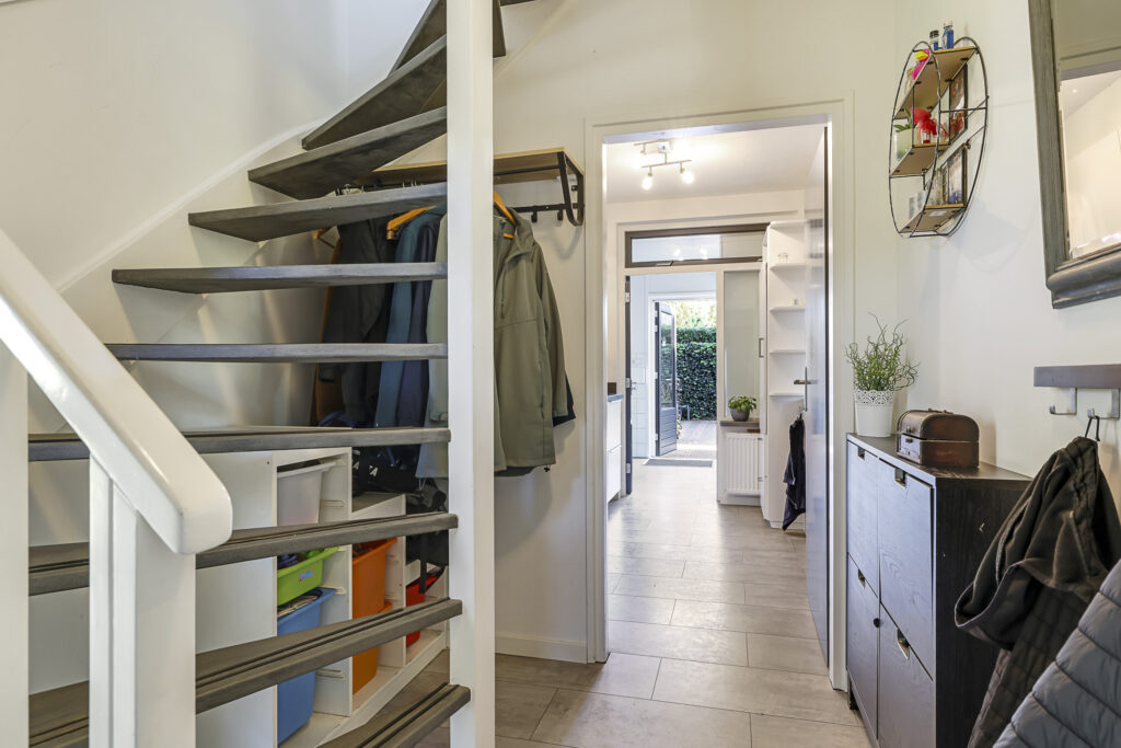 Hal/entree met toilet, diepe meterkast met schappen, garderobe en trapopgang