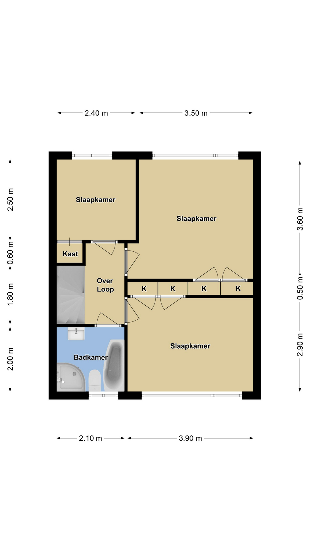 Deze woonlaag is ingedeeld met 3 slaapkamers en de badkamer. De slaapkamers zijn respectievelijk 14m2, 12m2 en 6m2 groot. Met name de grootste slaapkamers zijn goed bemeten, hetgeen ook komt doordat deze woning een mooie breedtemaat heeft. Hierdoor heb je veel ruimte om je bed heen. Bovendien heeft elke slaapkamer wel 1 of 2 vaste inbouwkasten waardoor extra linnenkasten wellicht overbodig worden. Erg handig zijn de draairamen die voorzien zijn van rolhorren. Zo krijgen insecten geen kans. Tevens heeft elke slaapkamer een eigen airco-unit. De slaapkamer aan de voorzijde heeft ook nog een rolluik (elektrisch bedienbaar) waardoor je deze kamer geheel kunt verduisteren.