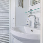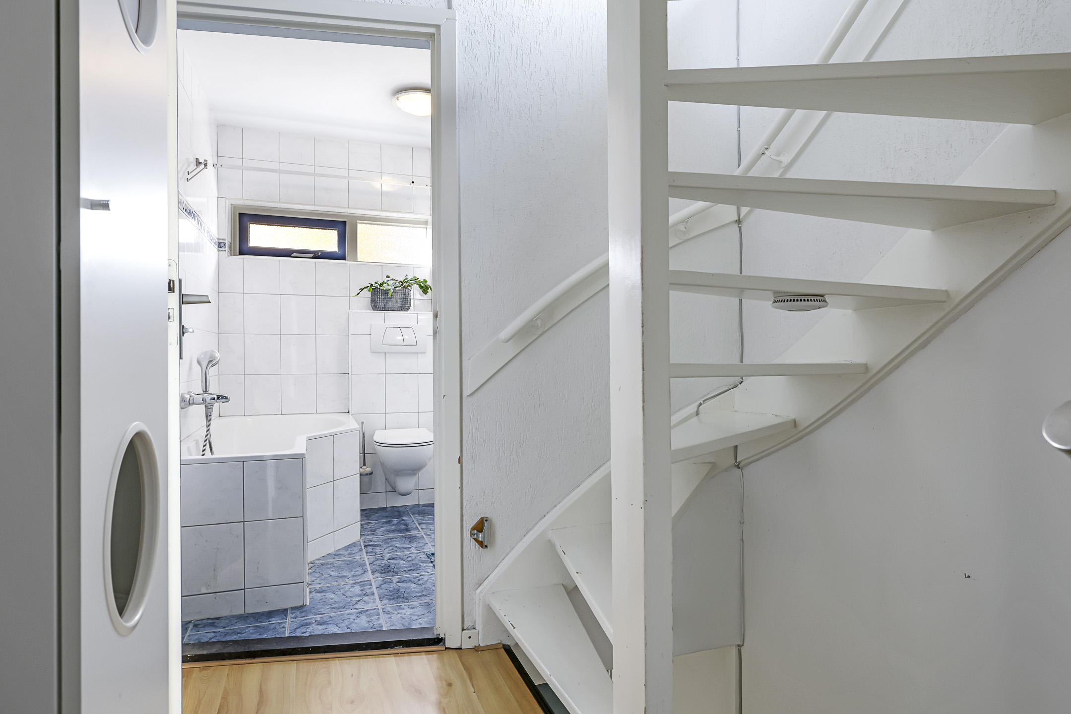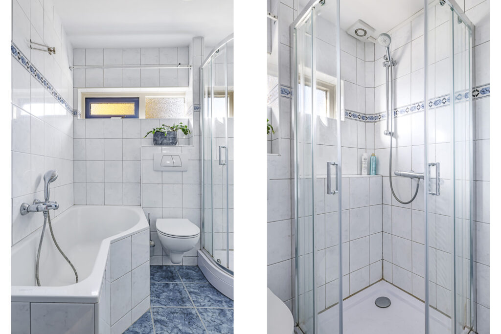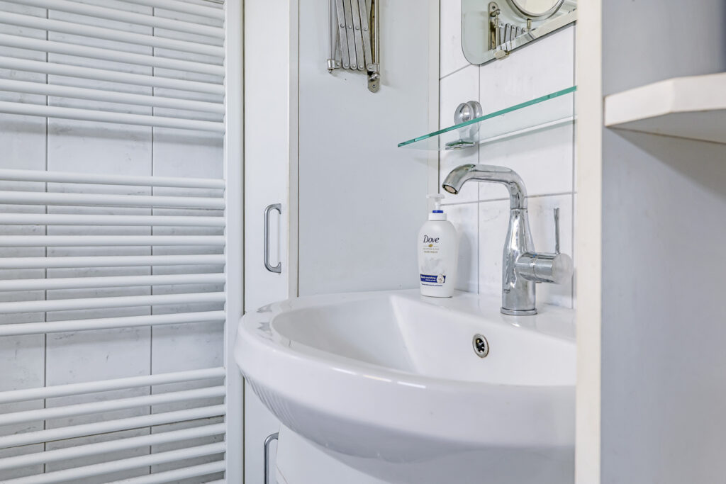 De badkamer is net even iets ouder dan de rest van de woning, maar is wel compleet ingericht met alle het wenselijke sanitair. Dus met zowel een ligbad als een douchecel. Het wastafelmeubel biedt naast een spiegel en een planchet, ook een kolomkast waar je de nodige toiletspullen kunt opbergen. En uiteraard ontbreekt het 2e (zwevend) toilet niet. Een handdoekradiator maakt deze badkamer compleet. En niet te vergeten het uitzetraam. Dit levert niet alleen daglicht op, maar je kunt ook goed ventileren.