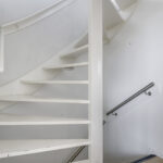Via de hal en een open trapopgang met rvs-trapleuningen komen we op de 1e verdieping terecht. Wat daarbij opvalt is de lichtinval op de overloop, hetgeen wordt gecreëerd door het aanwezige zijgevelraam.
