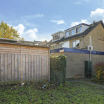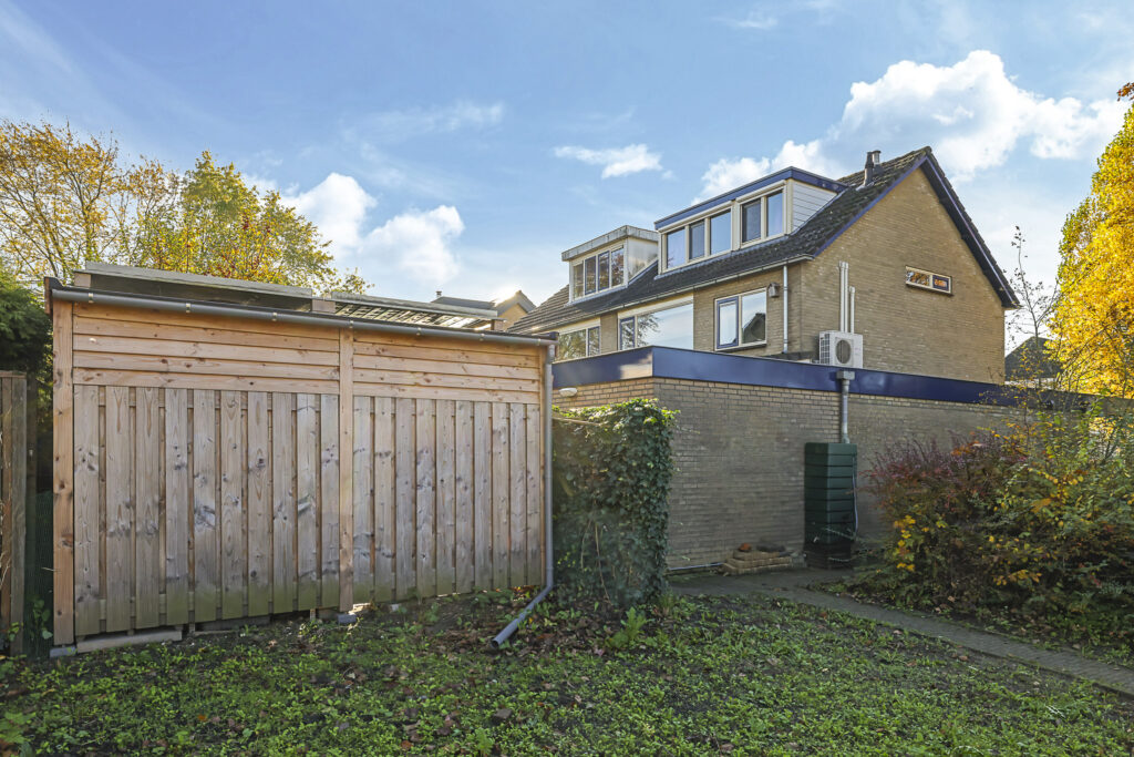 De achtertuin heeft een mooi vierkant formaat en is bijna 10 meter breed. De tuin is onderhoudsarm aangelegd en geniet relatief veel vrijheid en privacy omdat er geen directe achterburen zijn. Er is een houten schuur aanwezig evenals een poort (achterom) waardoor je eenvoudig in de achtertuin kunt komen.